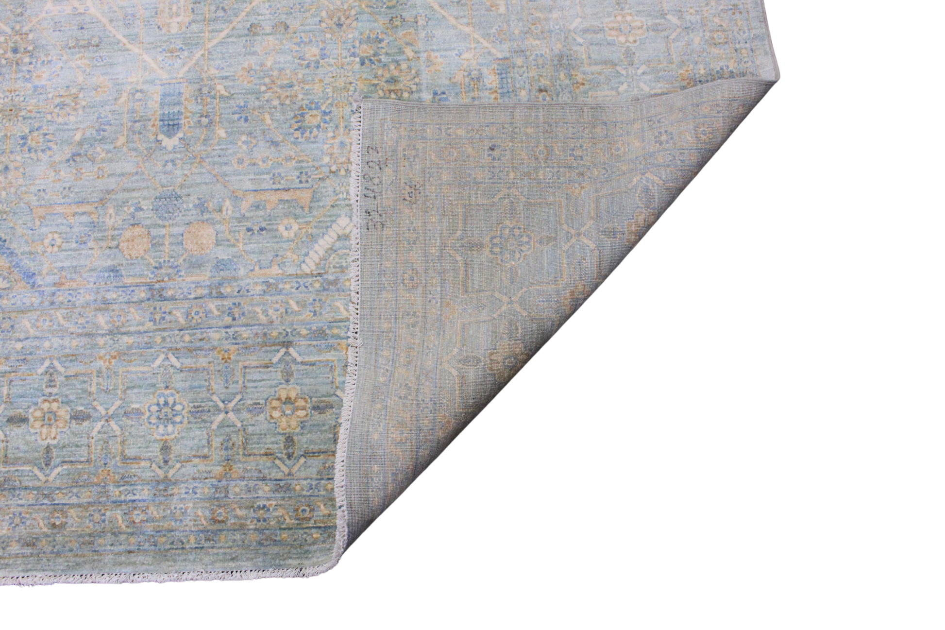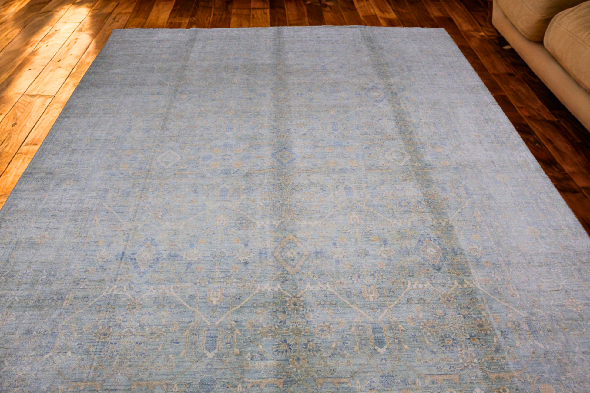 Understated yet intricate, this Ariana rug from Afghanistan (8.8 × 11.7 ft) is a masterclass in quiet refinement. With its delicately woven lattice of diamond motifs, angular medallions, and floral traces, the rug exudes a sense of geometric harmony without overpowering the space. Its tightly balanced pattern is layered across a washed aqua and soft ivory field, softened by gentle abrash that adds dimension and texture.
