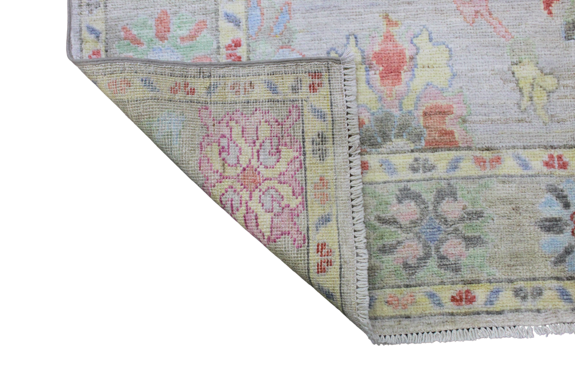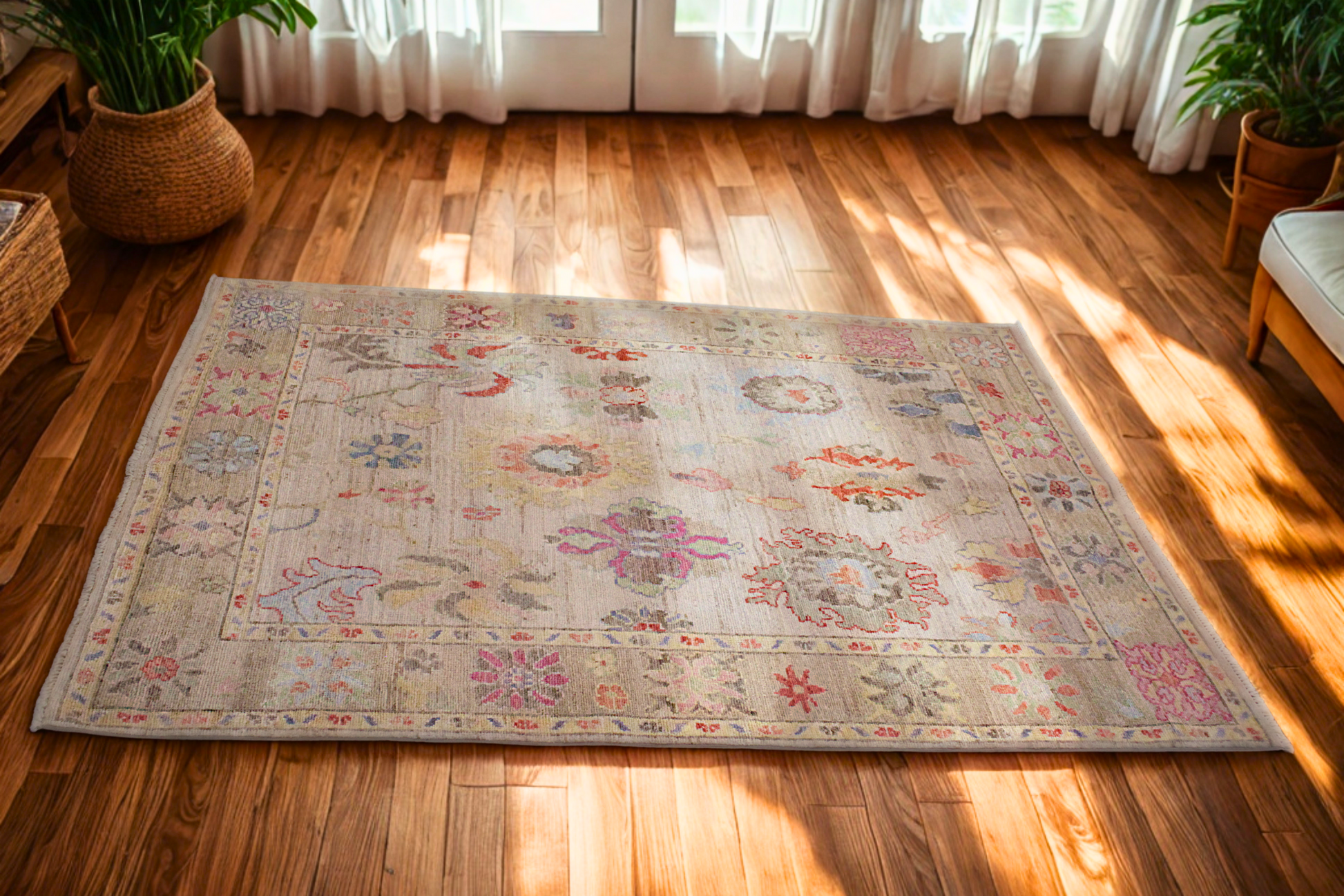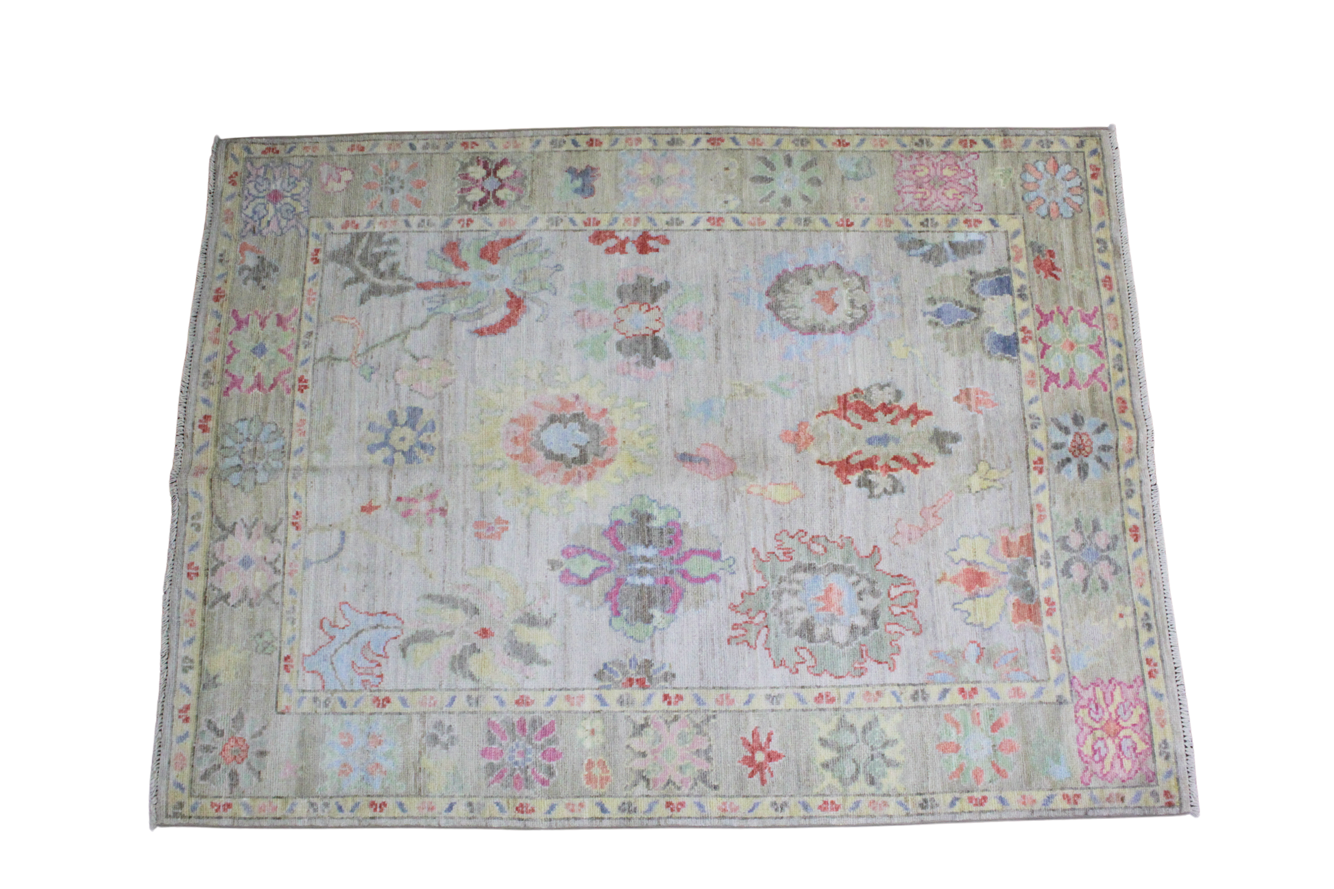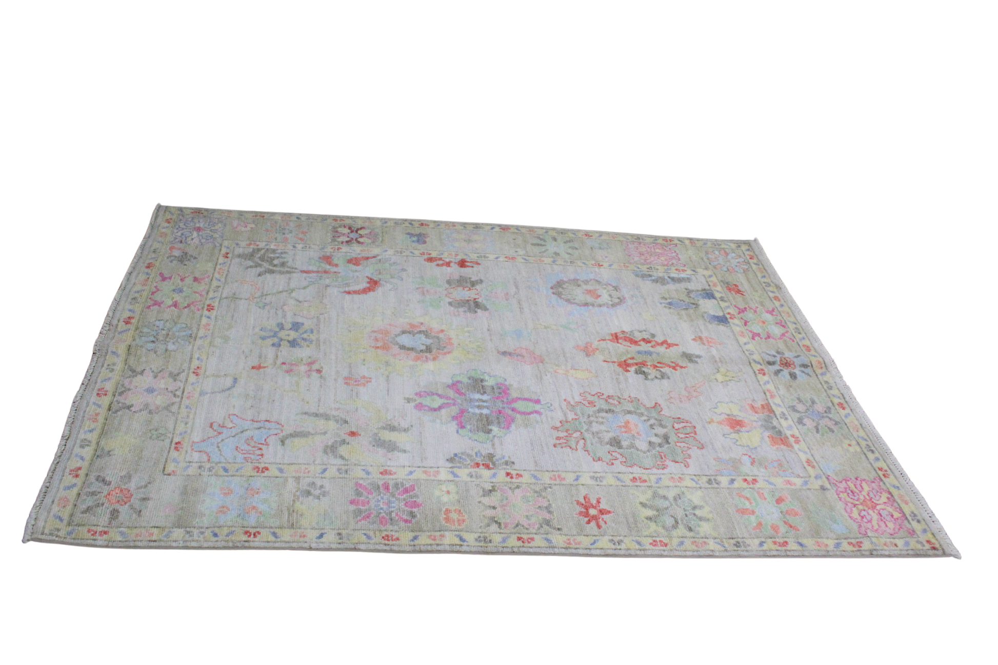 Rug 1014 is a 5.1 x 6.9 hand-knotted Oushak rug from Afghanistan, offering a whimsical take on traditional elegance. Set against a light, neutral field, the rug features playful floral and botanical motifs in soft shades of coral, lavender, lemon, sky blue, mint, and rose. The wide border frames the composition with alternating blocks of stylized blossoms, contributing to its lighthearted charm and subtle structure.