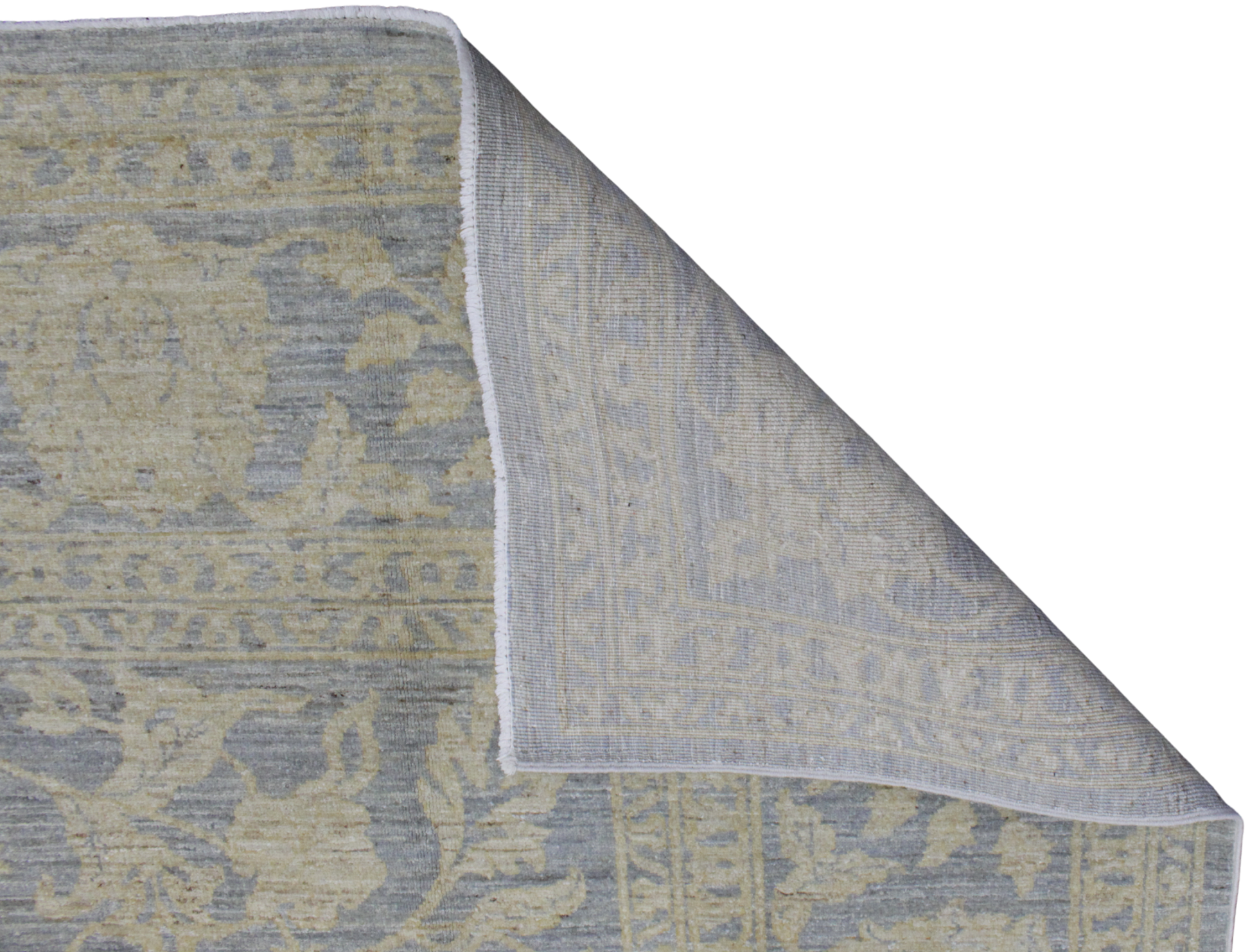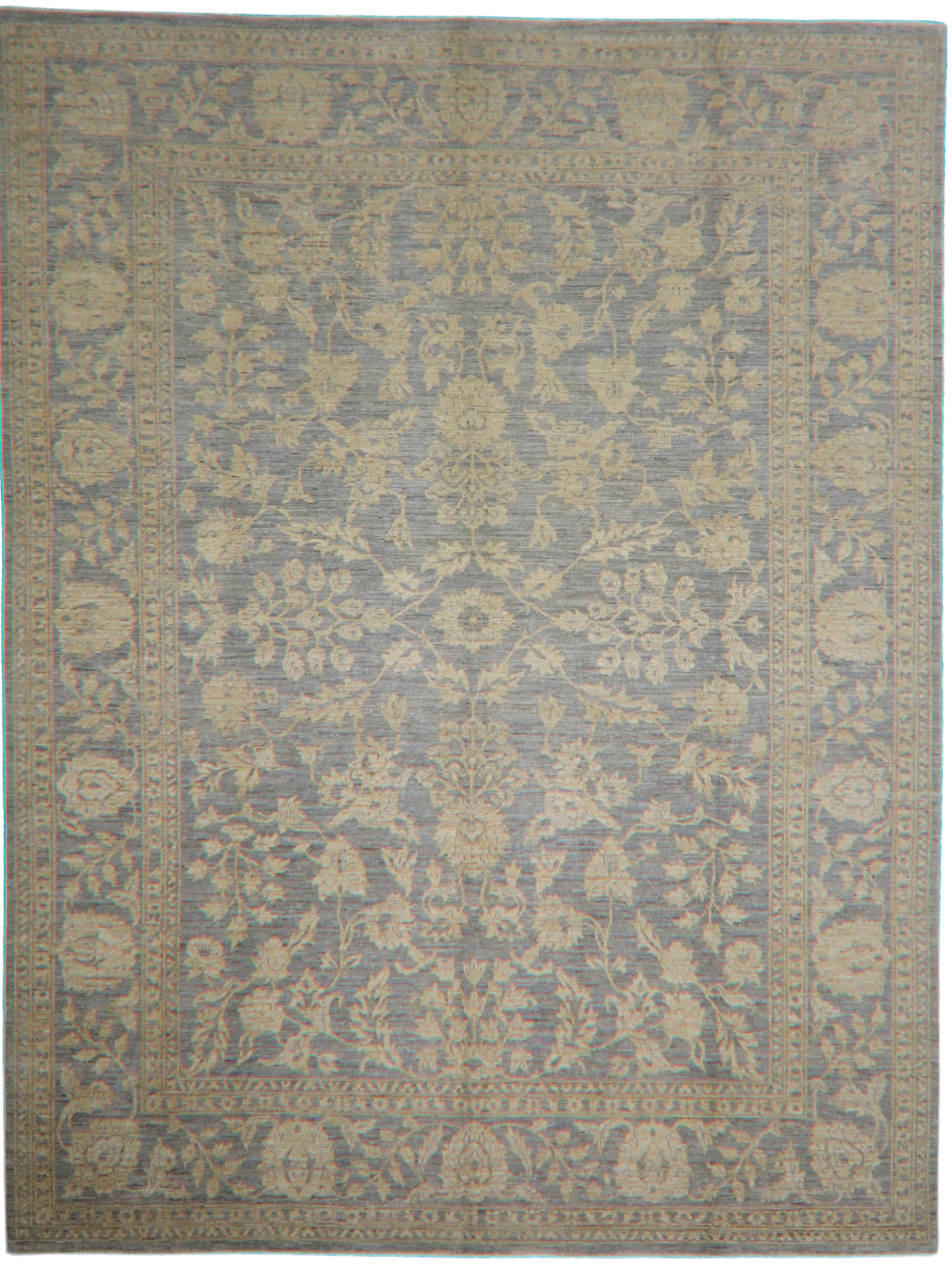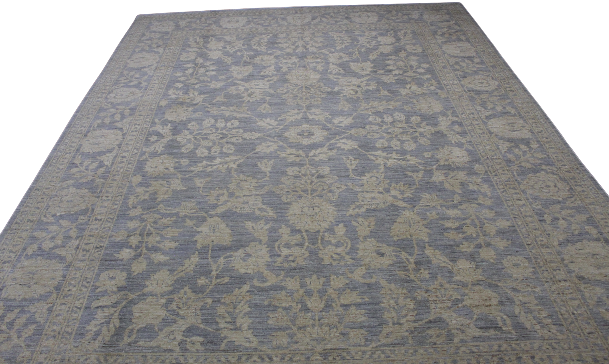 Graceful and quietly elegant, this hand-knotted Oushak rug from Pakistan (8.10 × 11.7 ft) is a study in botanical refinement. Its misty slate-blue field sets the tone for a soft, floral composition rendered in pale gold and parchment hues. Stylized vines, blossoms, and palmettes dance across the surface with the lightness of a garden in bloom, framed by a wide decorative border that echoes the same graceful motifs.