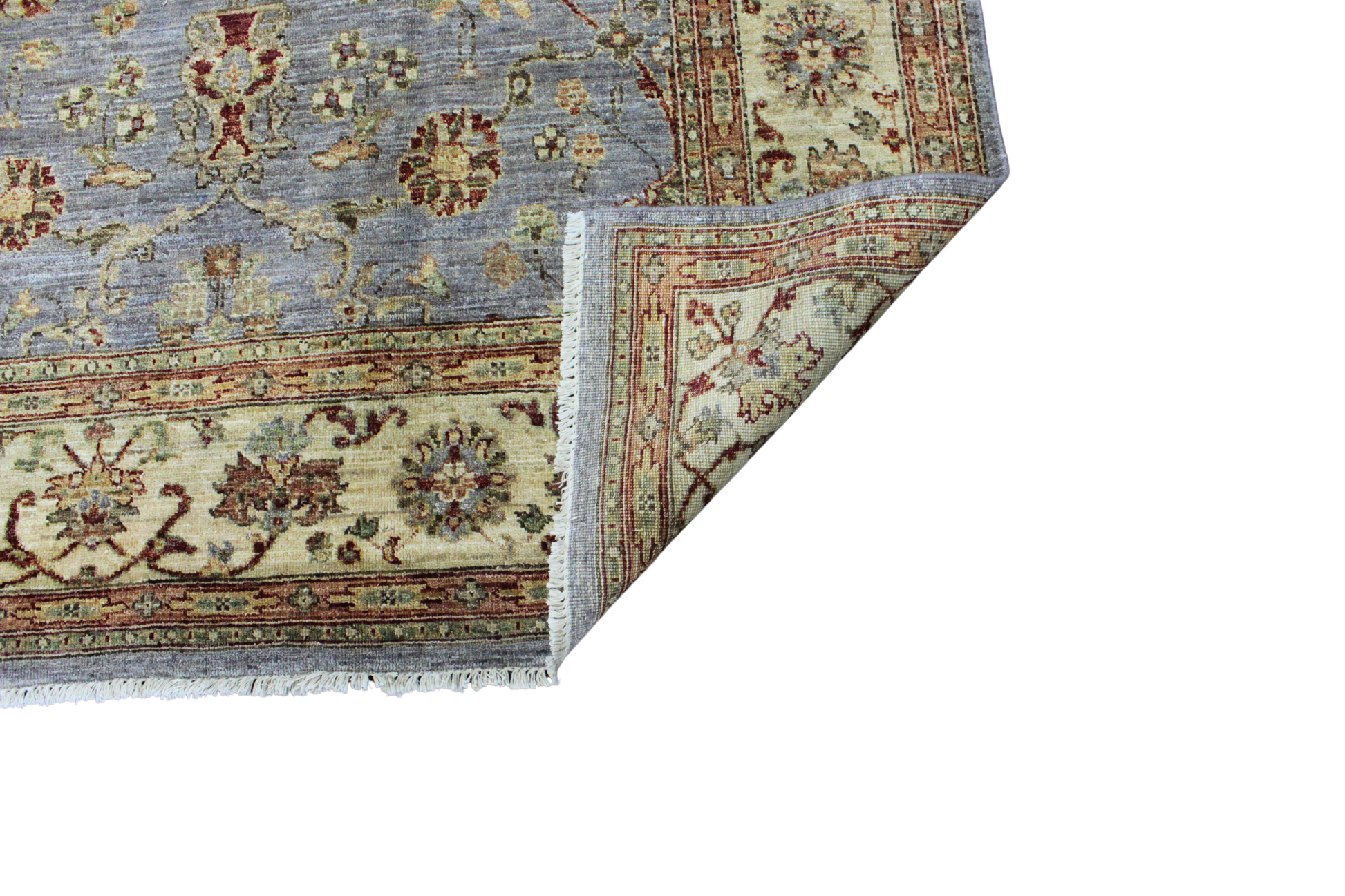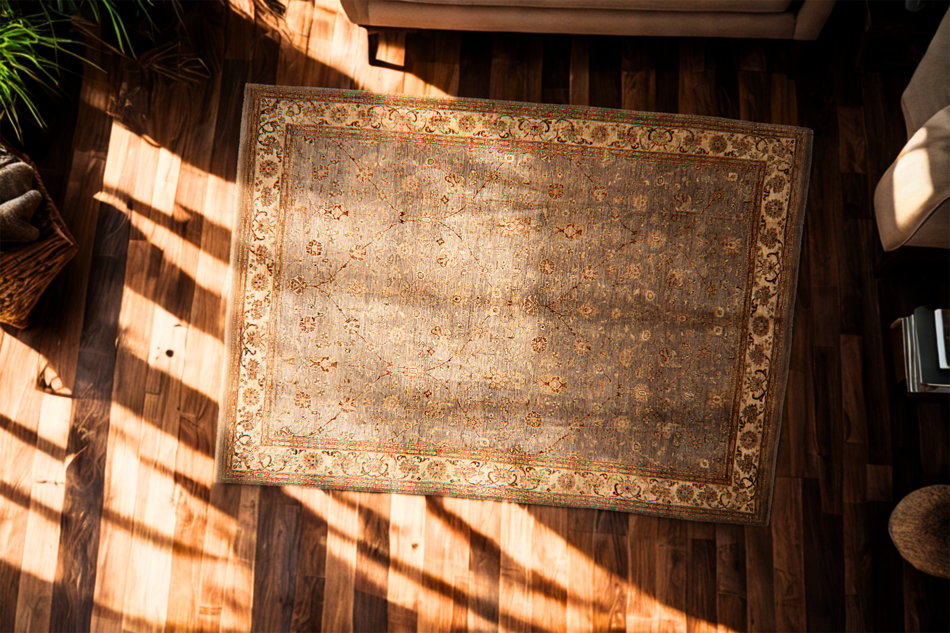 The ivory border, detailed with scrolling vines and palmettes, provides contrast and structure, framing the field with a formal finish. Its palette is moody yet harmonious — ideal for grounding a sophisticated space in color and tradition without overwhelming it.