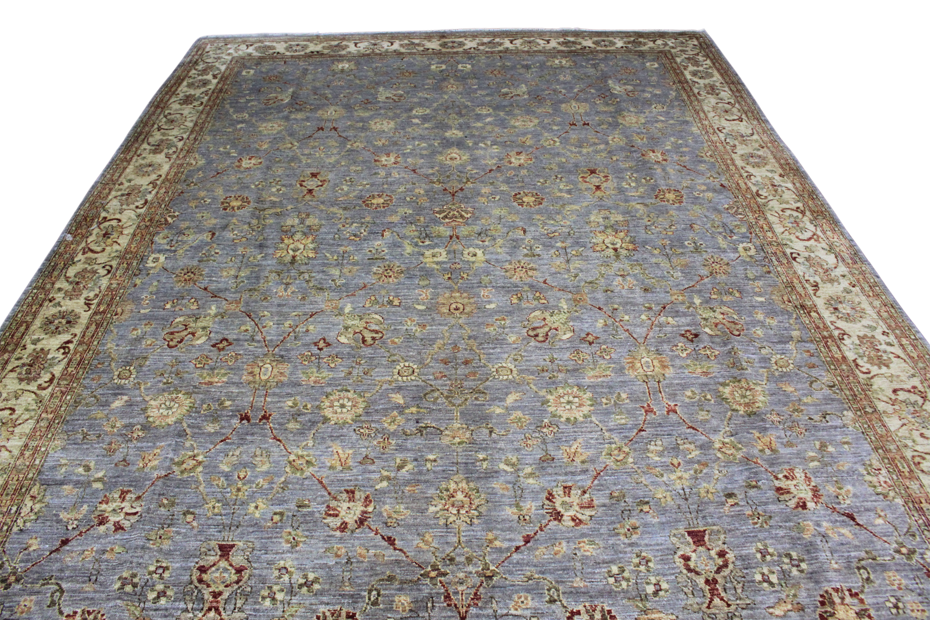 Elegant and richly atmospheric, this Pakistani Oushak rug (8.11 × 12.5 ft) presents a refined interplay of depth and delicacy. The slate blue field, softly weathered, is adorned with a graceful allover lattice of rosettes and stylized florals in golden beige, rust, and ivory. The fine vinework connecting the motifs gives it a sense of movement and flow, like flowers strung across a twilight sky.