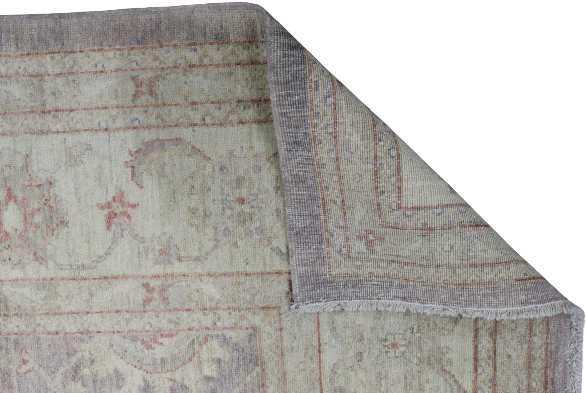 The generous floral border encircles the field with a soft, structured rhythm, offering a refined contrast that gently anchors the design. Hand-knotted with care in wool, this piece brings understated elegance and heritage charm to living rooms, dining areas, or serene bedrooms seeking character without overwhelming color.