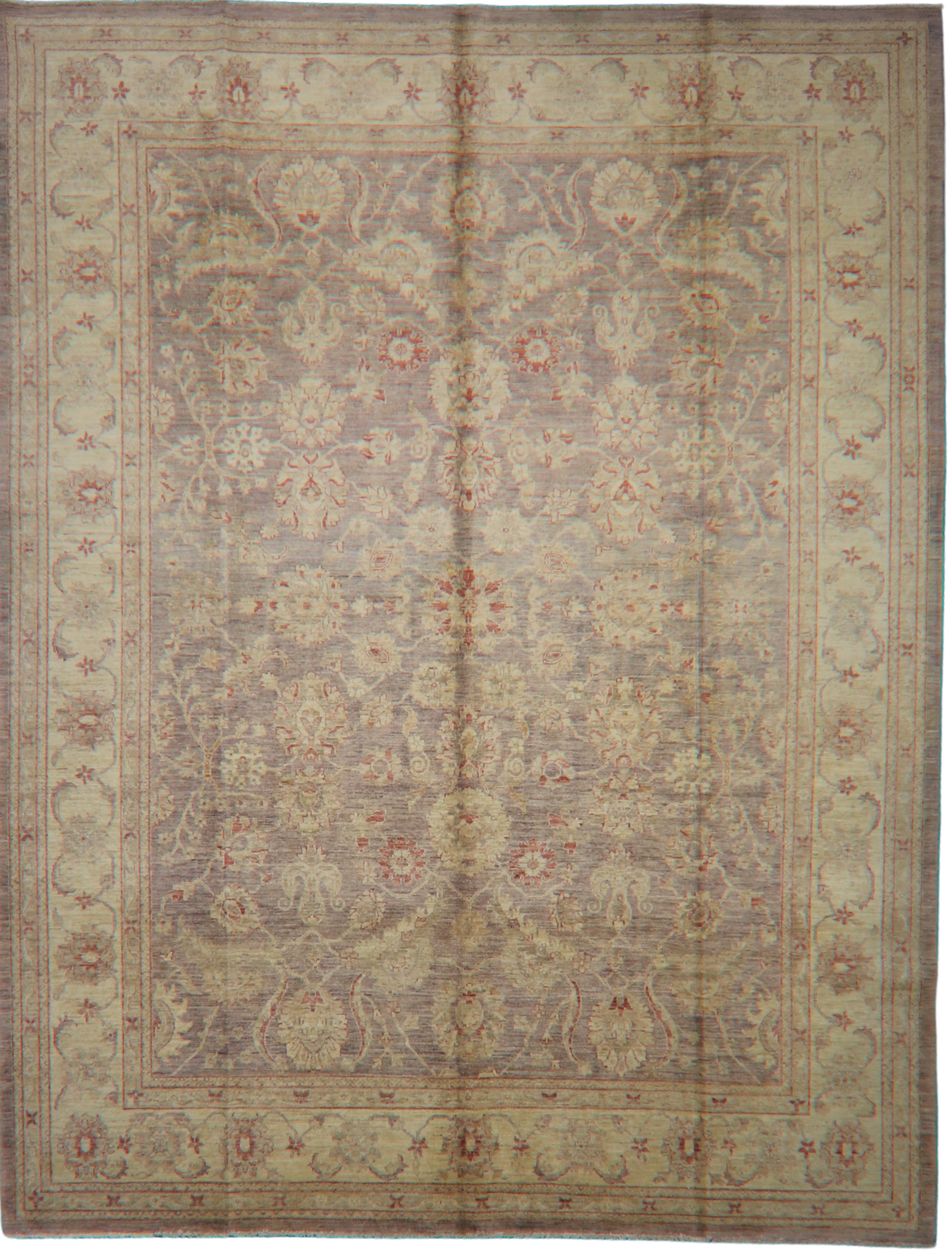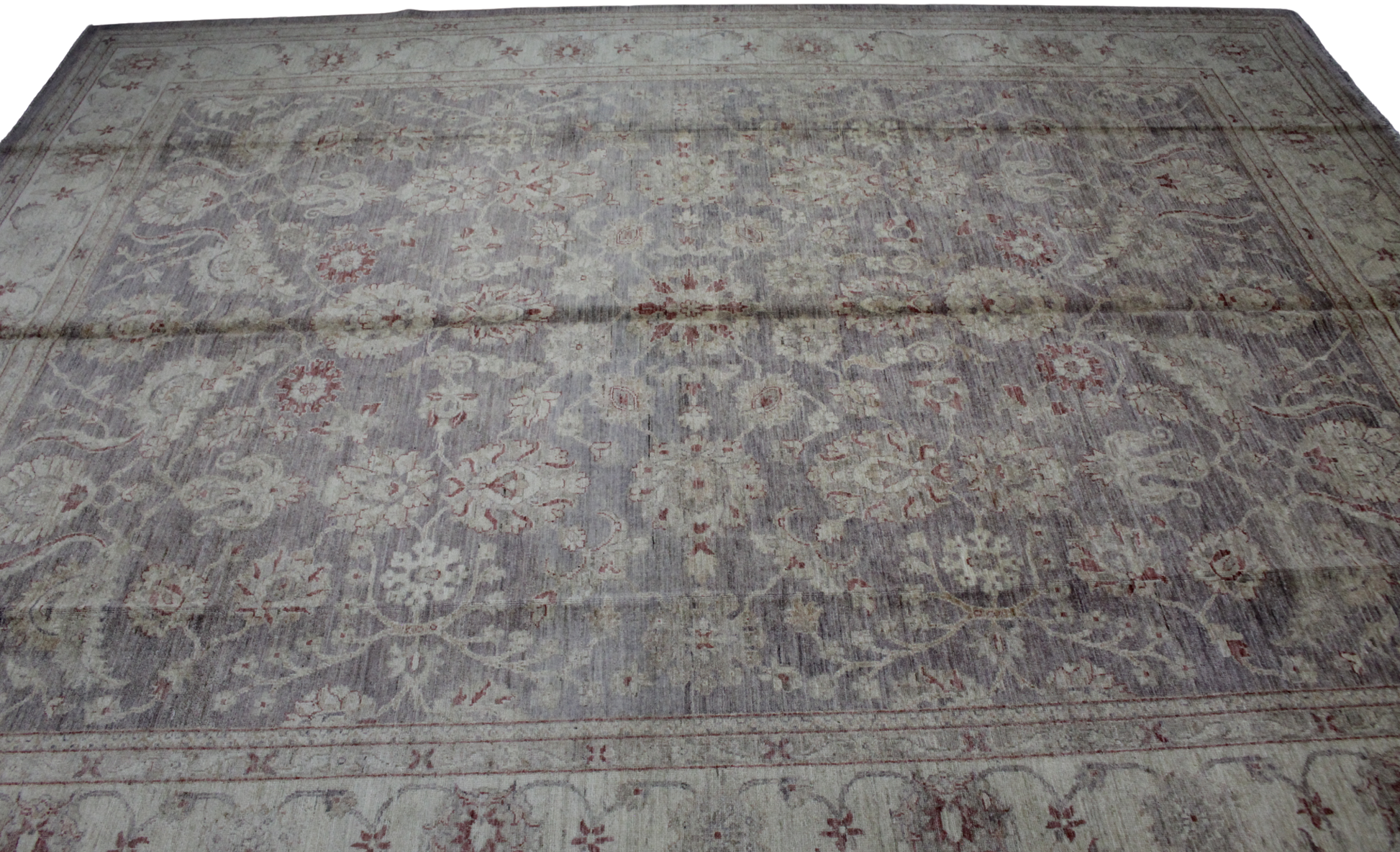 Rich with antique charm and subdued sophistication, this 8.10 × 11.7 ft Oushak rug from Pakistan evokes the enduring beauty of classical design through a soft, time-worn palette. The weathered slate-gray field is laced with finely drawn palmettes, rosettes, and vinery — all woven in delicate tones of sandstone, coral, and faded gold. Each element appears gently veiled, as if filtered through generations of sun and story.