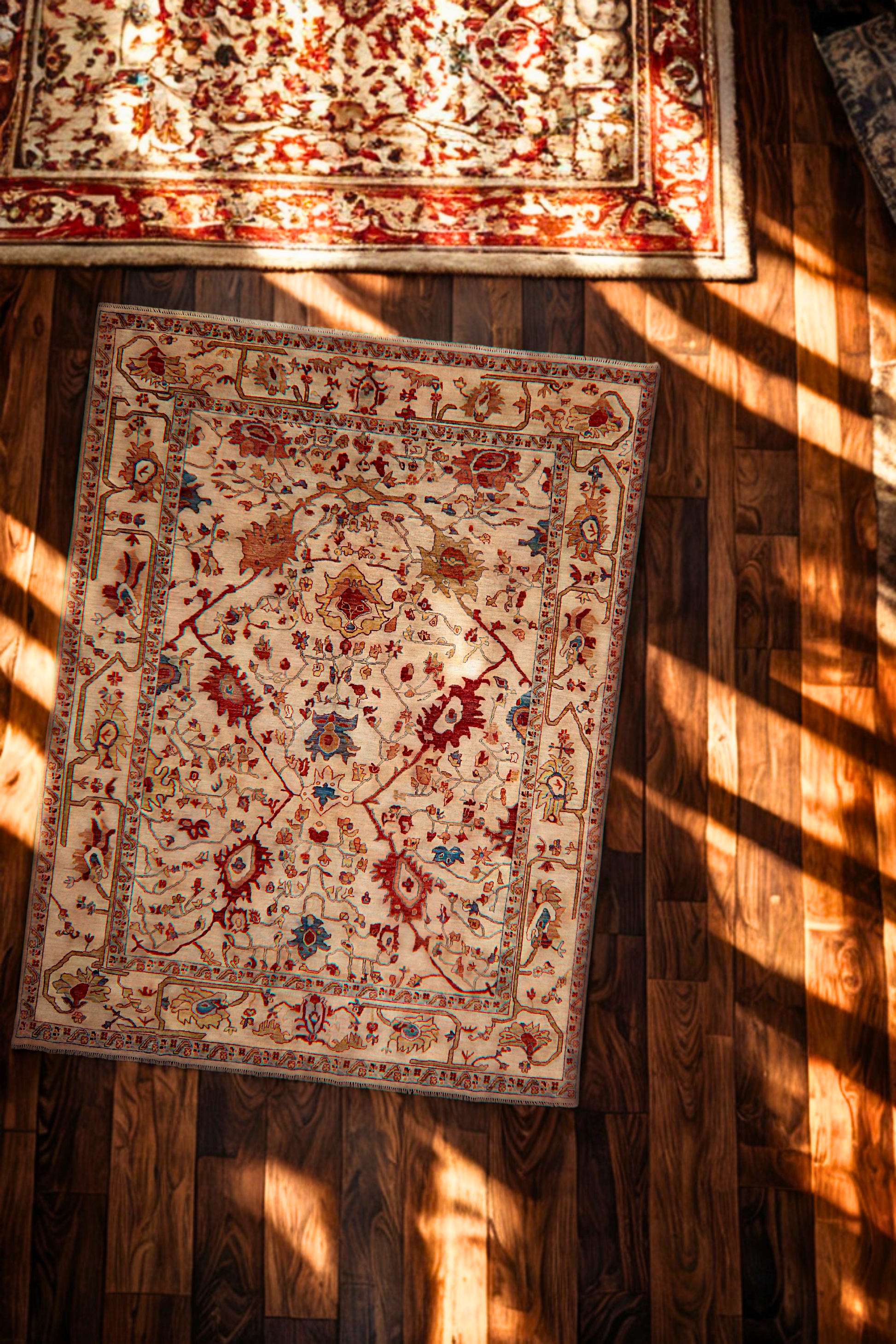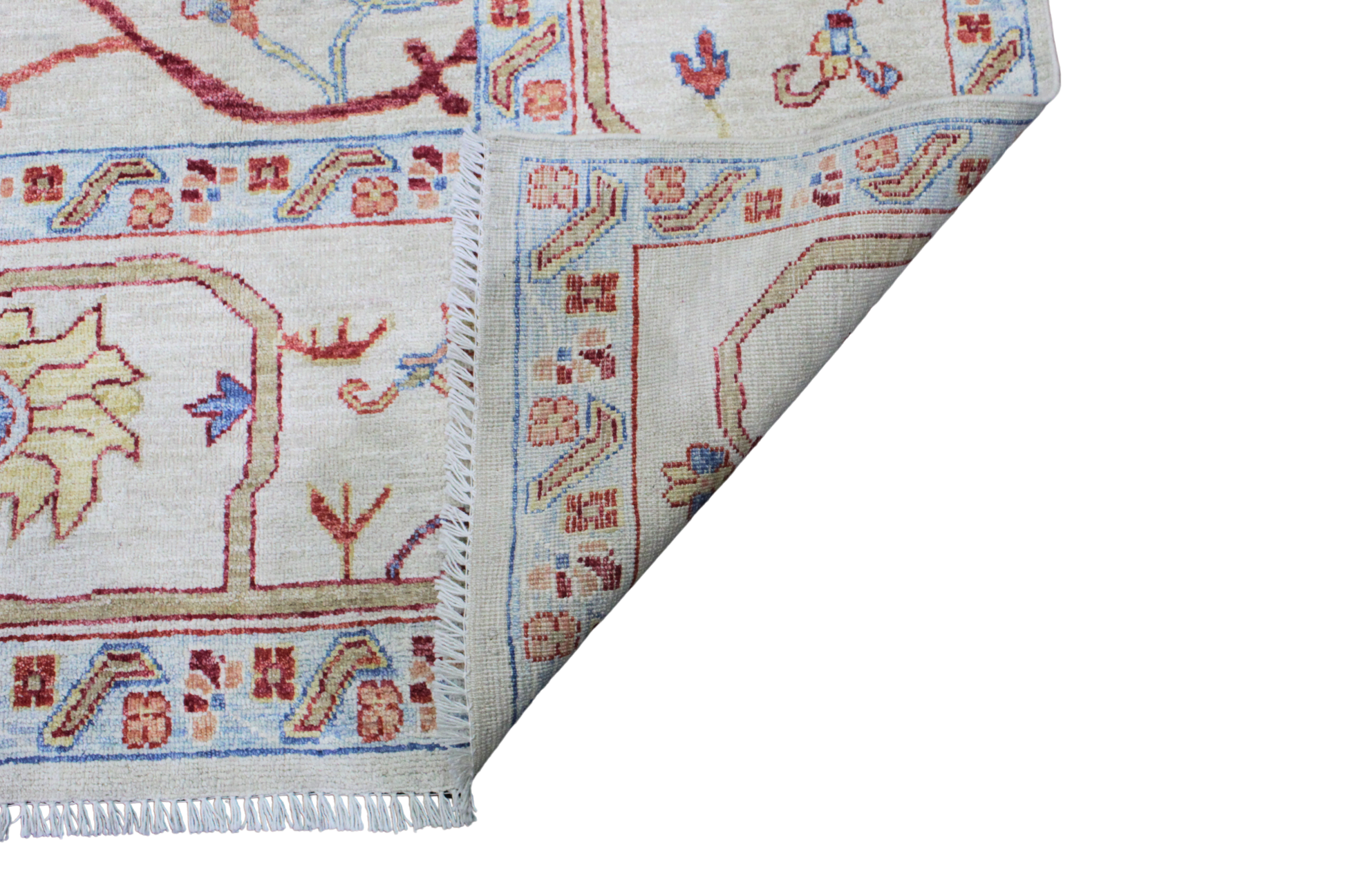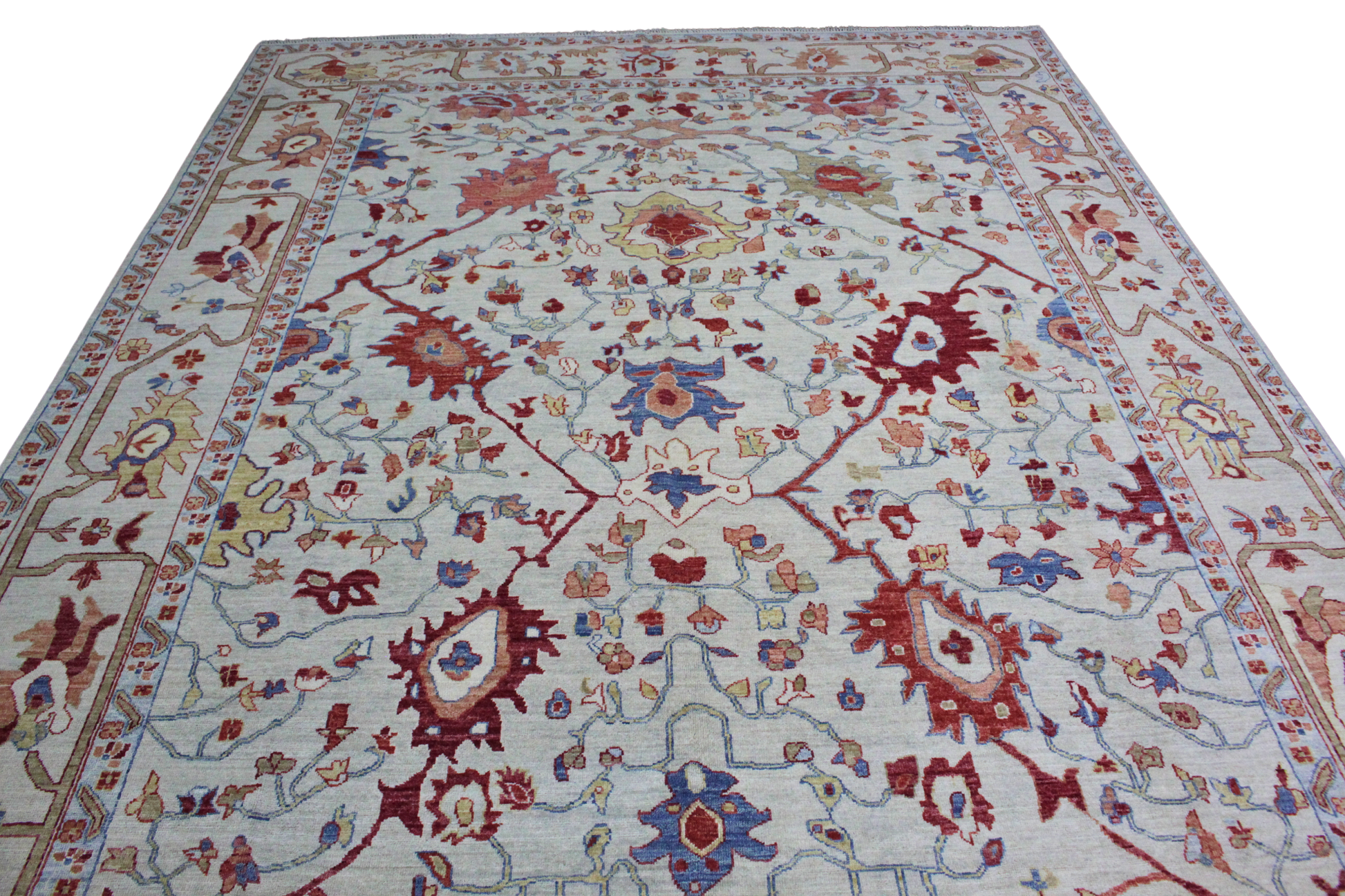 A vivid revival of classic elegance, this Afghan Mahal rug (9.4 × 12.1 ft) brims with color, movement, and timeless floral artistry. The ivory field provides a bright, clean canvas for its richly adorned surface — overflowing with stylized flowers, leafy vines, and traditional palmettes in an exuberant palette of crimson red, indigo blue, saffron gold, terracotta, and olive green.