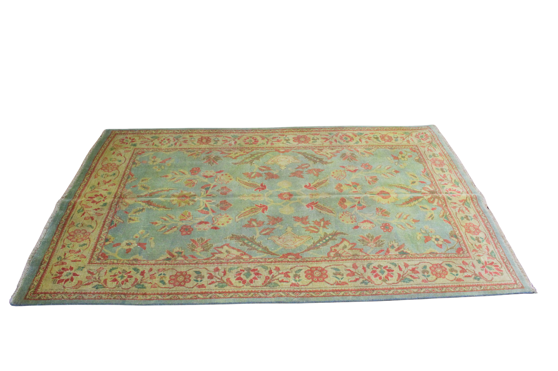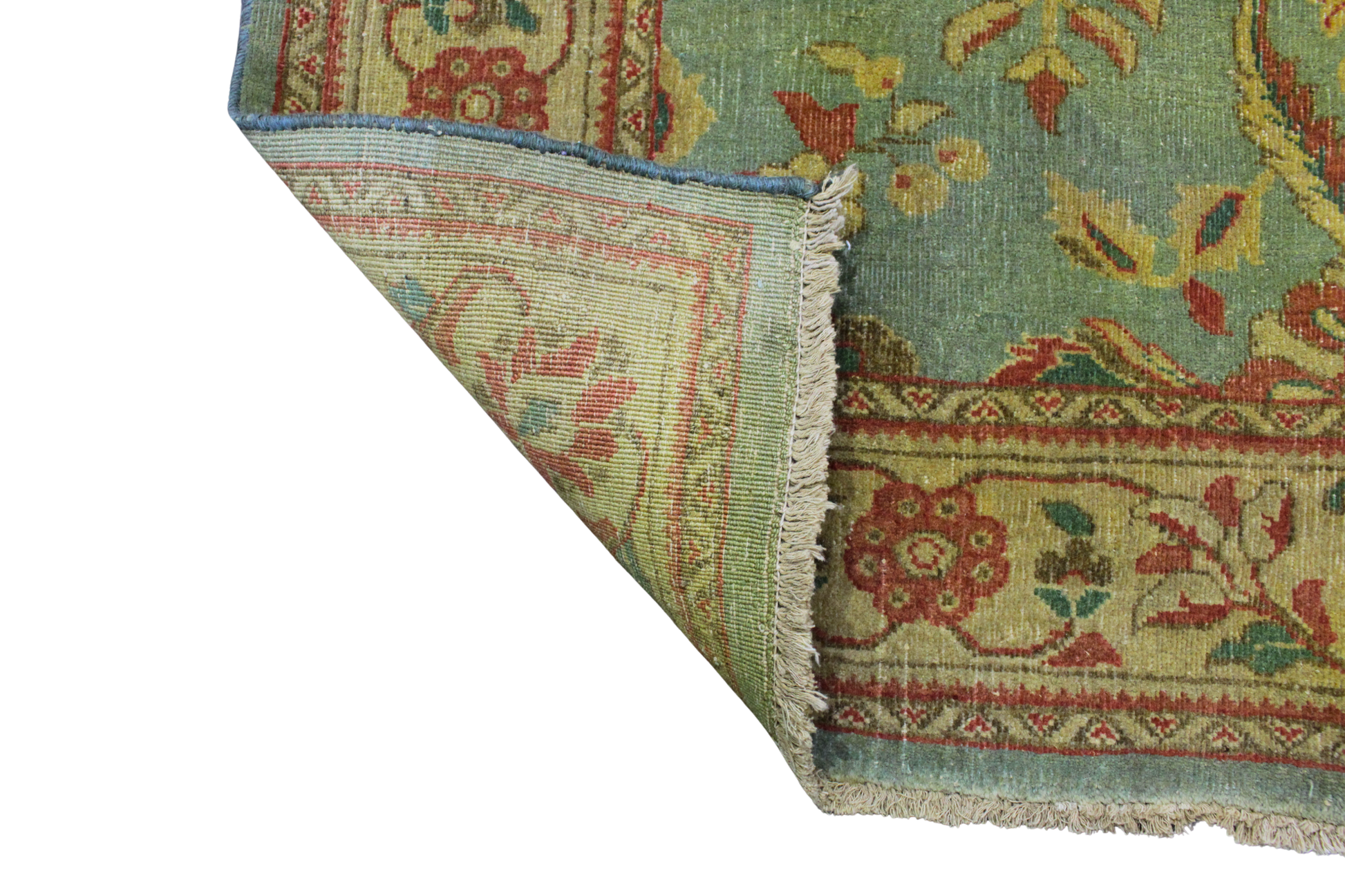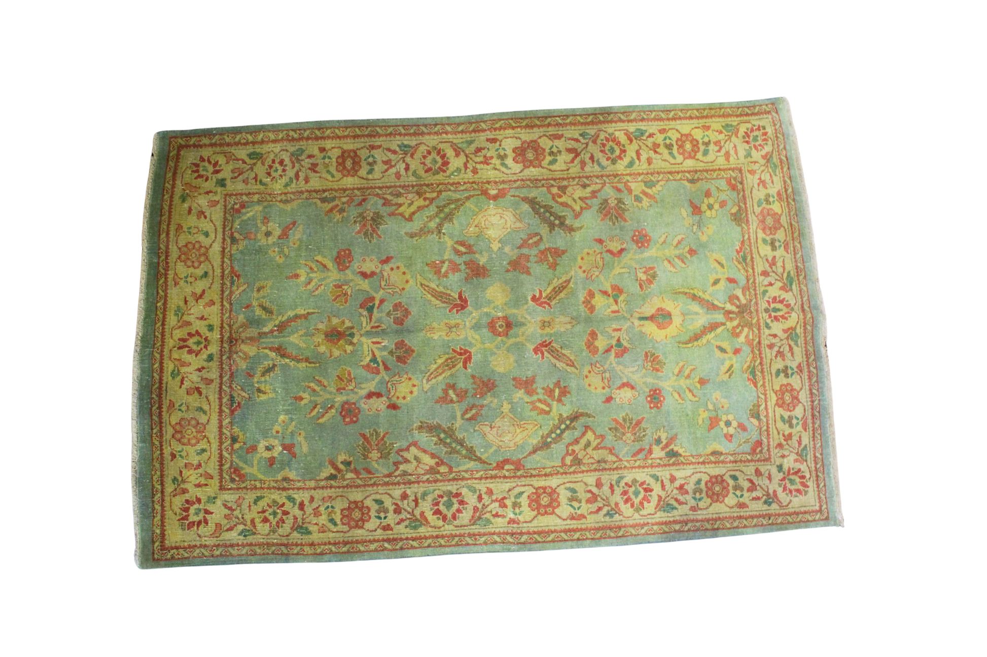 A lush tapestry of floral exuberance, this antique Mahal rug from Persia (4.2 × 6.4 ft) radiates warmth and personality. Its saturated jade green field bursts with stylized blossoms, palmettes, and leafy vinery, all arranged in a symmetrical, garden-inspired layout. The contrast between the green ground and the saffron, coral, and amber motifs gives the rug a dynamic, painterly feel.