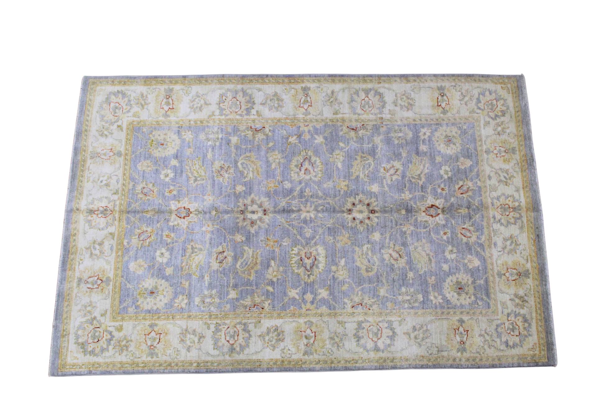 Softly muted yet strikingly elegant, this hand-knotted Oushak rug from Pakistan (4' × 6') exudes a timeless sense of refinement. Its powdery blue field is adorned with classic palmettes, stylized florals, and soft vinework, all rendered in pale ivory, faded sage, and dusty gold. The ivory border frames the rug like a gentle whisper, subtly accentuating the floral motifs and lending an airy lightness to the entire composition.