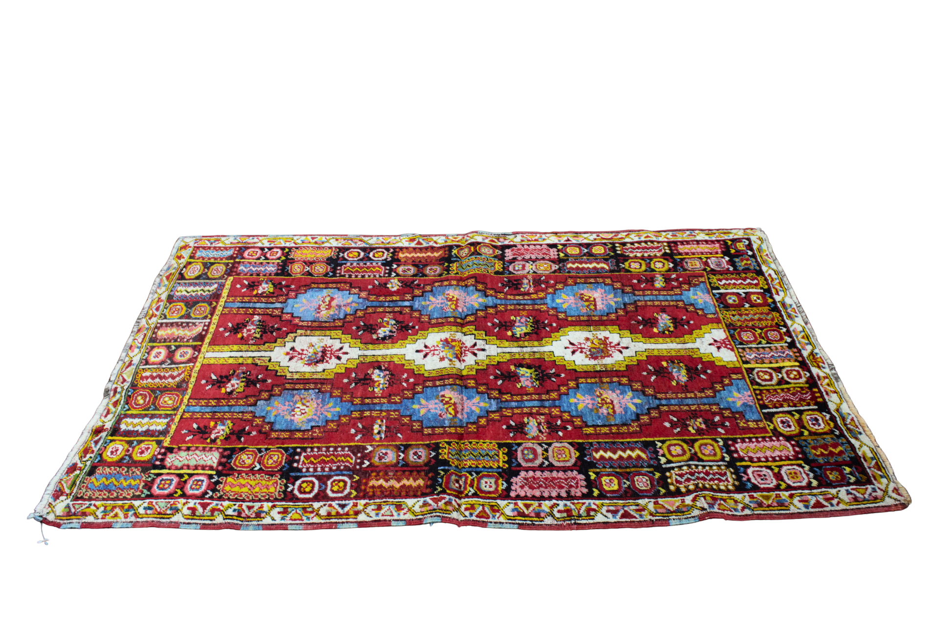 This energetic and richly detailed 3.5' × 5.3' Oushak rug from Turkey captures the soul of Anatolian folk artistry in a compact, decorative format. Its striking crimson red field is anchored by a bold series of vertically stacked medallions in ivory, azure, and soft blue, each filled with intricate floral bouquets. The surrounding motifs — zigzag lines, rosettes, and stylized geometrics — bring rhythmic energy to the composition, while a vivid border of multicolored blocks adds folkloric charm and visual density.