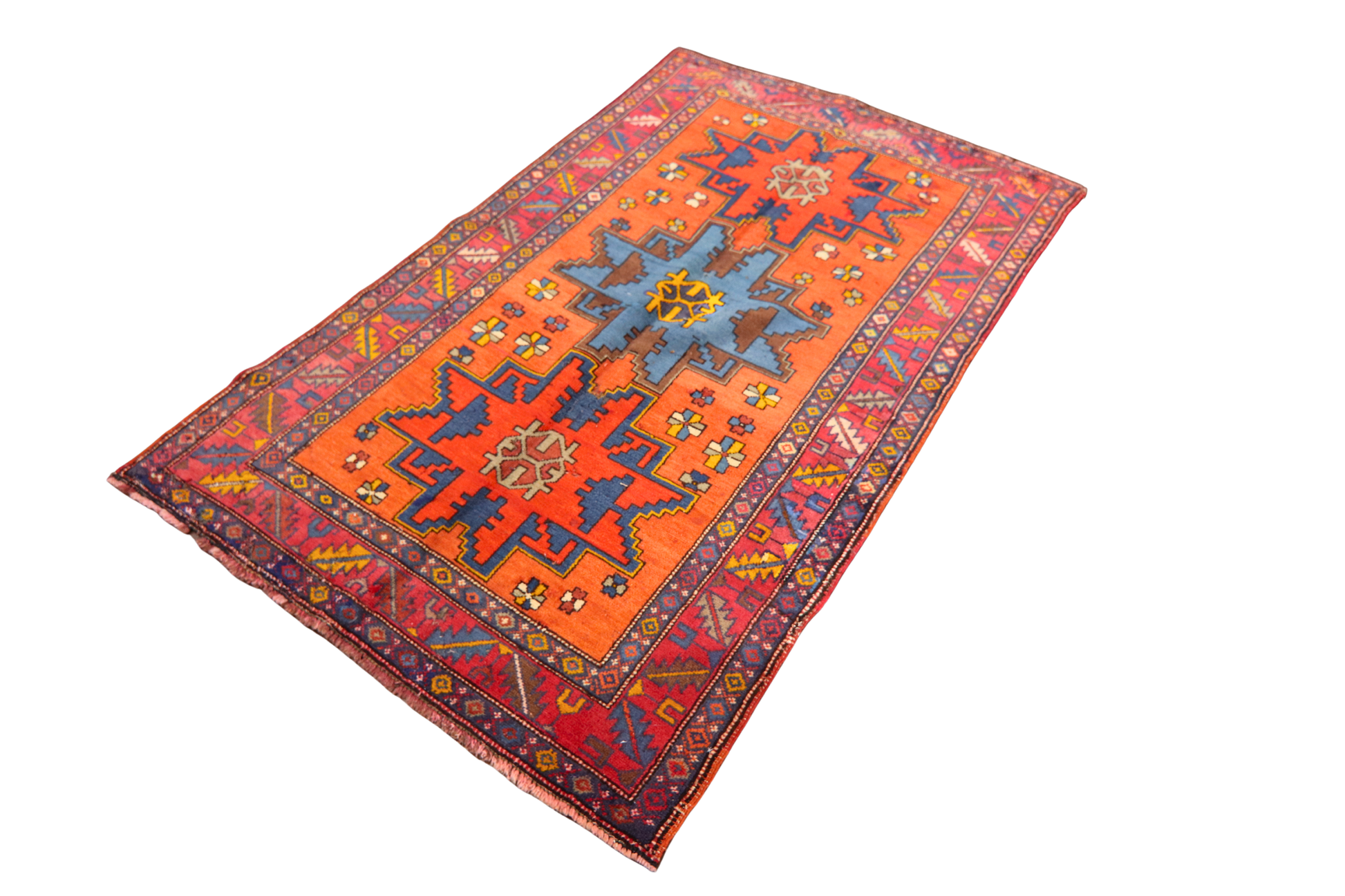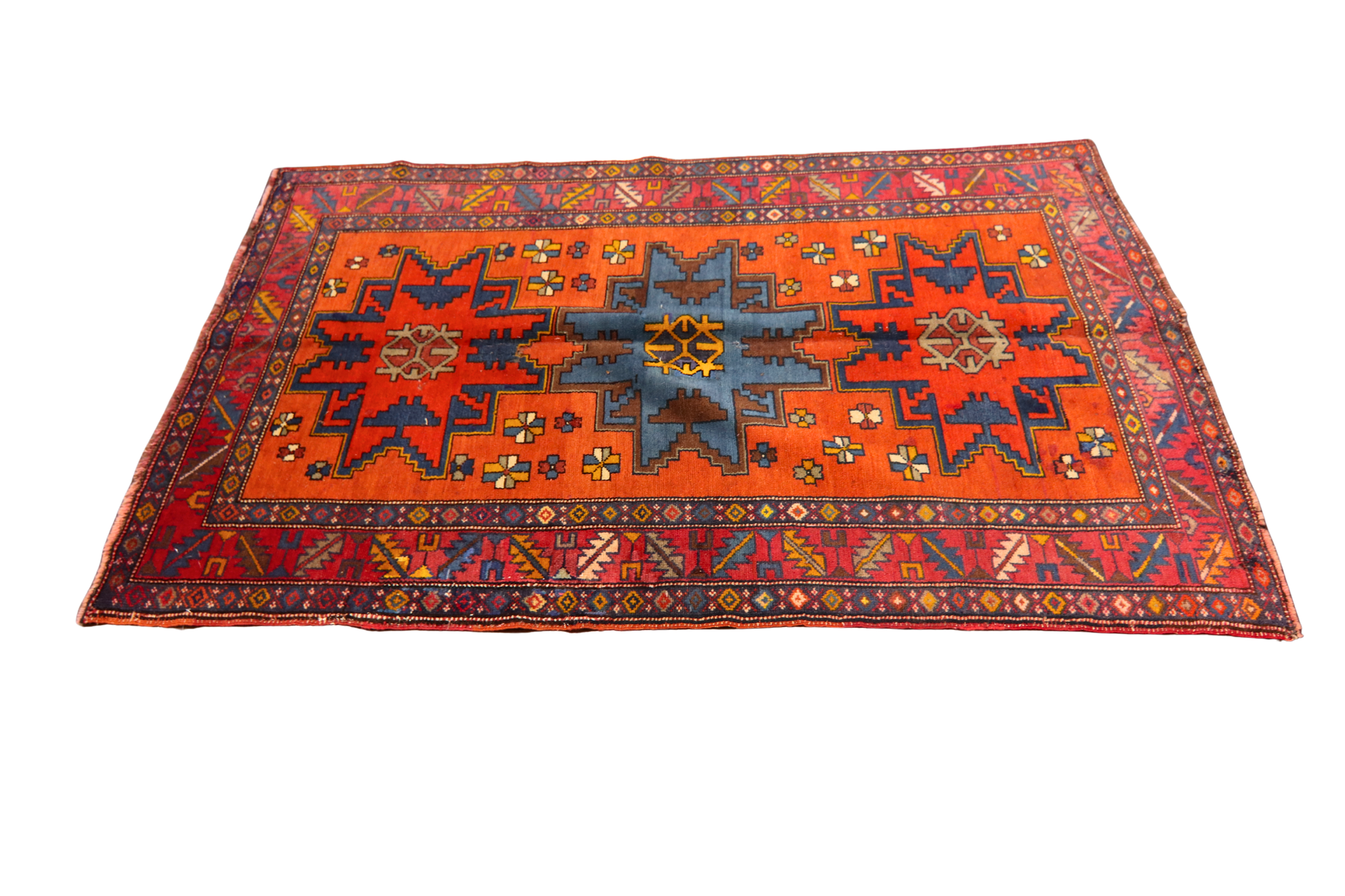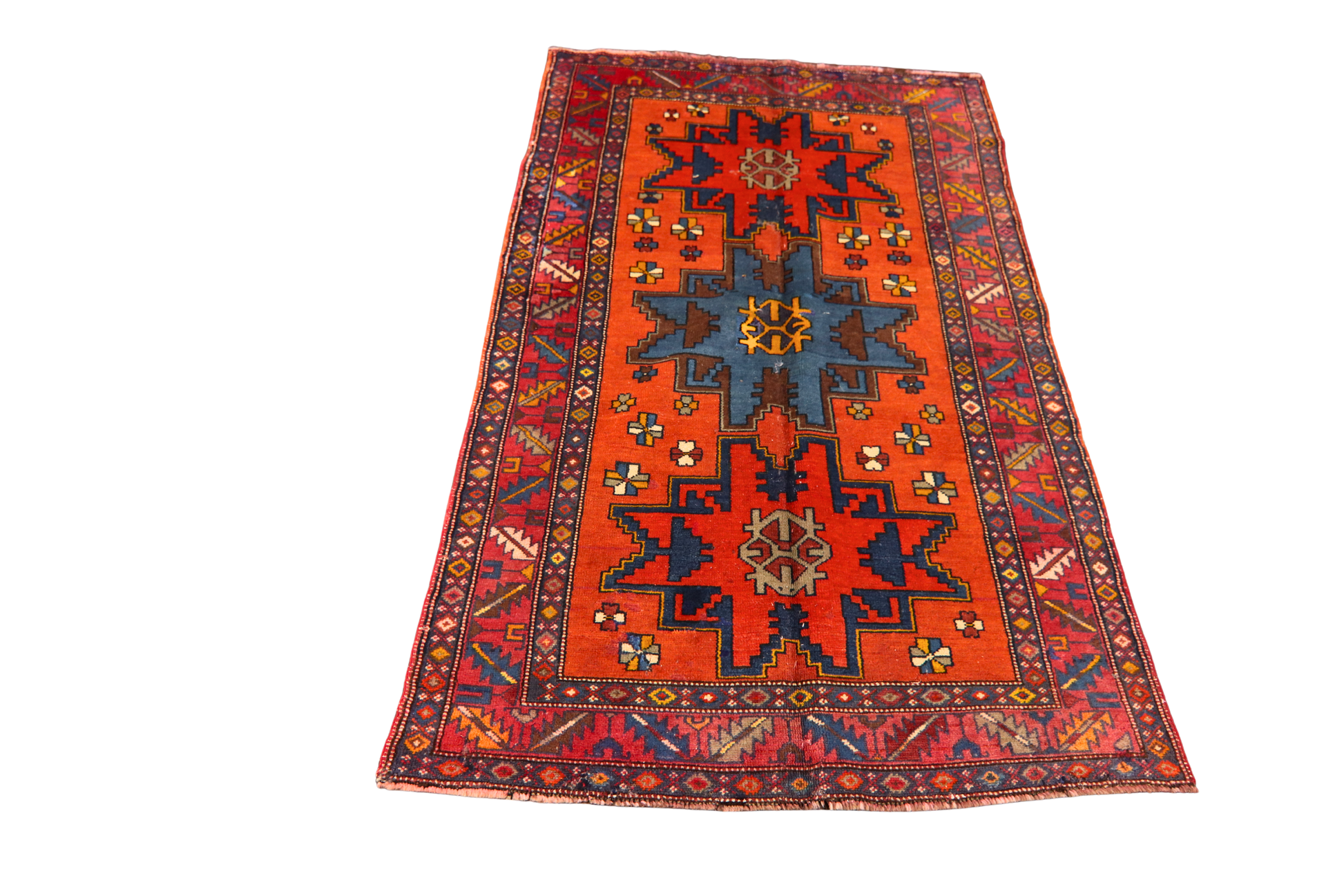 Bold, vibrant, and unmistakably tribal, this antique Russian rug is a feast of saturated color and symmetrical design. Set against a fiery orange field, three monumental geometric medallions in deep red, cerulean, and navy form the visual spine of the piece. Flanked by scattered floral rosettes and stylized lattice borders, the design evokes the rugged spirit and folkloric patterns of the Caucasus region.