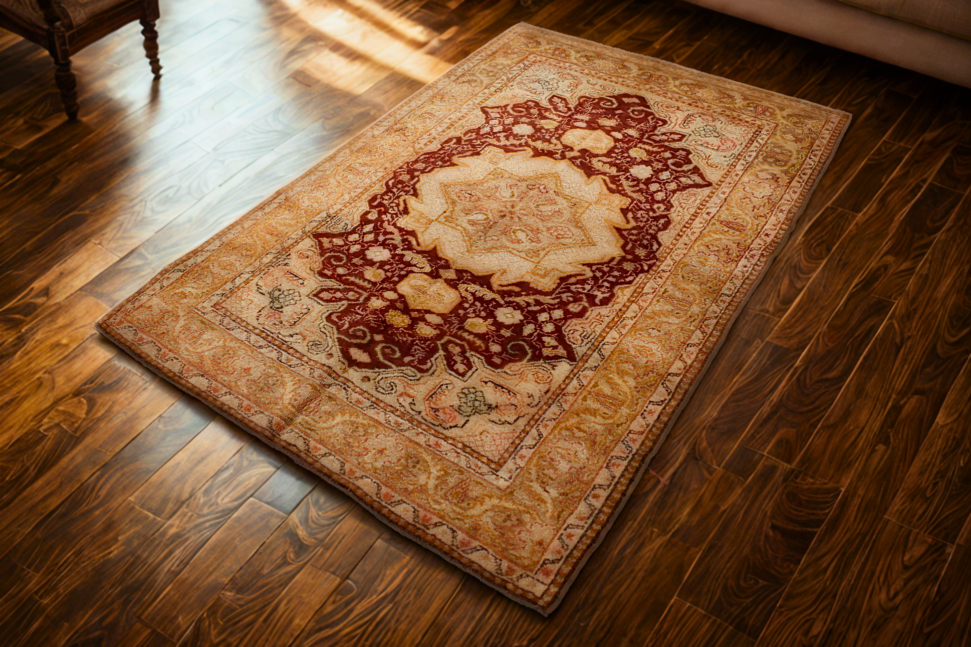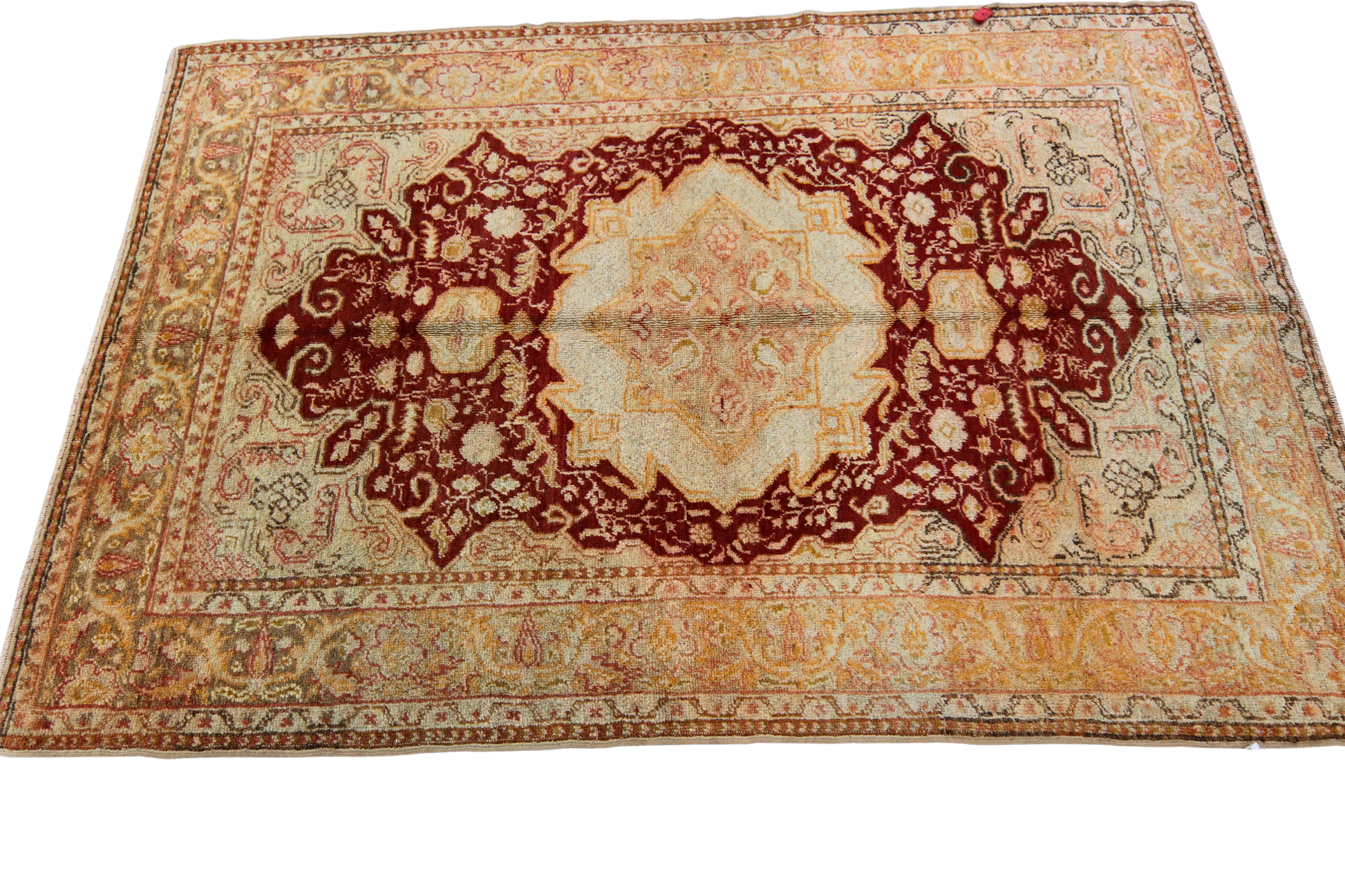 With its commanding crimson medallion and warm-toned patina, this antique Oushak rug radiates a timeless nobility. A luminous ivory field sets the stage for a bold central medallion in brick red and soft gold, anchored by stylized florals and vine scrolls. The framing border, with its golden hues and faded rose motifs, adds to the piece's aged elegance.