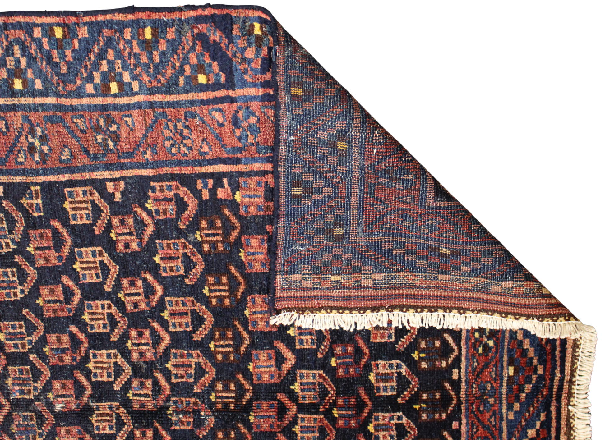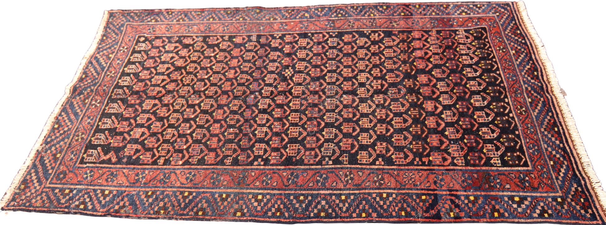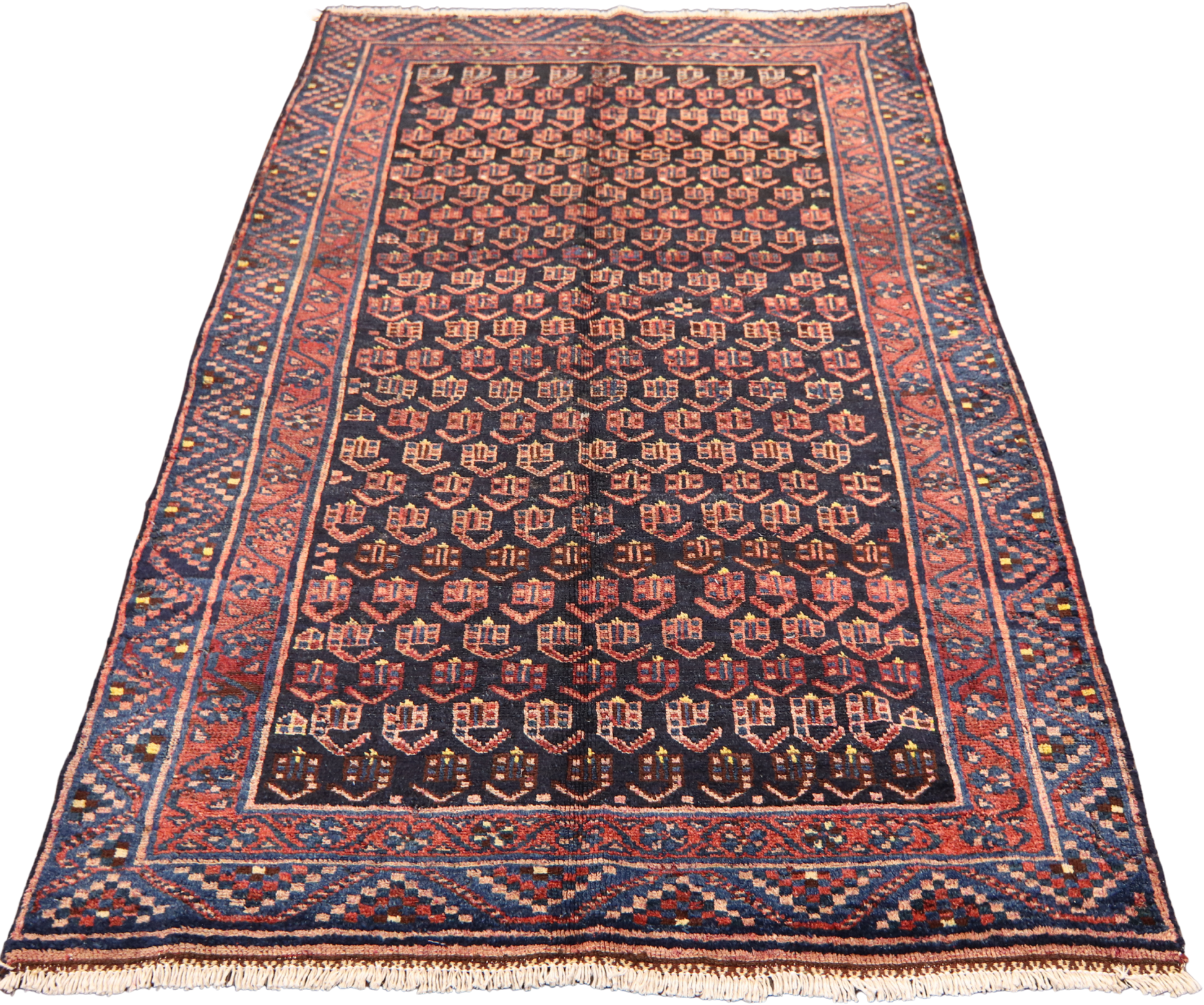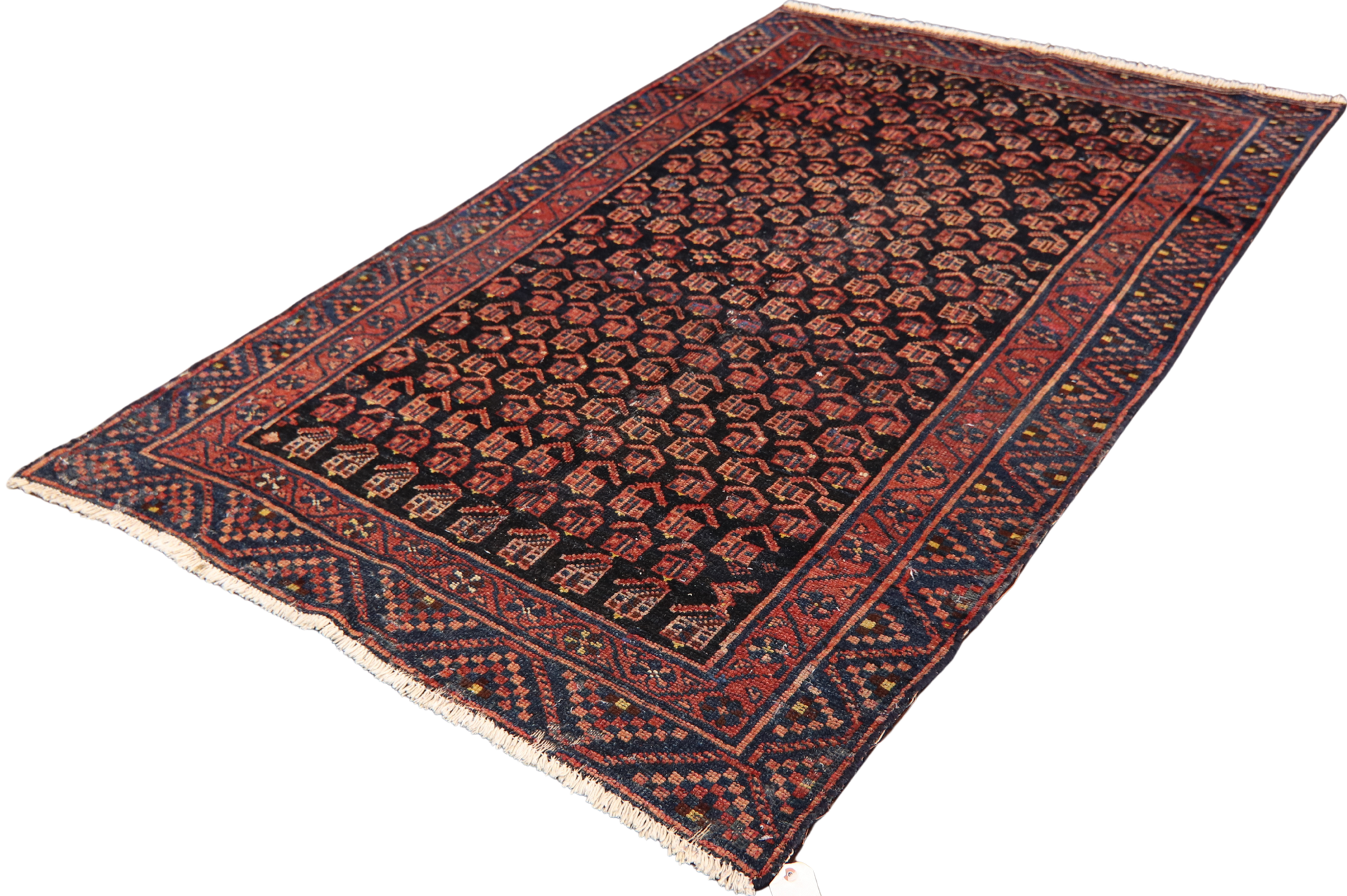 This antique Malayer rug (4.3 × 6.9 ft) unfolds in a hypnotic cascade of boteh motifs — symbolic seed-like forms often interpreted as flames, leaves, or eternal life. Arranged in a dense, staggered field, these motifs alternate in crimson, brick, and terra cotta against a deep inky ground, creating a richly textured visual rhythm that invites closer inspection.