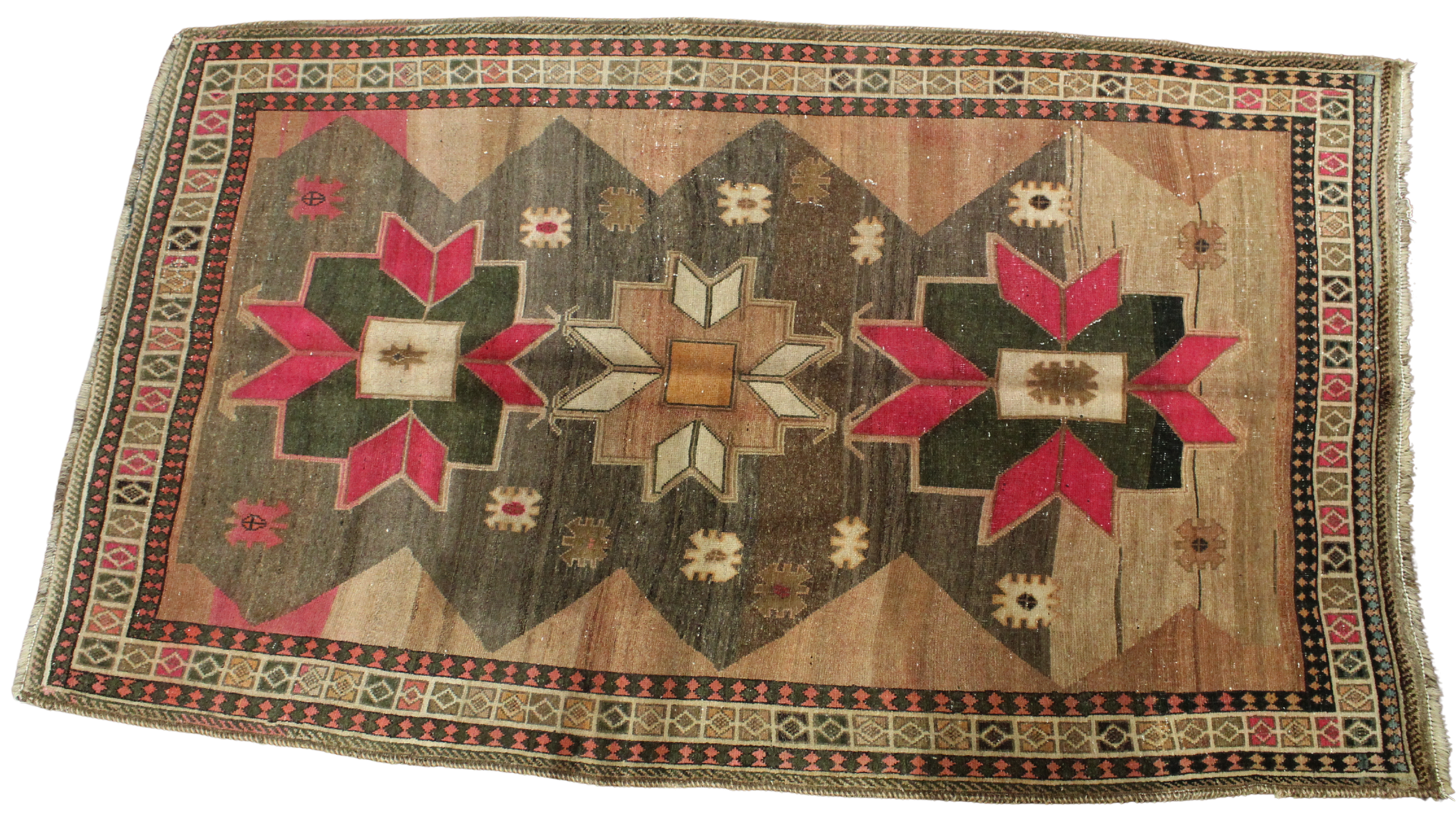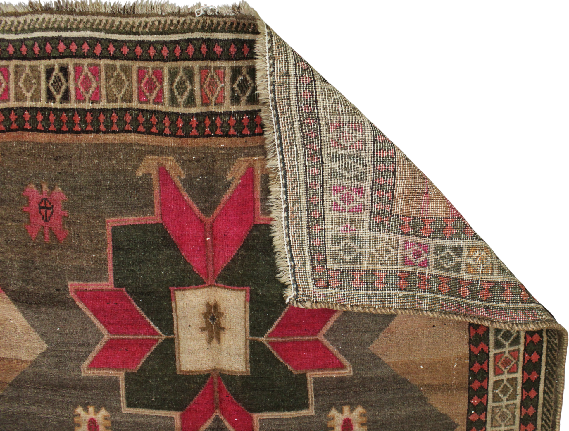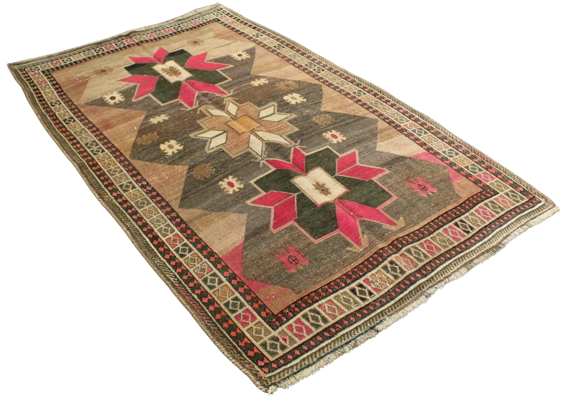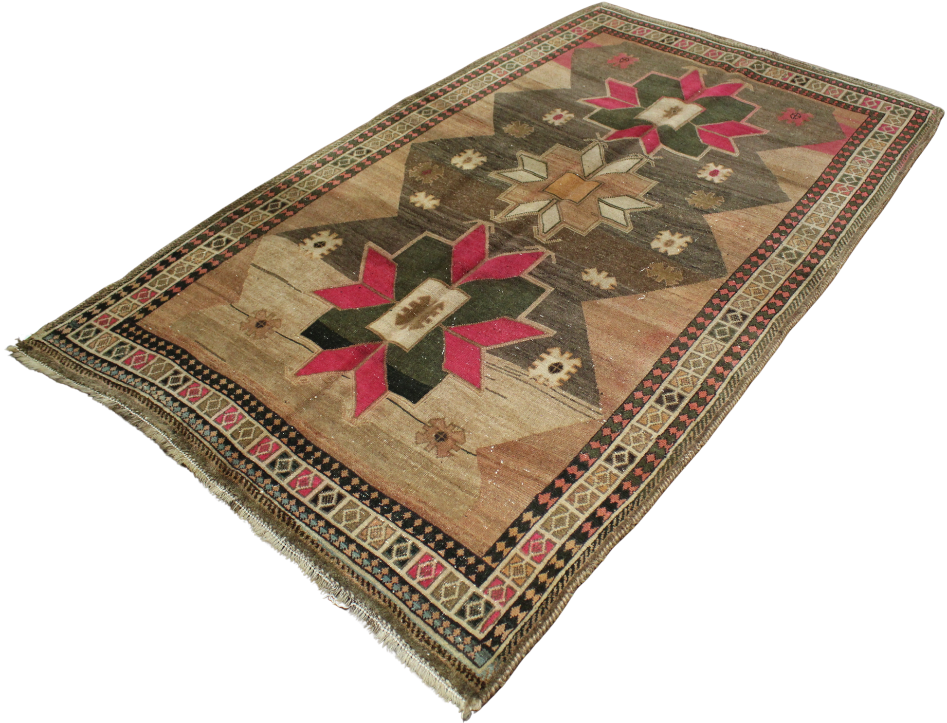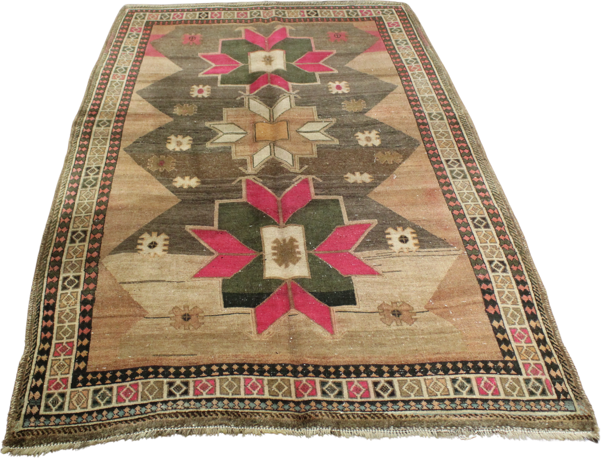 Earthy, bold, and unmistakably tribal, this antique Shiraz rug (4.6 × 7.6 ft) showcases a dynamic field of oversized geometric stars — each a symbol of guidance and protection in nomadic culture. Woven in rustic tones of olive, sand, and terracotta, the central medallion is flanked by twin starbursts in deep green and vivid crimson, standing out against a variegated brown field full of character and texture.