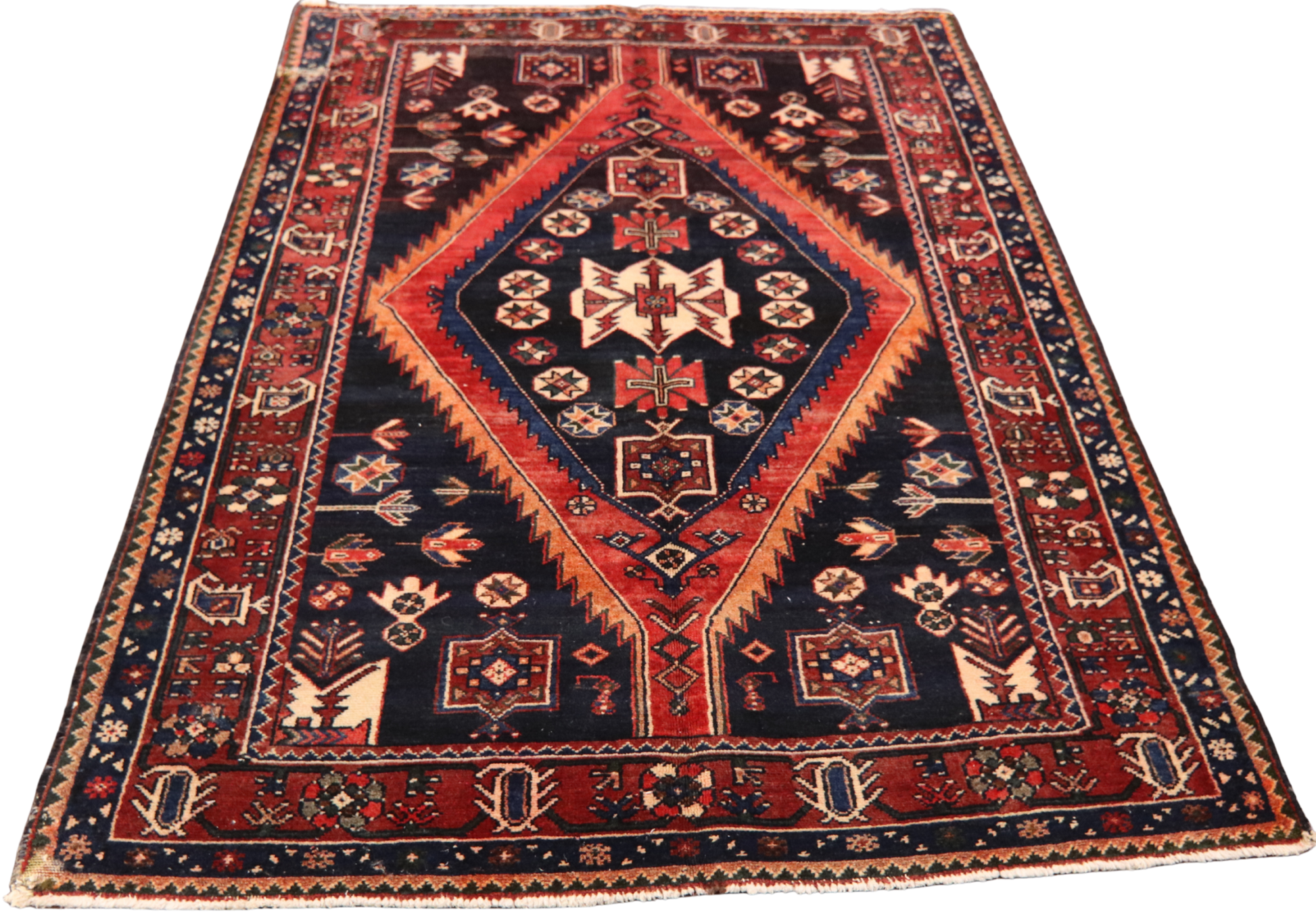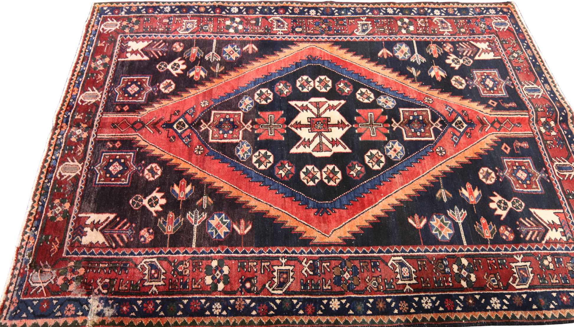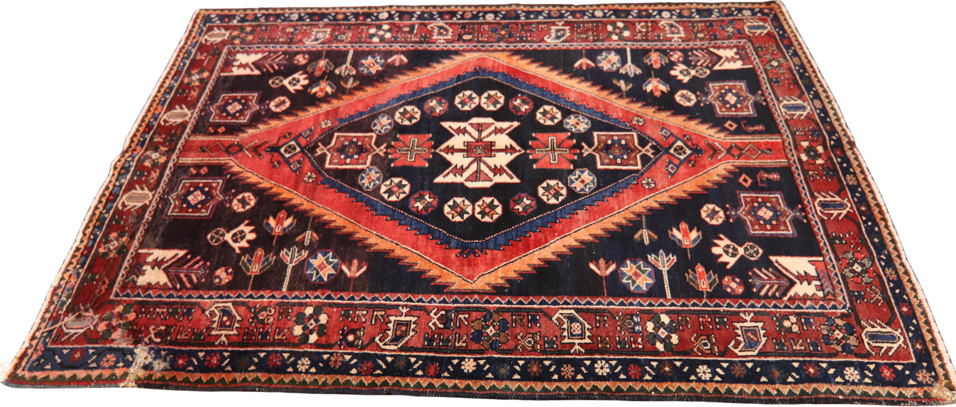 Radiating tribal strength and symbolic storytelling, this antique Hamedan rug (4.7 × 6.6 ft) features a dynamic red diamond medallion set against a midnight navy field — a classic hallmark of the region’s nomadic designs. The central motif is adorned with stylized crosses, rosettes, and geometric blossoms, while tulip-like floral sprigs and star medallions scatter across the field like celestial emblems.