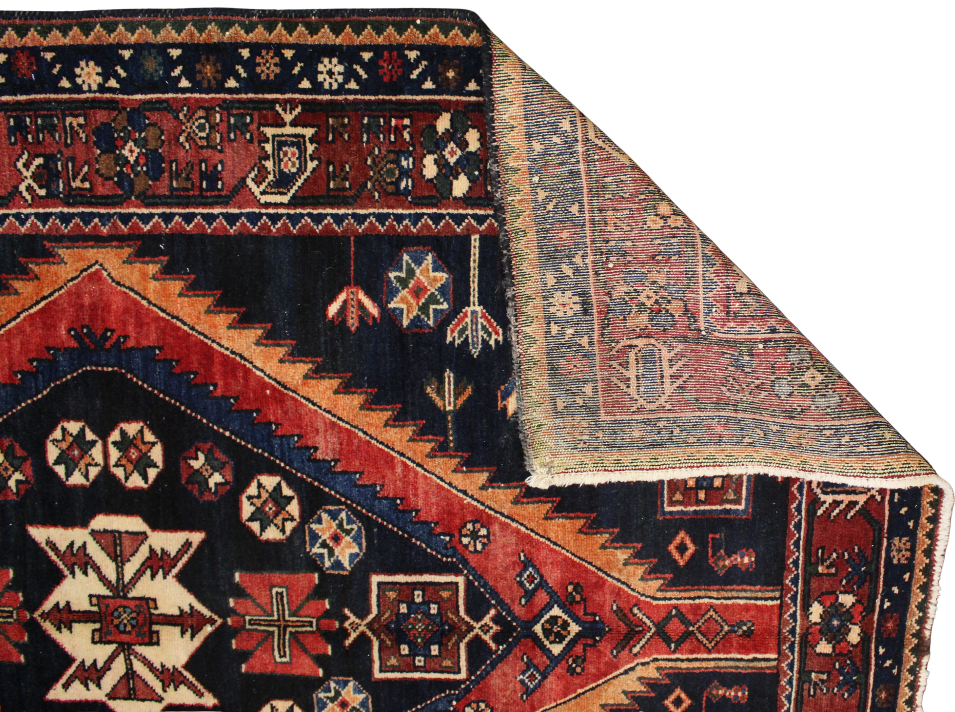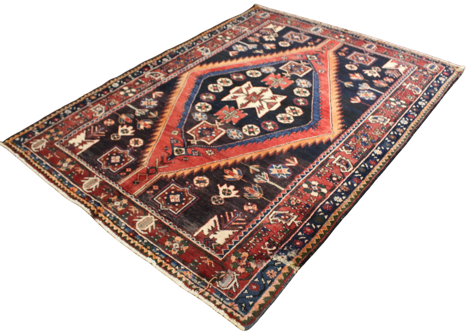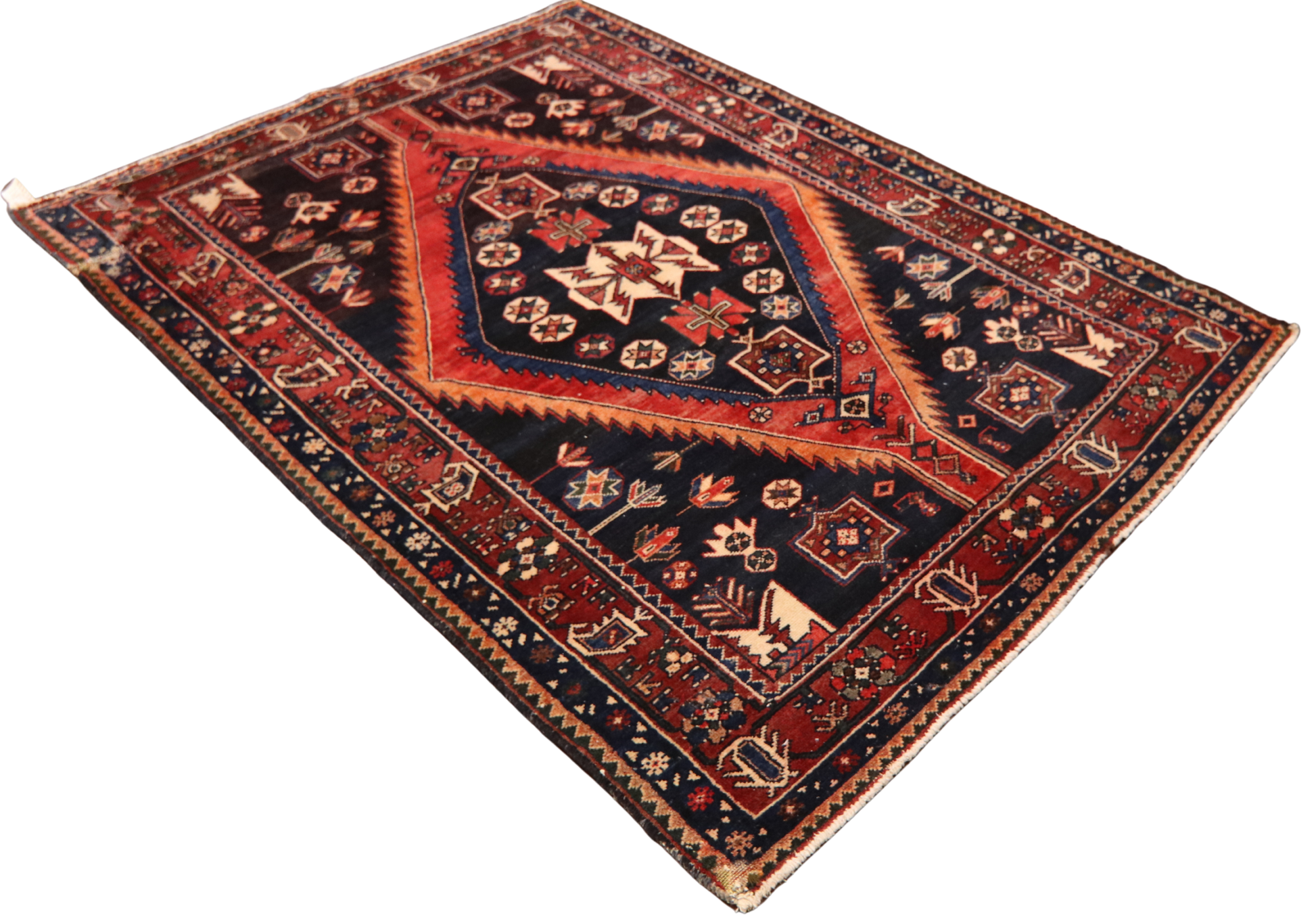 Radiating tribal strength and symbolic storytelling, this antique Hamedan rug (4.7 × 6.6 ft) features a dynamic red diamond medallion set against a midnight navy field — a classic hallmark of the region’s nomadic designs. The central motif is adorned with stylized crosses, rosettes, and geometric blossoms, while tulip-like floral sprigs and star medallions scatter across the field like celestial emblems.