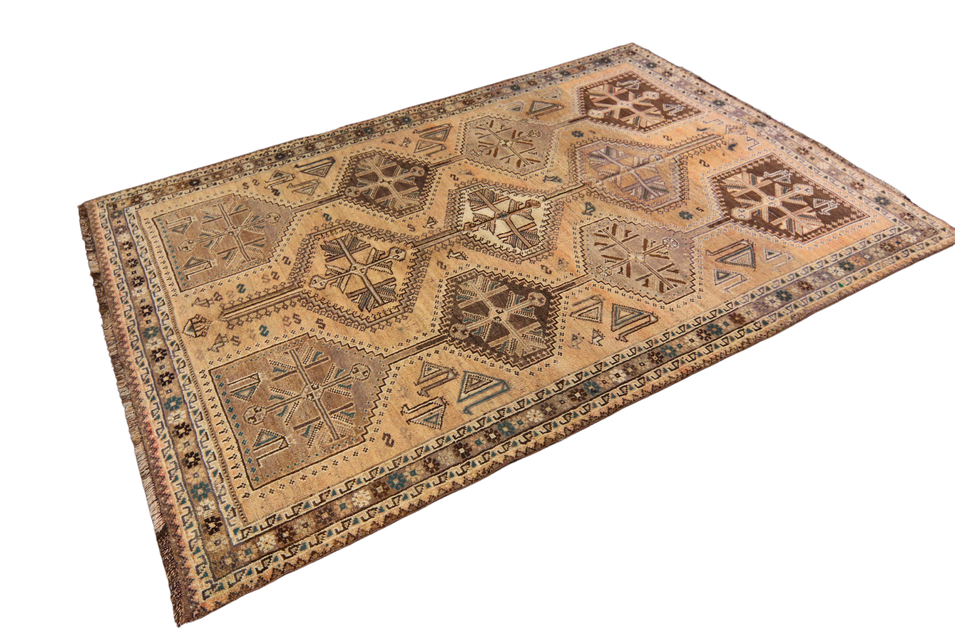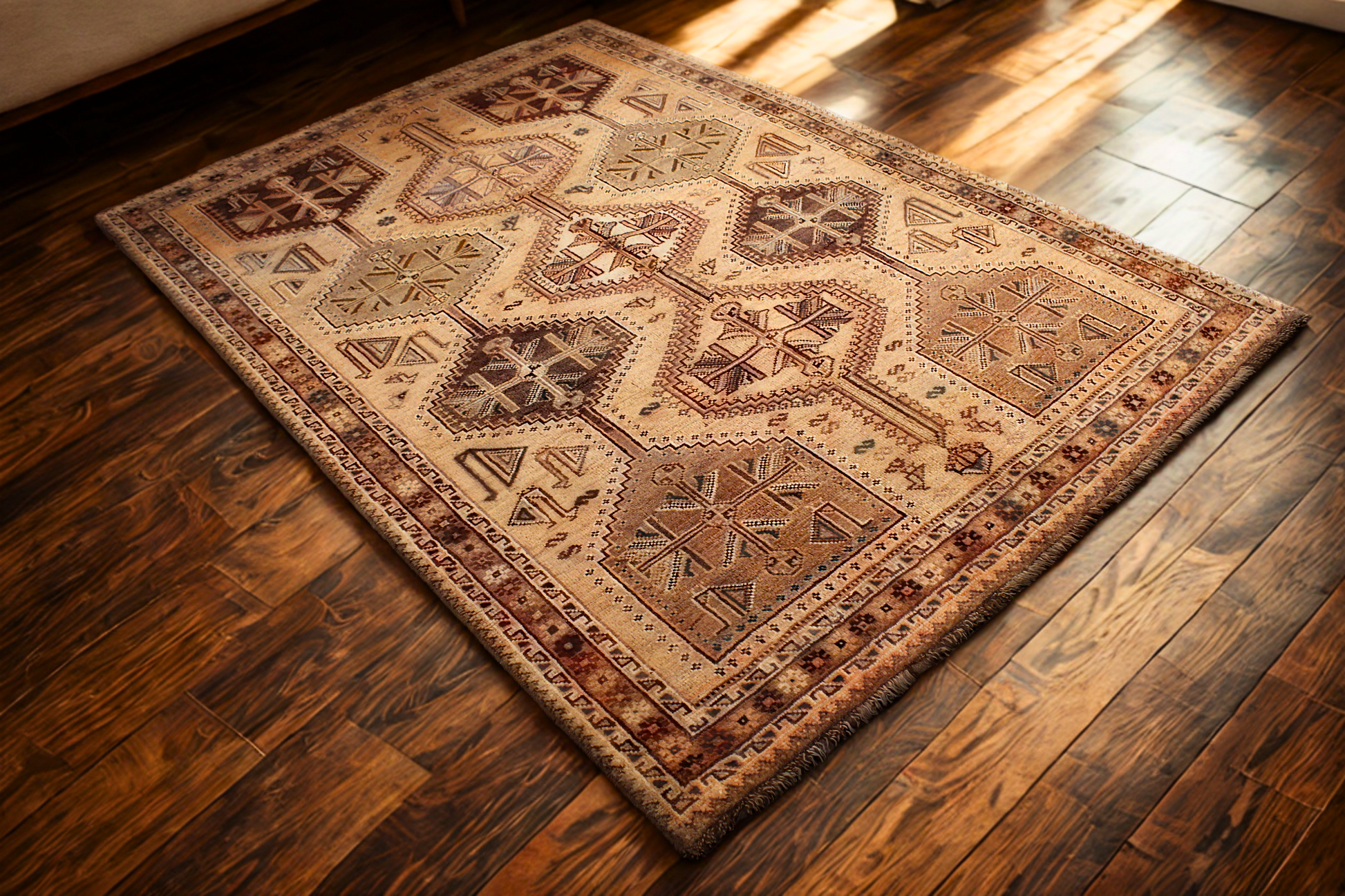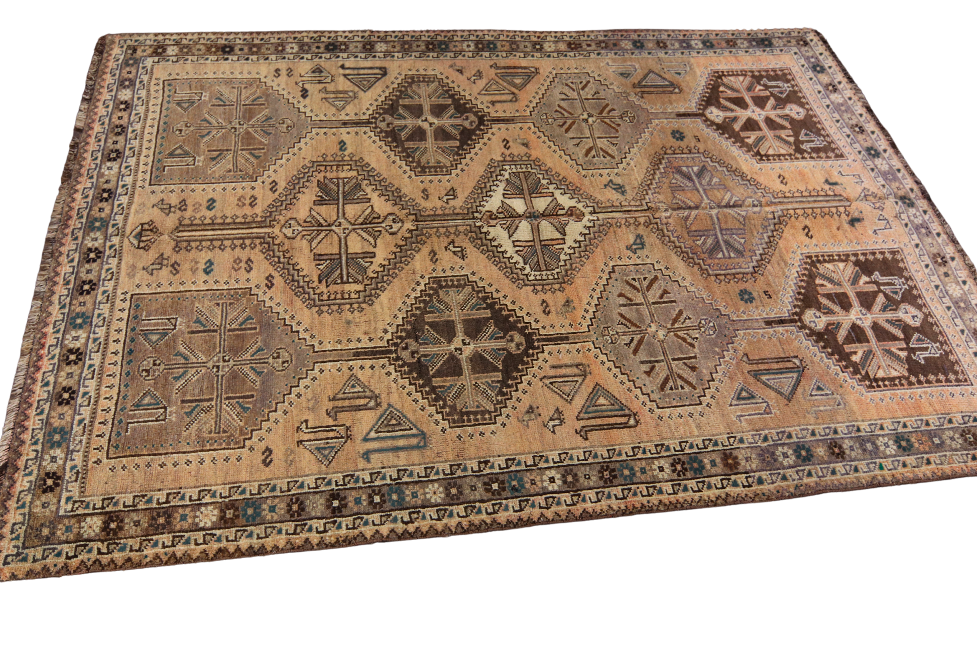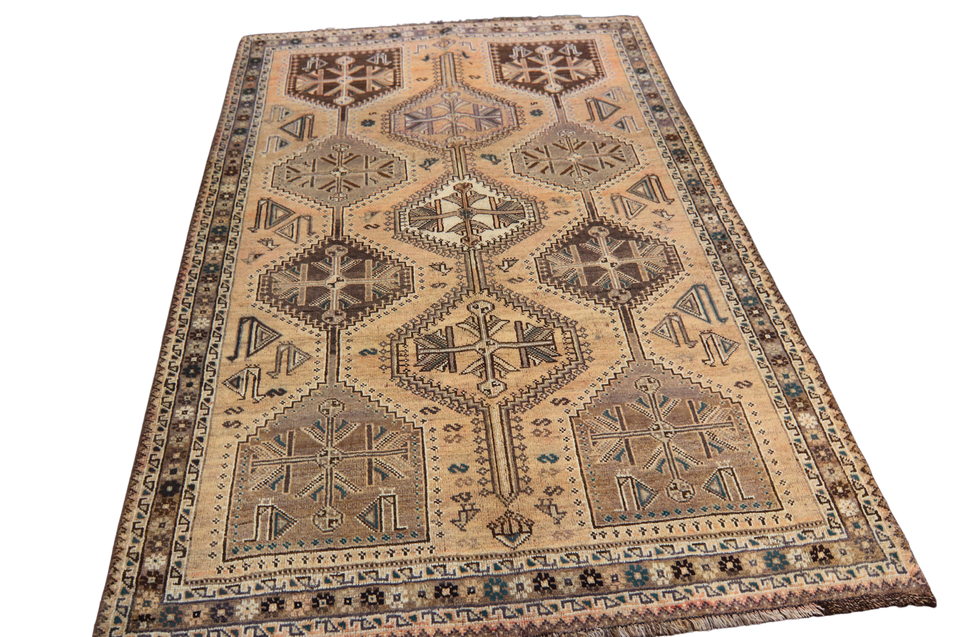 With its soft neutral tones and snowflake-like medallions, this antique Shiraz rug (5.4 × 7.8 ft) offers a striking interpretation of tribal geometry through a muted desert palette. Hexagonal medallions filled with radiating starbursts march across the sandy beige field in orderly rows, echoing the nomadic traditions of the Qashqai and Luri tribes from the Shiraz region.