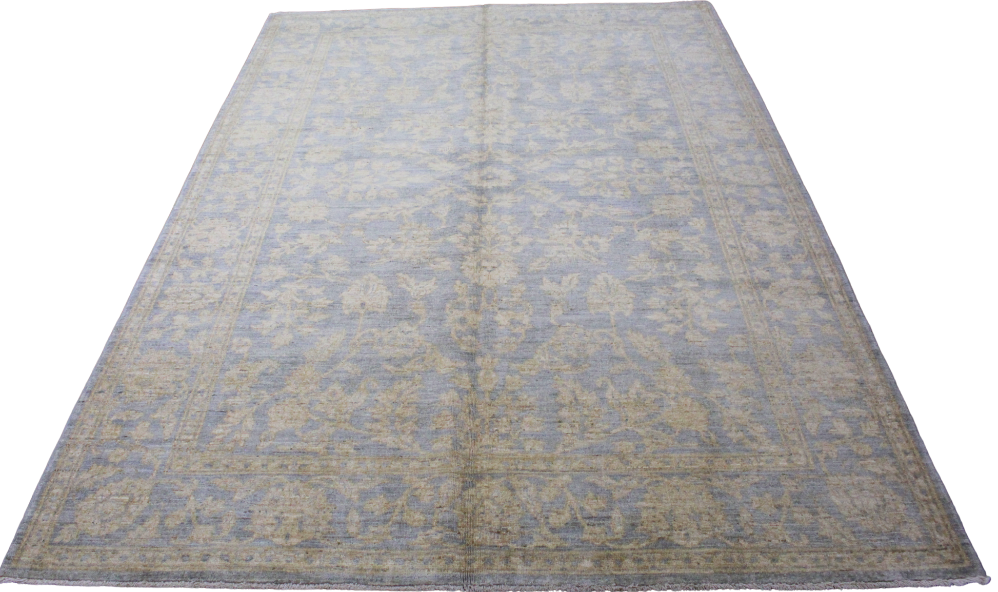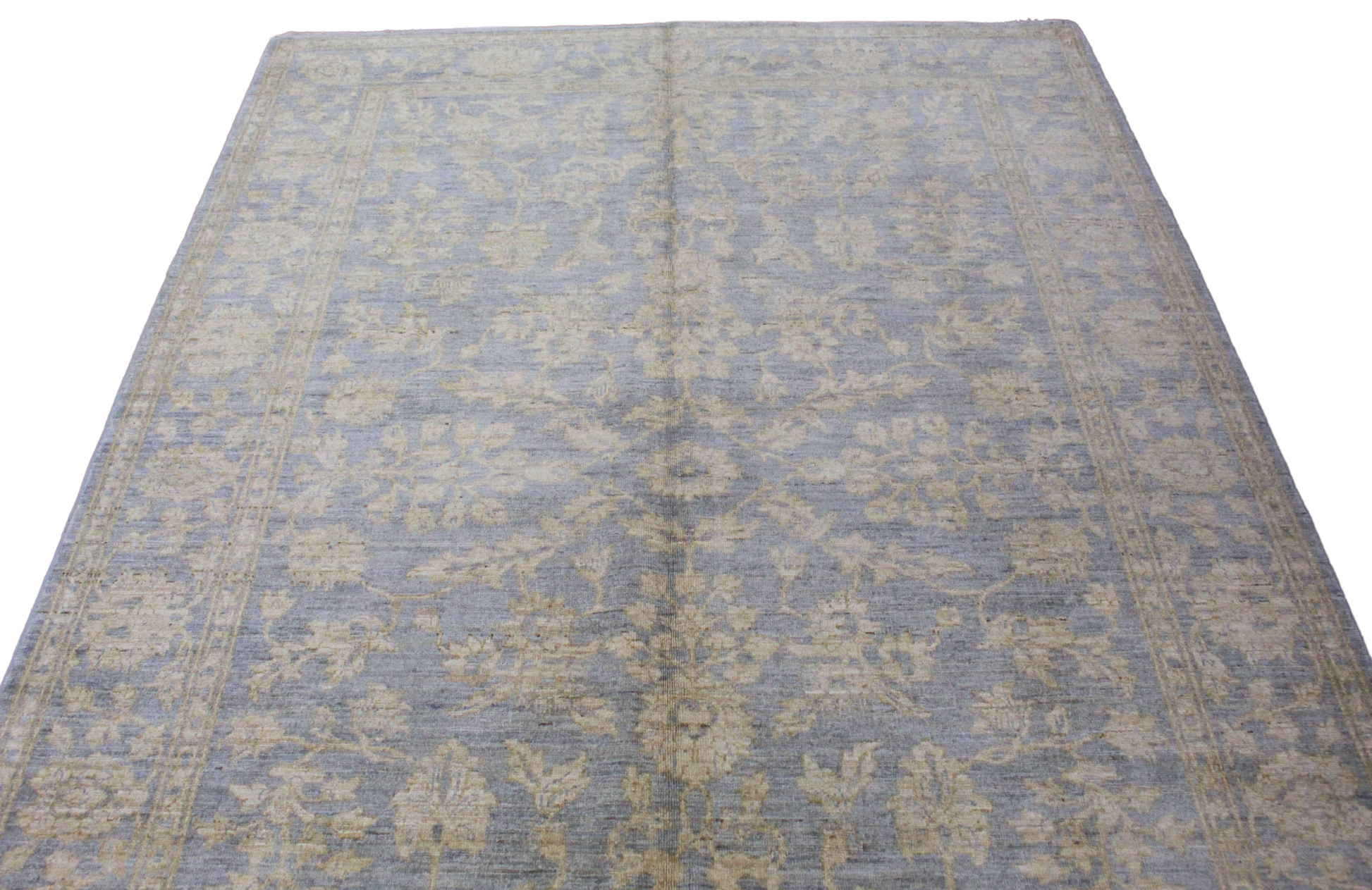 Gracefully understated and richly woven, this 6.1 × 8.10 ft Oushak rug from Pakistan brings timeless balance and warmth to any setting. Its pale blue field is gently adorned with a scrolling allover floral lattice in muted wheat and sandy ivory tones, offering a tone-on-tone palette that whispers elegance.