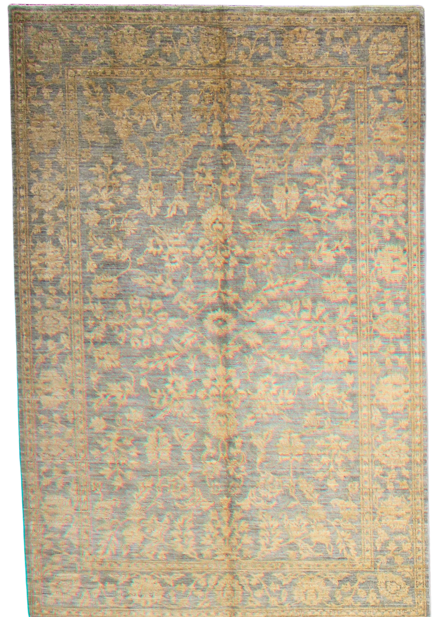 The design features gently stylized palmettes, rosettes, and trailing vines in a symmetrical flow, framed by a narrow border with delicate botanical motifs. Subtle abrash throughout the field gives the piece a natural, vintage patina — perfect for light-filled living spaces, serene bedrooms, or transitional interiors seeking softness without compromise on character.
