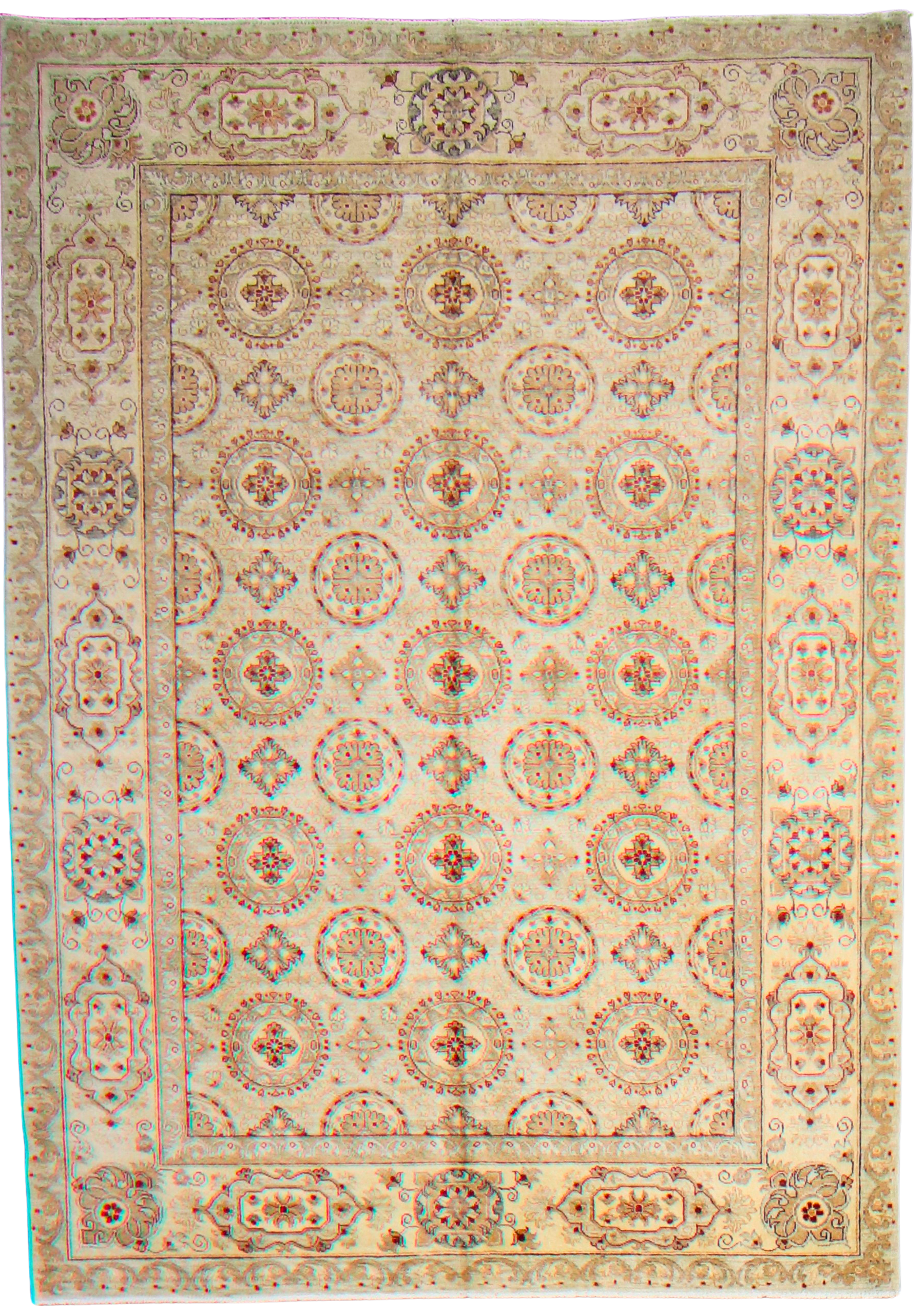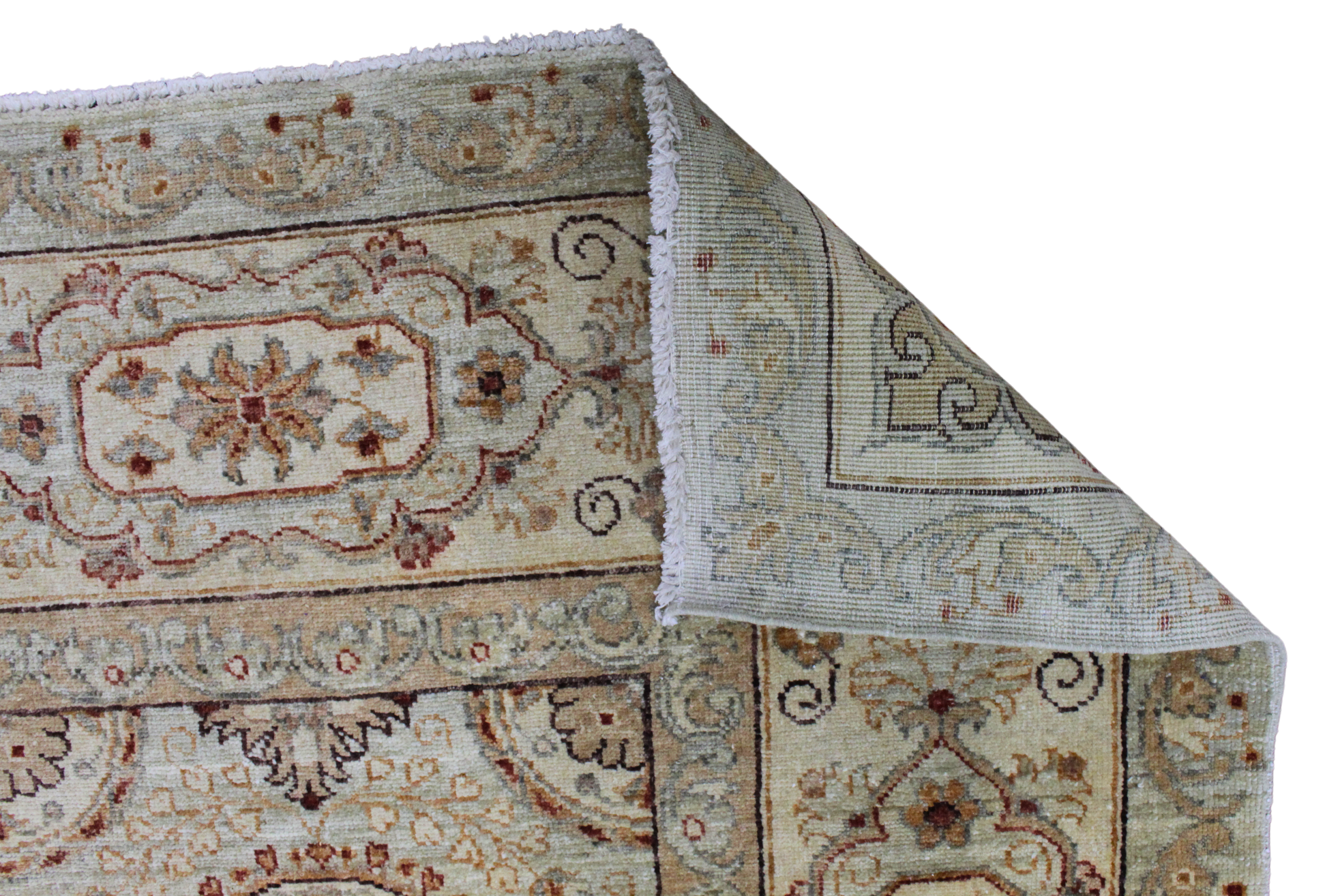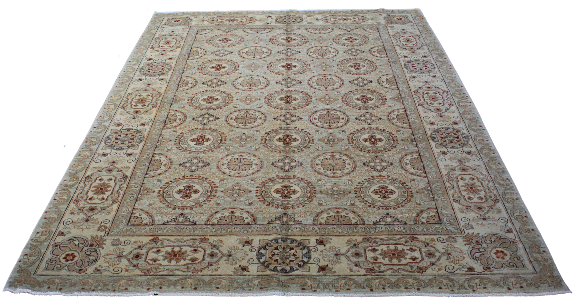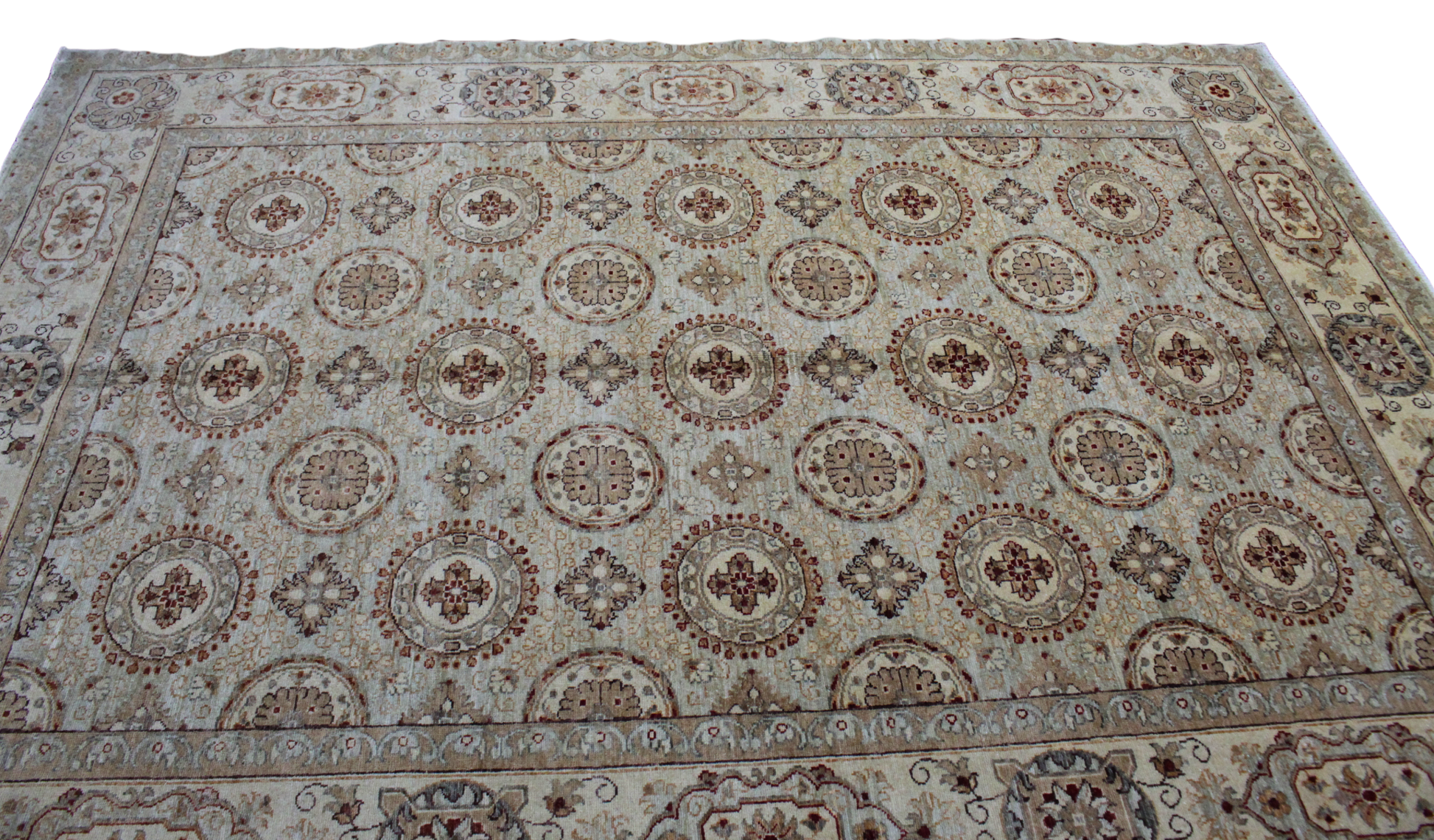 Structured yet graceful, this 6.4 × 8.8 ft Oushak rug from Pakistan offers a harmonious balance of geometry and softness. Its design features a mesmerizing array of medallion-like floral rosettes in repeating rows, each framed with delicate vinework and anchored by stylized cornerpieces in the border — a classic nod to traditional Persian aesthetics.