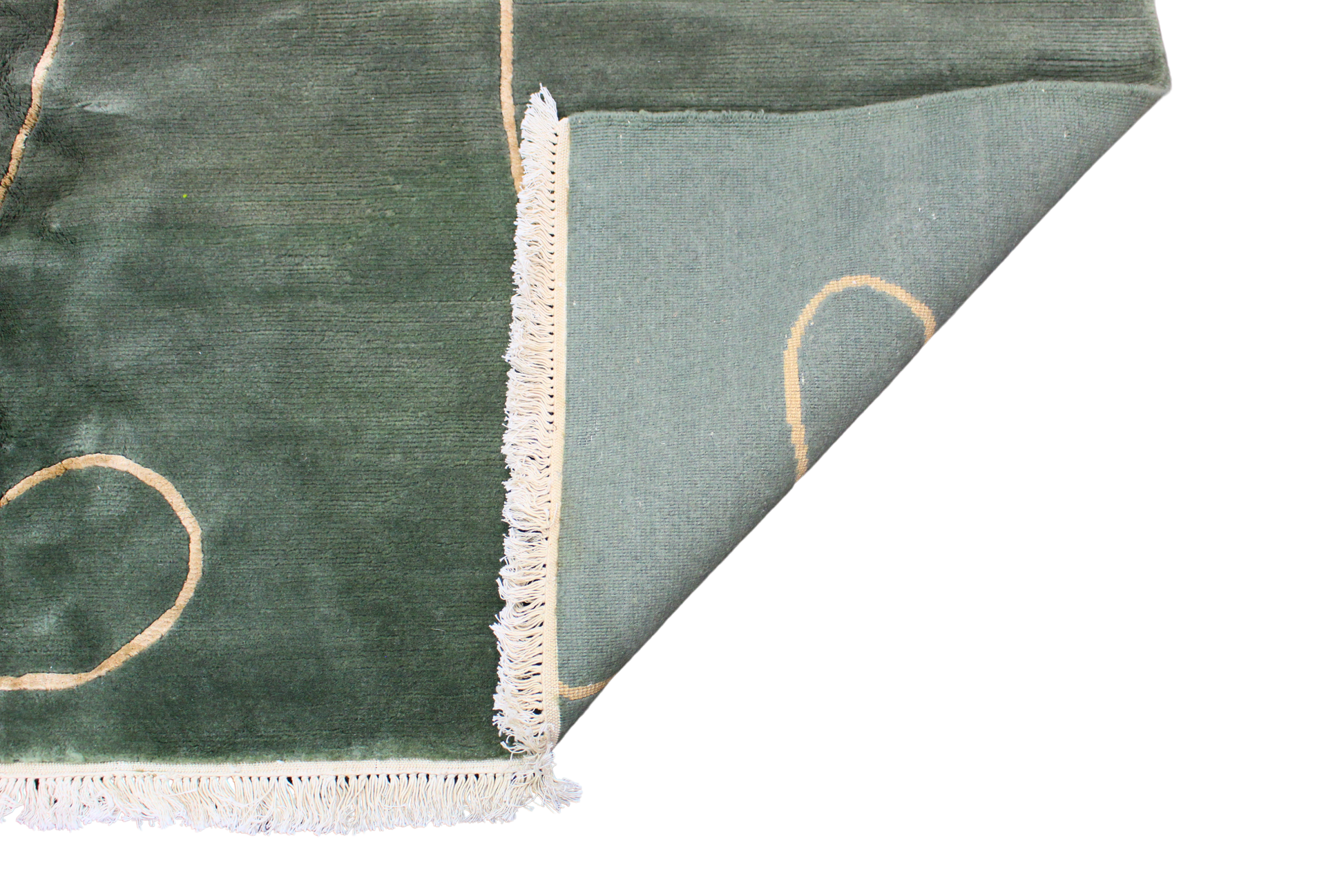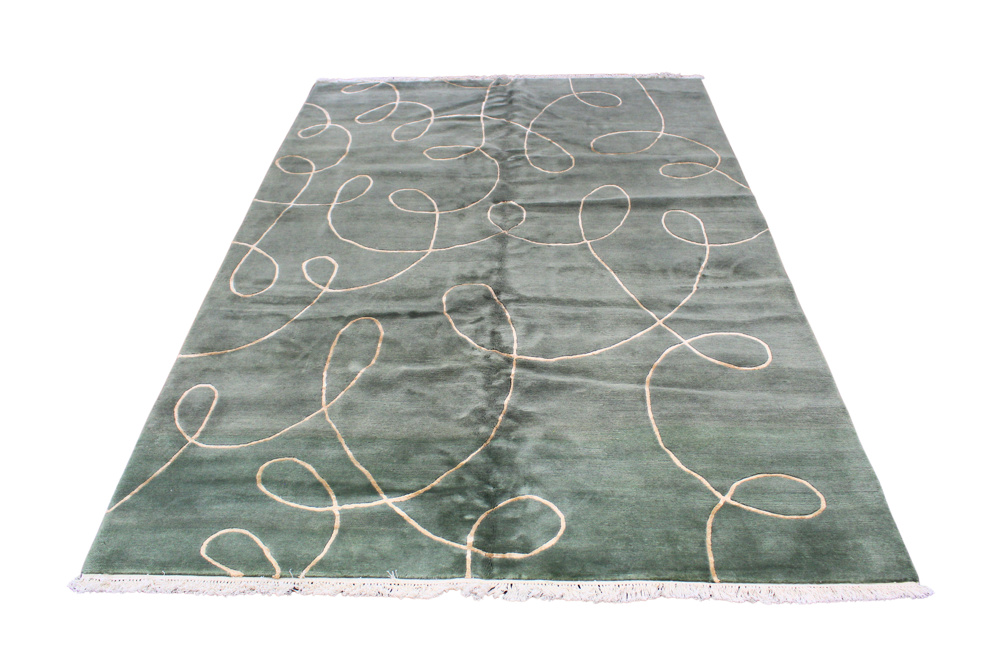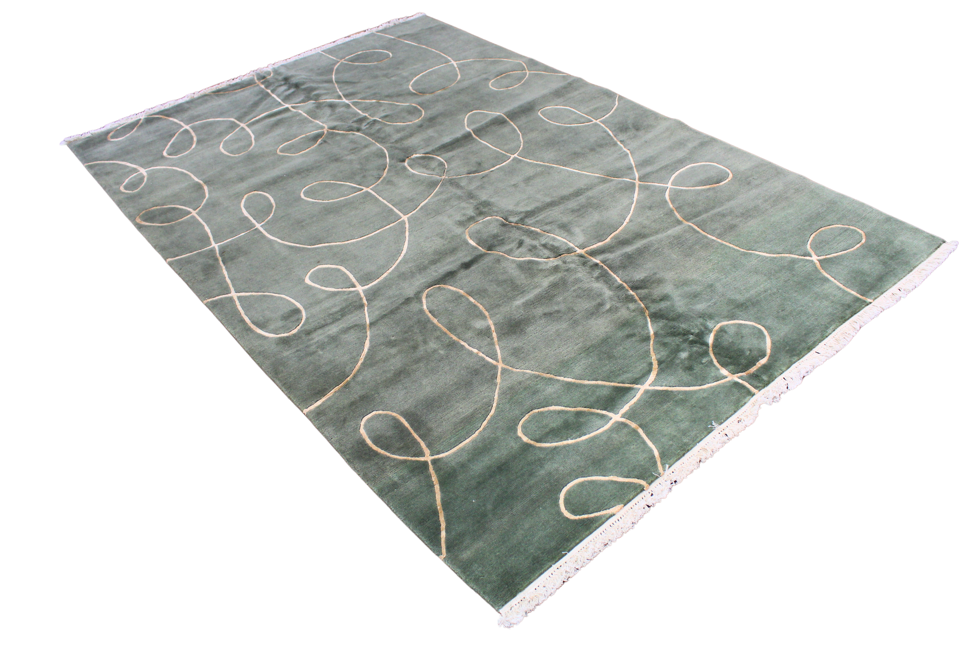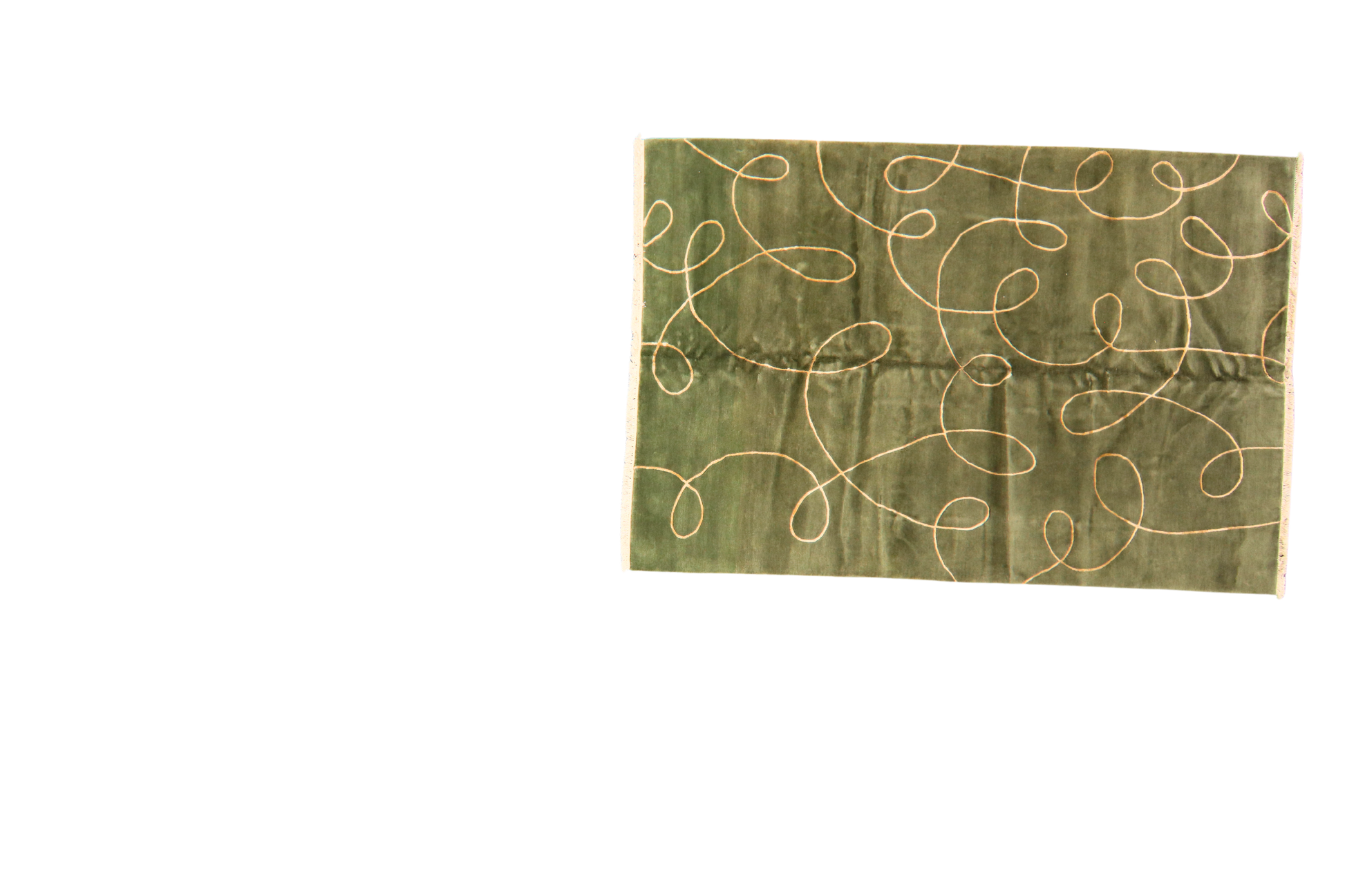 Minimalist with a playful twist, this hand-knotted Nepalese rug (6 × 9 ft) makes a striking contemporary statement. Its velvety olive green field serves as a serene base for a looping ivory line motif that swirls across the surface like freehand calligraphy. The simplicity of form and the luxury of texture create a beautiful tension — modern yet organic, refined yet relaxed.
