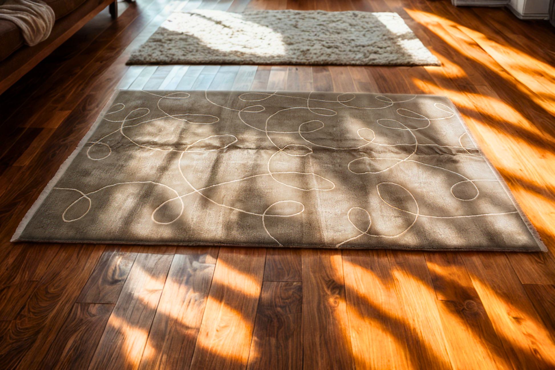 This rug is perfect for interiors that favor calm palettes and bold design — ideal beneath a glass coffee table, in a modern dining area, or as a visual centerpiece in a chic bedroom. Its subtle sheen and rich pile give it a high-end feel, while the linework adds a sense of movement and artful spontaneity.