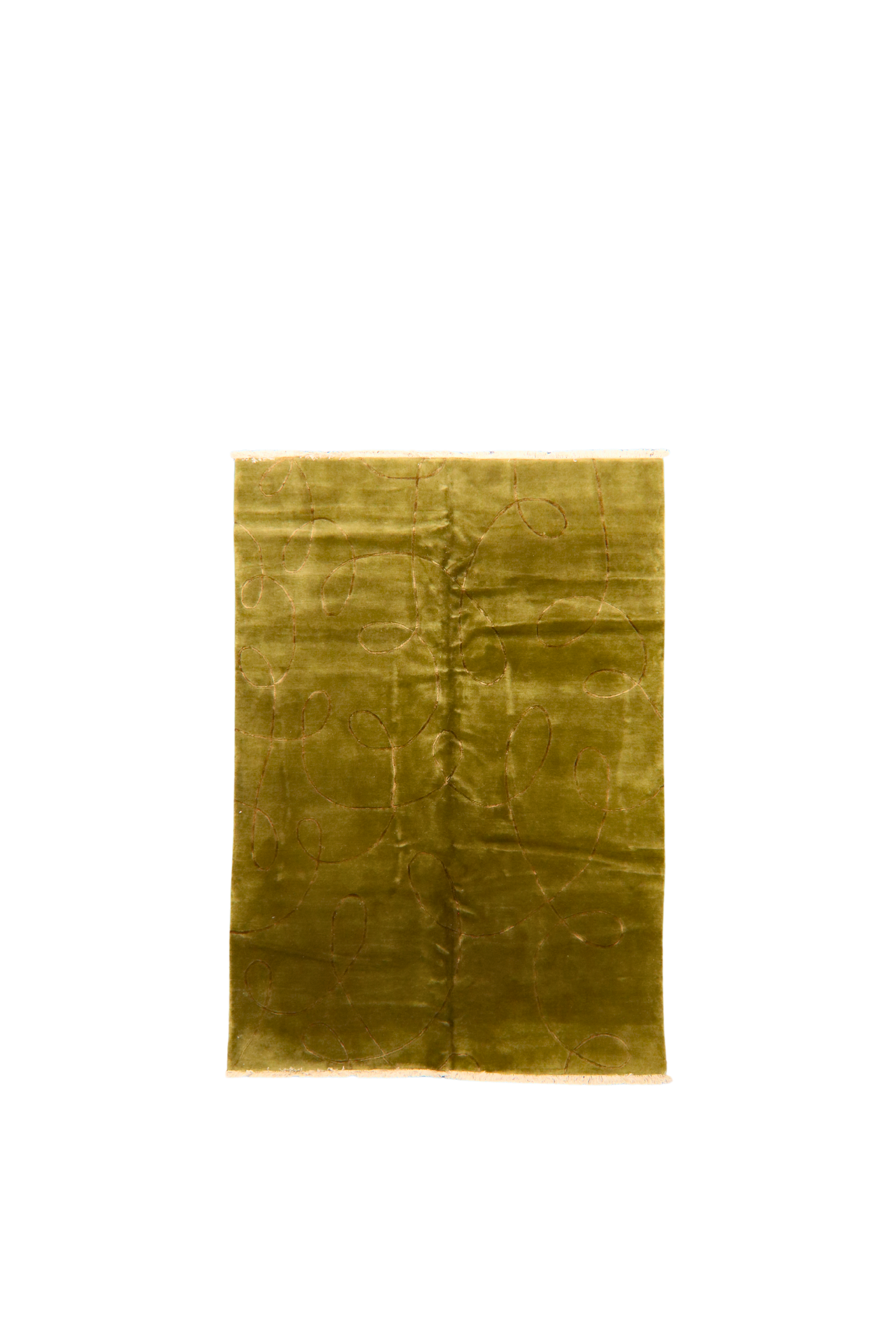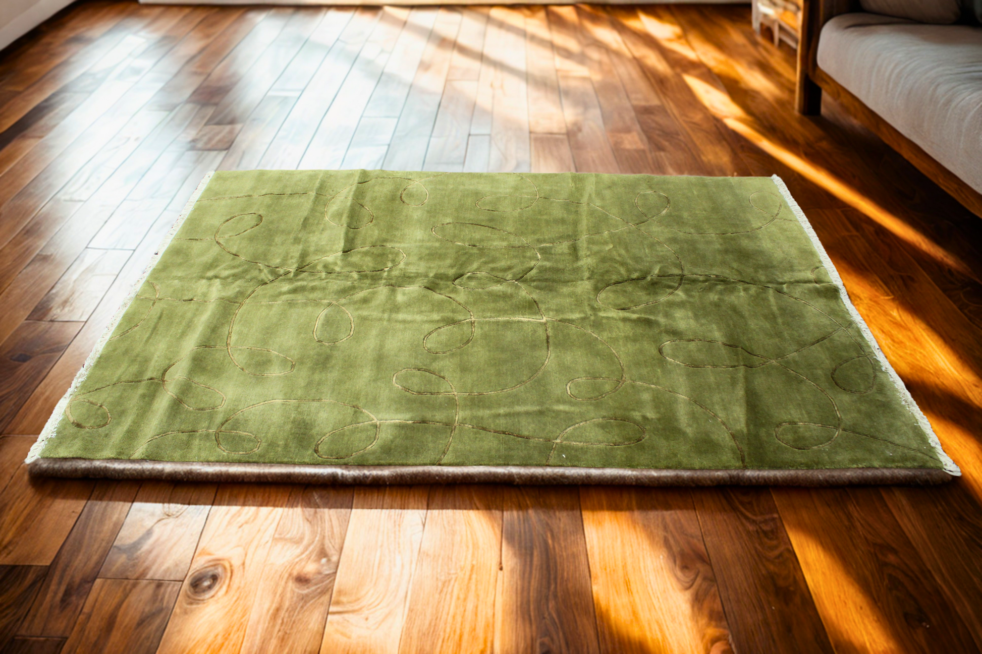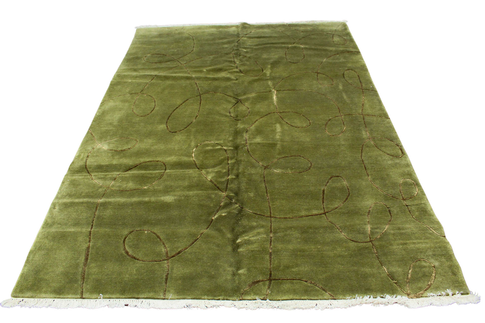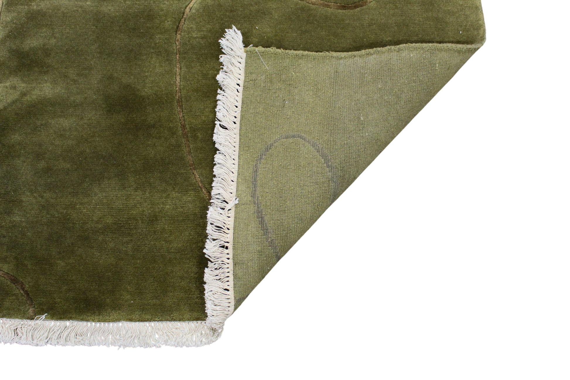 Soft and subtly artistic, this Nepalese contemporary rug (5.11 × 8.6 ft) brings modern elegance to life through minimalist expression. Its rich olive green field is adorned with a swirling linear motif in a warm brown tone — forming a pattern that feels spontaneous, fluid, and playful. The velvet-like wool pile reflects light beautifully, giving the rug a lush, upscale finish.
