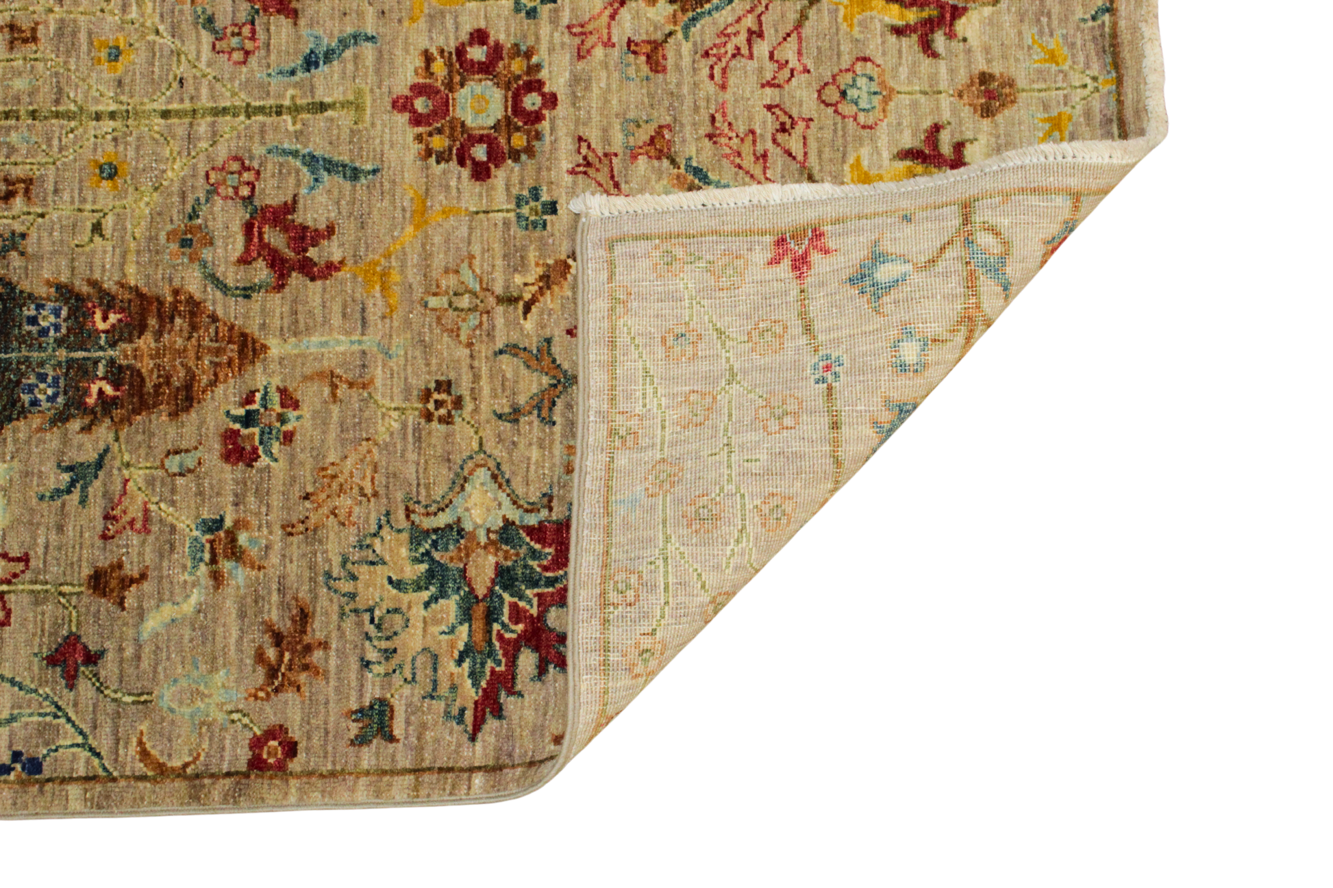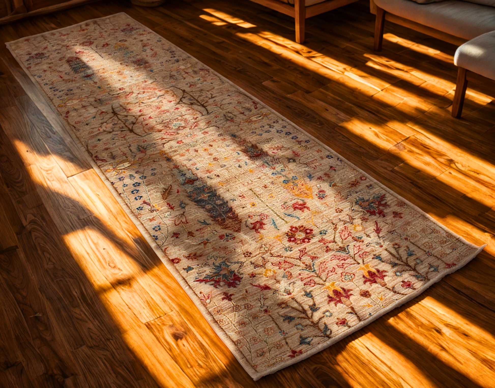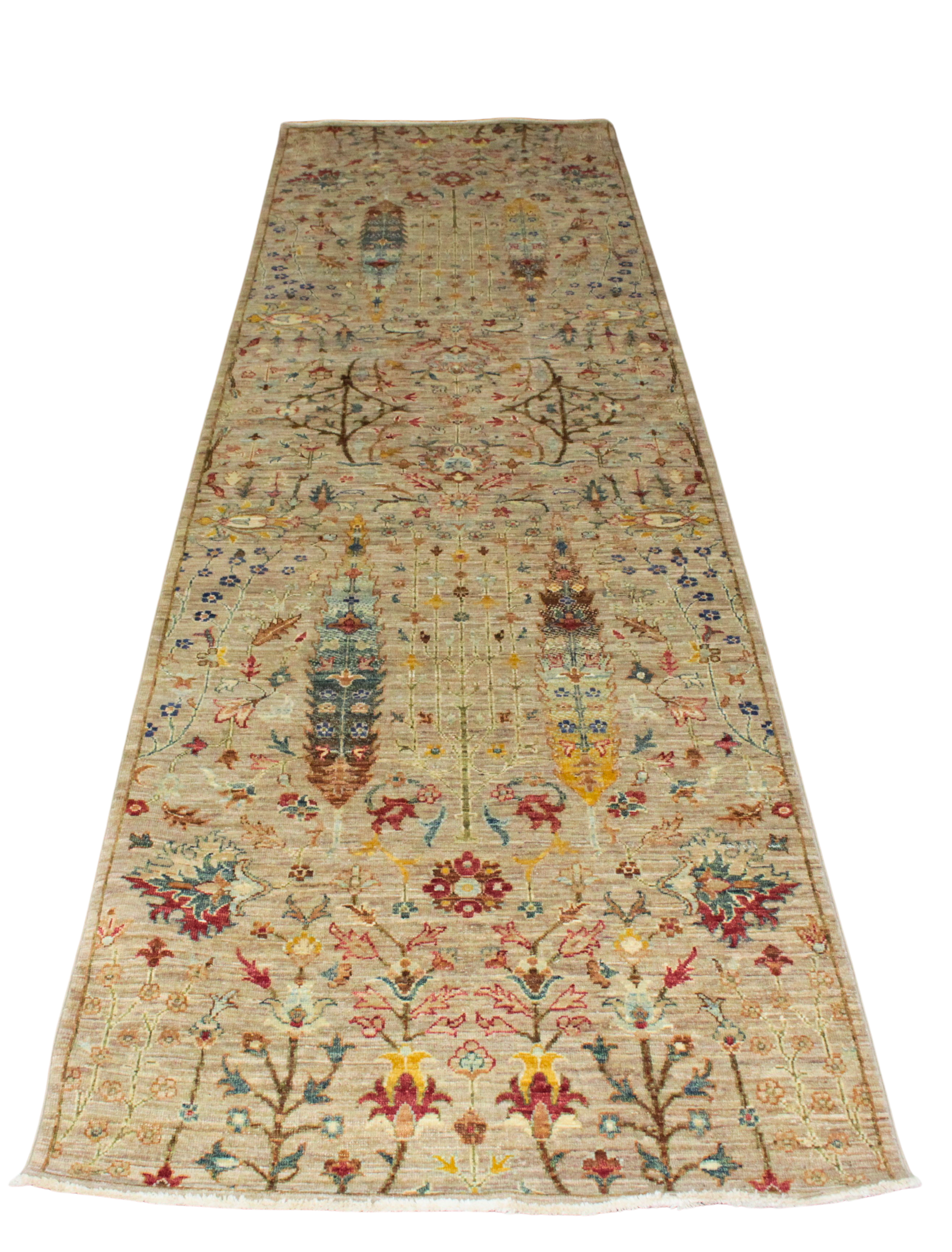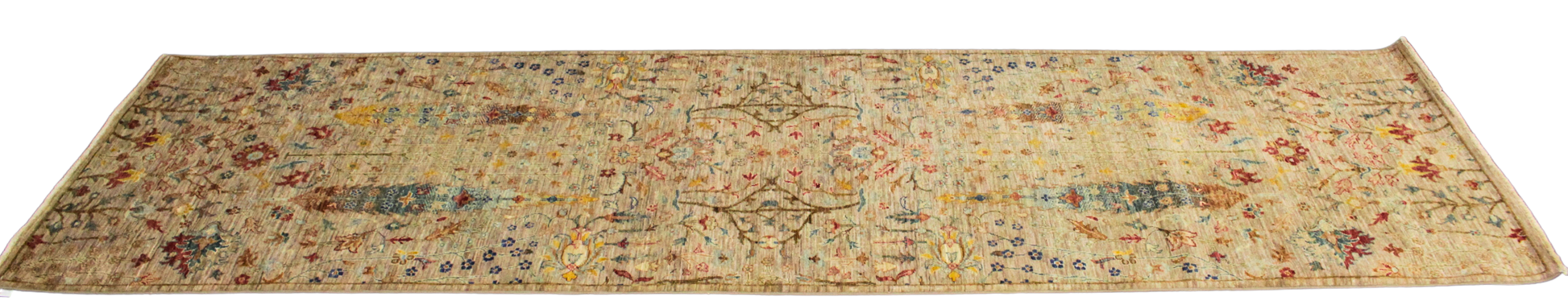 This light and airy Afghan Tabriz runner captures the joyful elegance of a sunlit meadow in full bloom. Woven on a warm ivory-beige base, the rug features a delicate field of floral motifs in faded sapphire, soft coral, buttery yellow, and pale sage—giving the impression of wildflowers scattered on antique parchment.