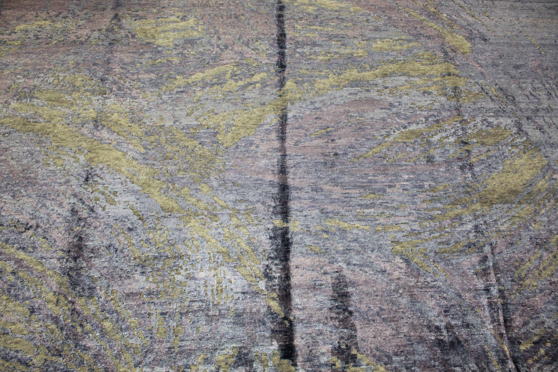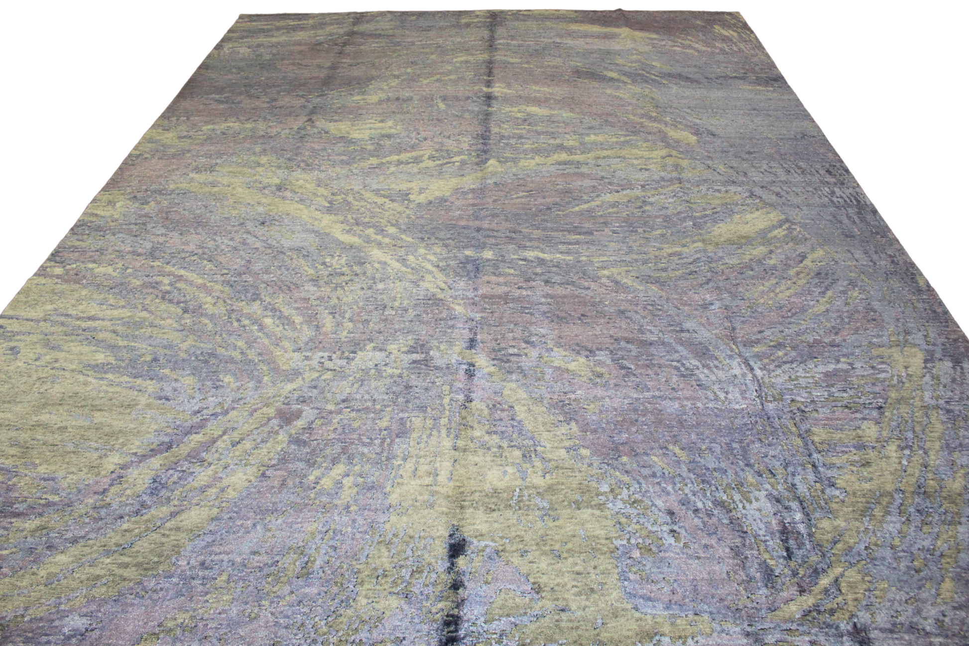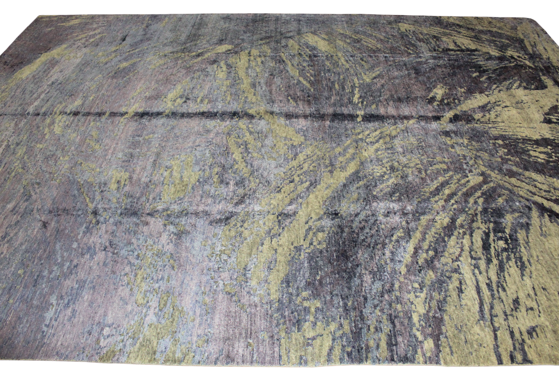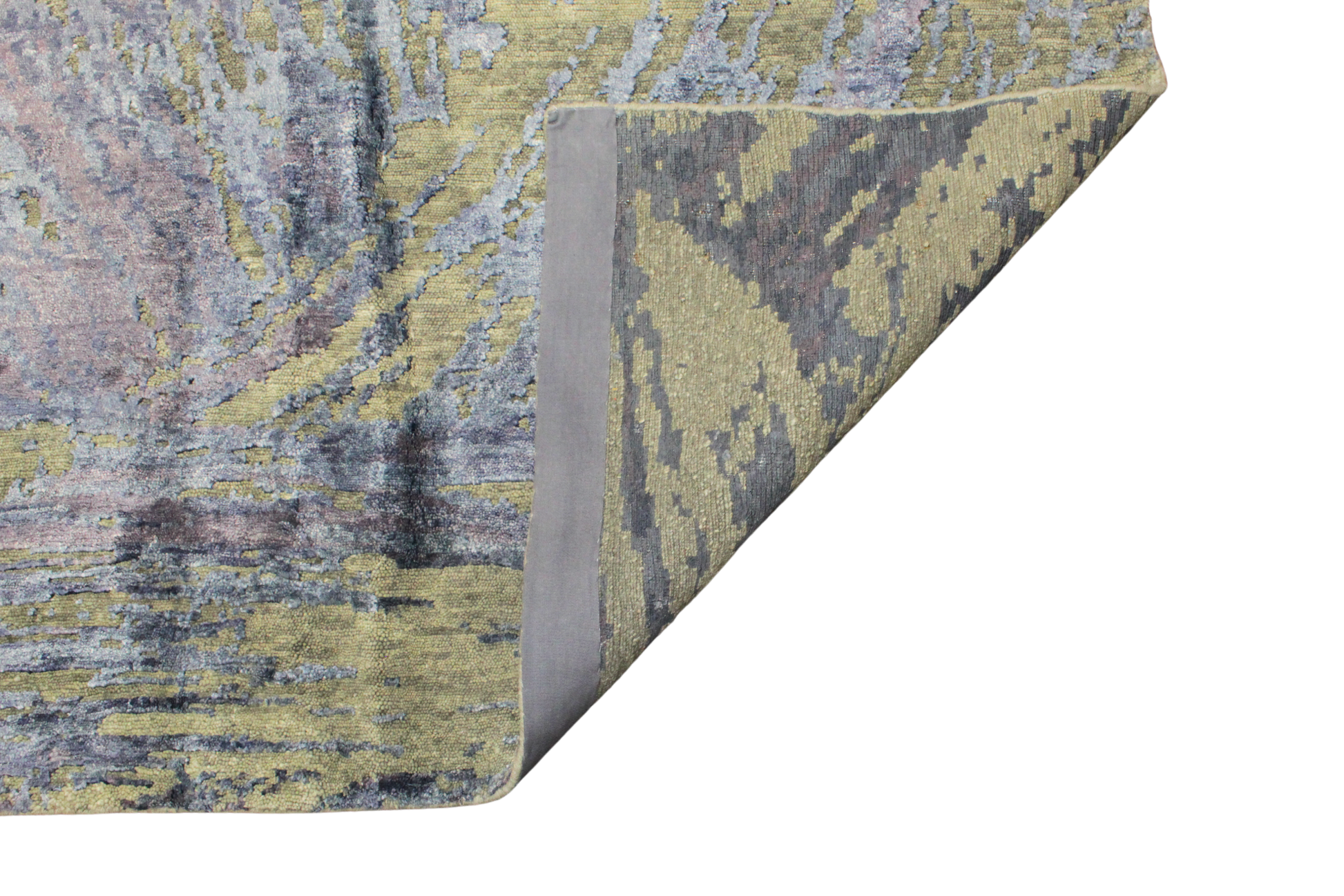 A canvas of fluid motion and layered tones, this contemporary Indian rug (9.7 x 13.9 ft) evokes the sweeping energy of abstract expressionist art. Its composition mimics the natural movement of water, smoke, or weathered stone — with soft swirls of blue-gray, stormy lilac, charcoal, and golden cream flowing organically across the surface. The impression is serene yet dynamic, subtle yet captivating.
