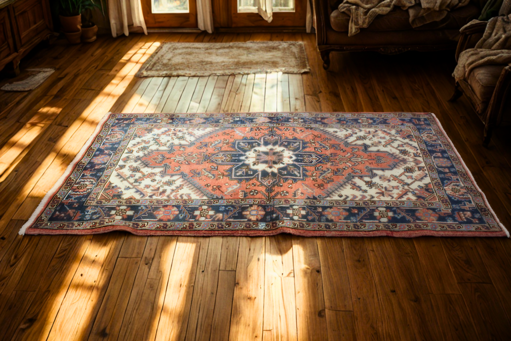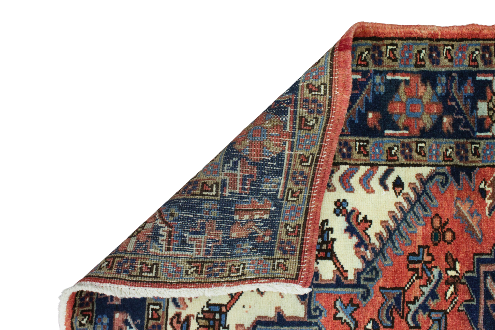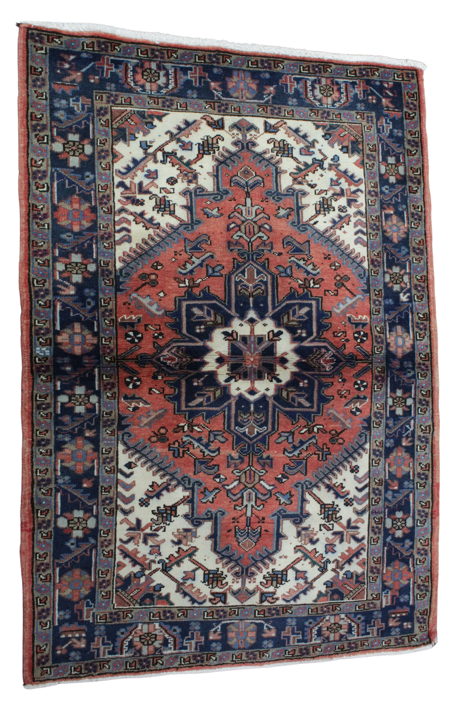 With its commanding medallion and bold contrast, this antique Heriz rug from persian measures 3.3 x 4.7 feet and radiates strength and tradition. A deep midnight blue medallion anchors the piece, surrounded by a vibrant terracotta red field and framed by angular botanical motifs in ivory and cobalt. The intricate border and strong geometric structure are trademarks of authentic Heriz craftsmanship, known for their durability and graphic appeal.