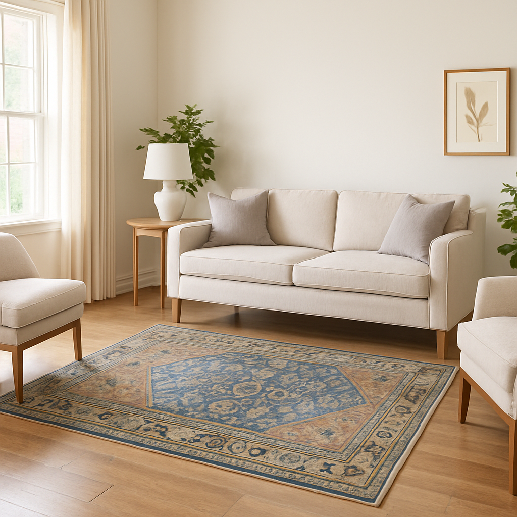 This finely detailed 3.5′ × 5.1′ Mahal rug from Persia brings a glowing palette and tightly woven floral geometry to your space. The striking medallion-style design is anchored by a cobalt blue field with angular vines, rosettes, and diamond lattice motifs, all framed by soft terracotta spandrels and an olive-toned border. The use of burnt orange and warm sand tones gives the piece an earthy, grounded feel that balances beautifully against the energetic composition.