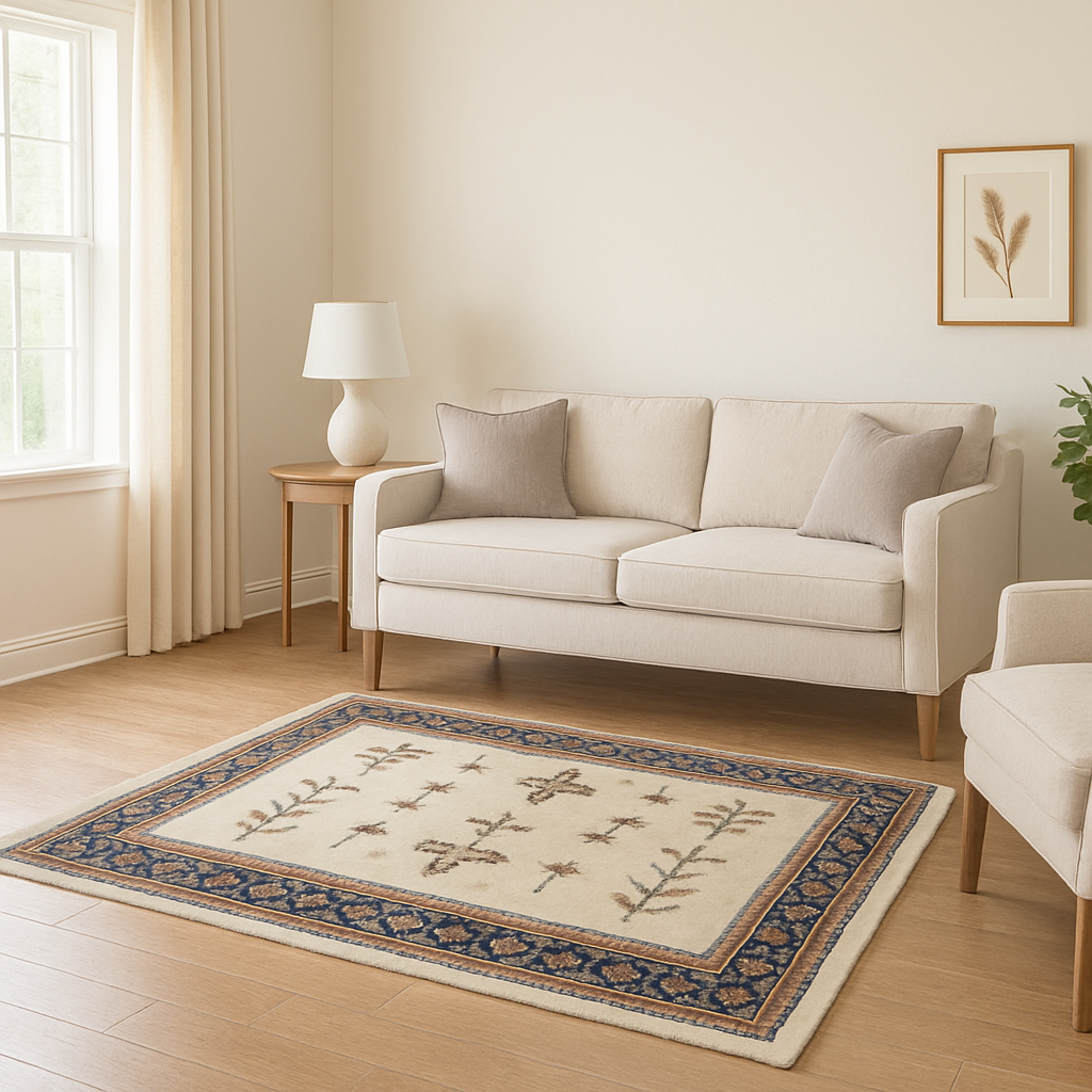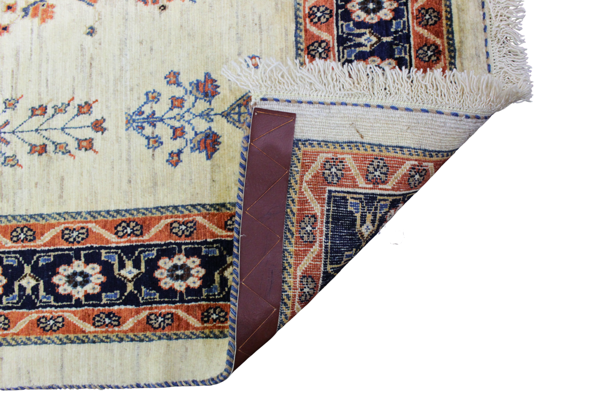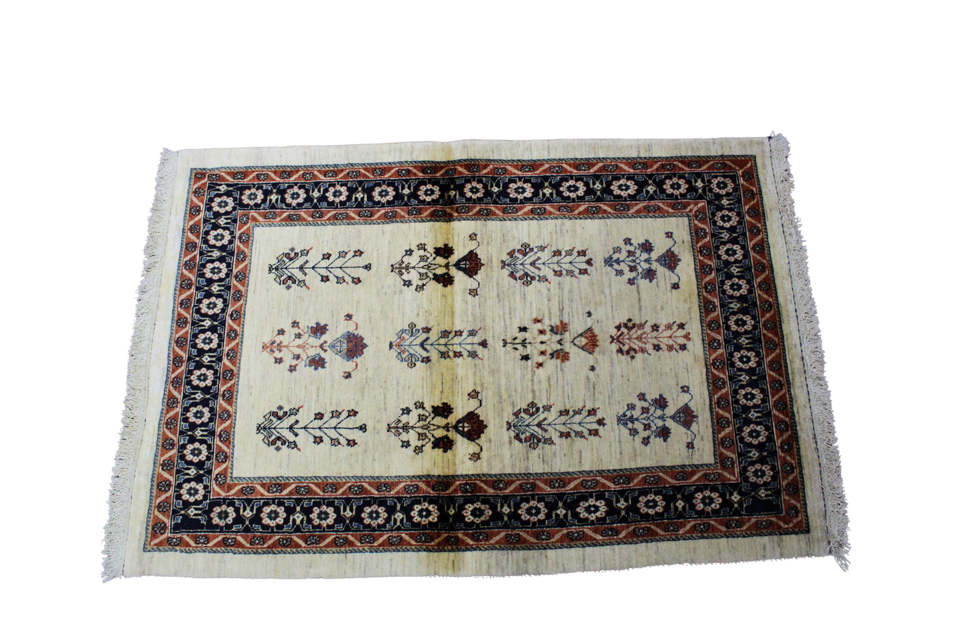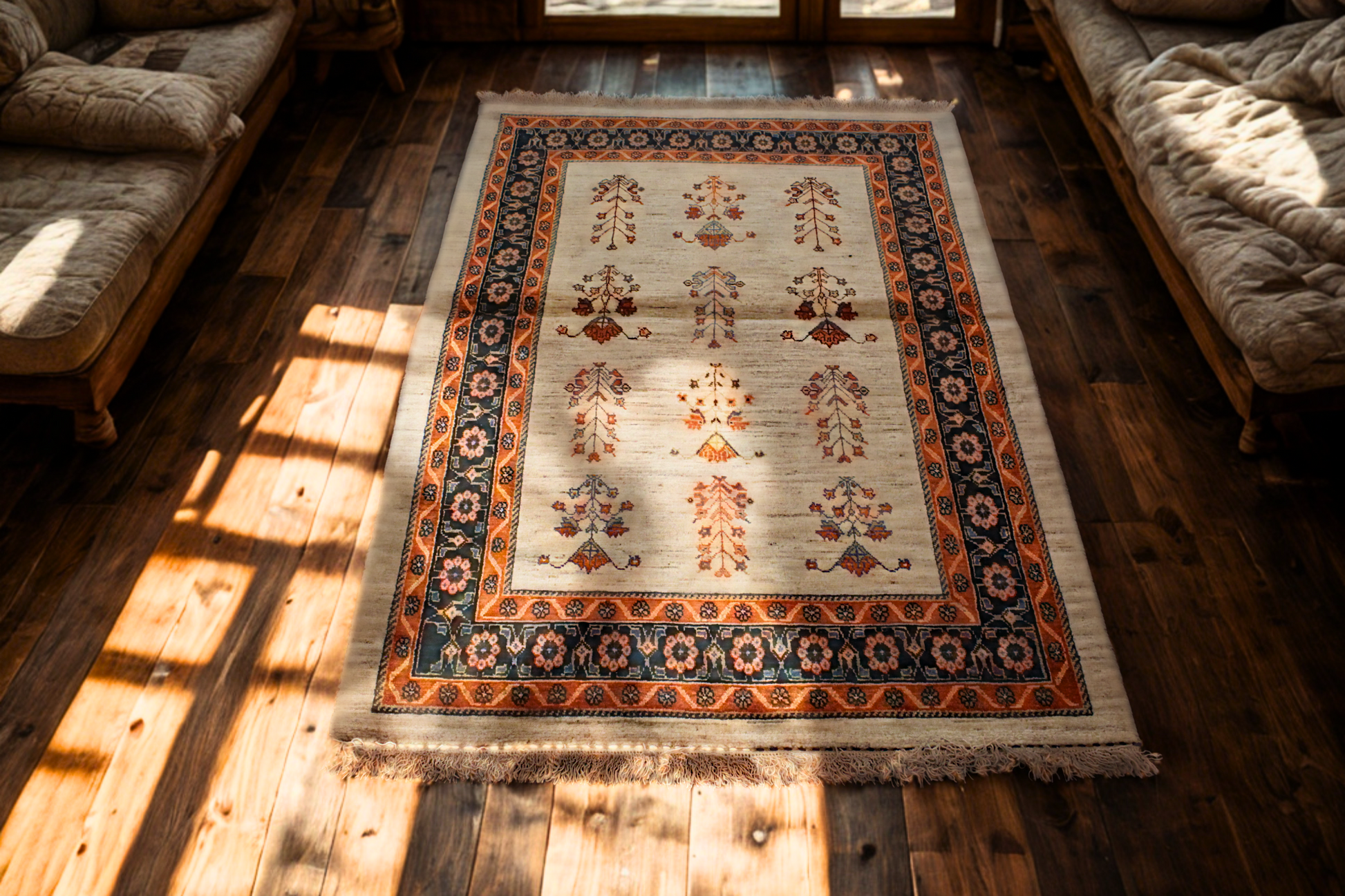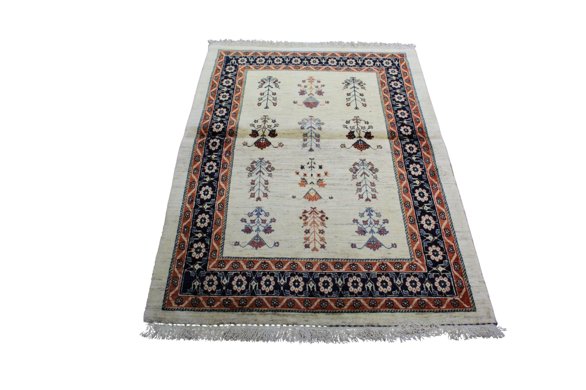 This charming 3.4′ × 4.9′ Gabbeh rug from Persia exemplifies the quiet beauty of tribal minimalism. Woven in a creamy ivory field, it features a delightfully scattered pattern of stylized flowers and tree-of-life motifs, arranged in neat horizontal rows. Each motif is executed in muted tones of indigo, rust, soft brown, and slate blue, giving the rug a whimsical, folk-art quality. A navy border filled with rosettes and a subtle terracotta inner frame tie the piece together with grounded elegance.