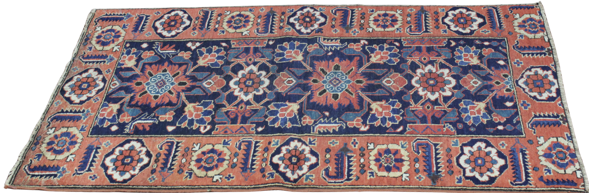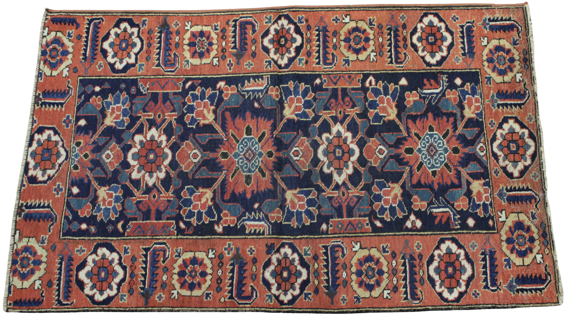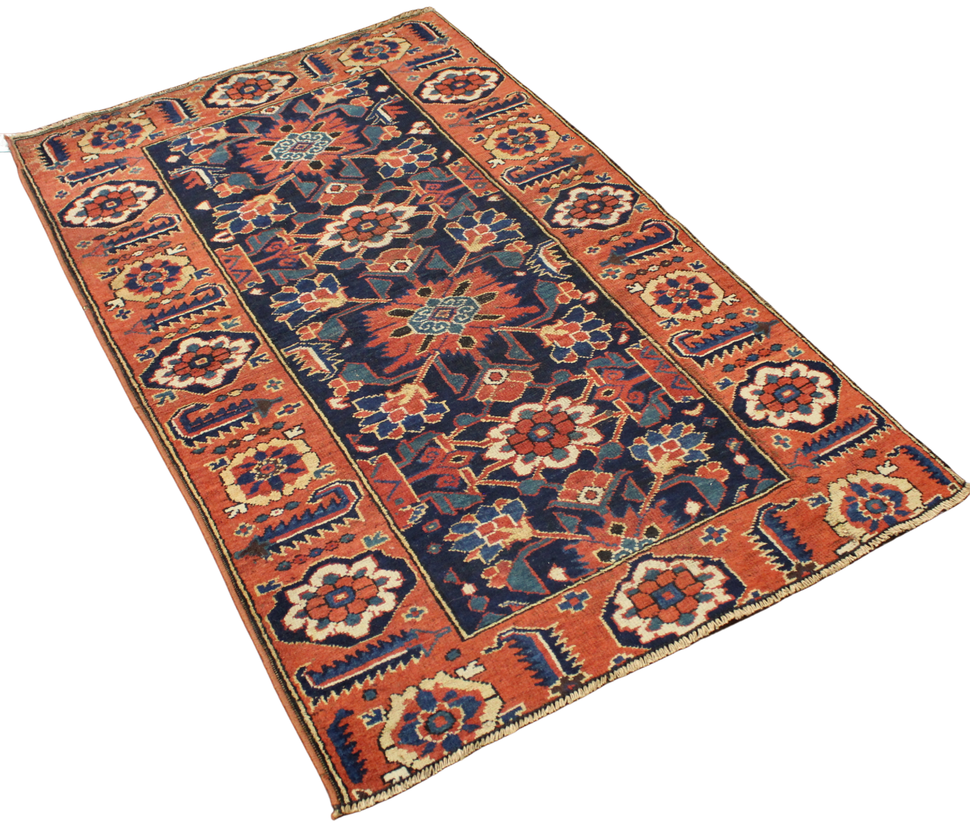 Rich in character and bursting with folkloric charm, this antique Malayer rug (3 × 5 ft) presents a captivating allover floral lattice design framed by a bold brick-red border. The central navy field is adorned with rosette-like blossoms and stylized petals, arranged in a rhythmic pattern that feels both vibrant and grounded. Radiating from each bloom is a fiery symmetry that reflects the artistic spirit of Malayer’s village weavers.