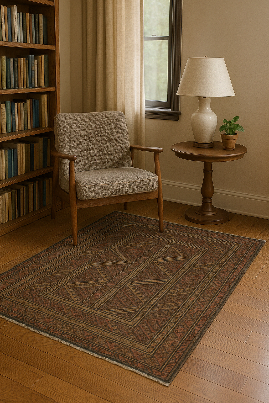The rug’s fine, dense weave and modest proportions make it ideal for layering in a rustic study, entryway, or small sitting area where handmade texture and subtle tribal design can shine.