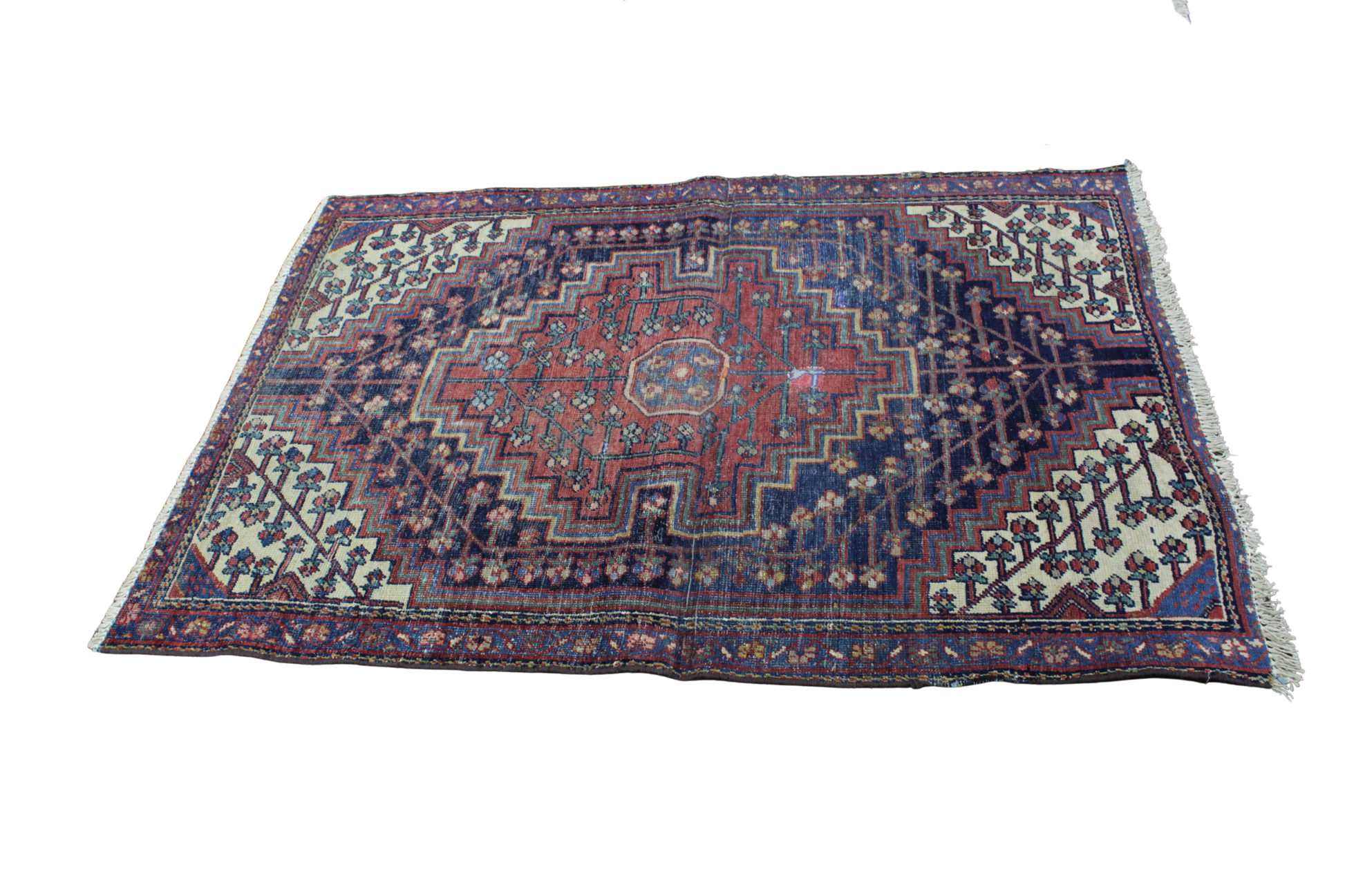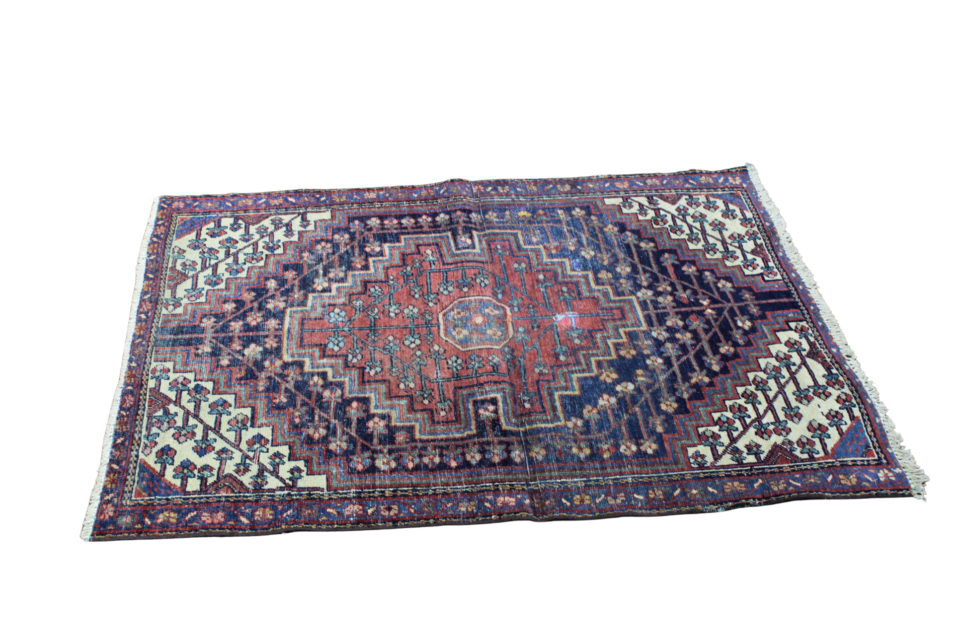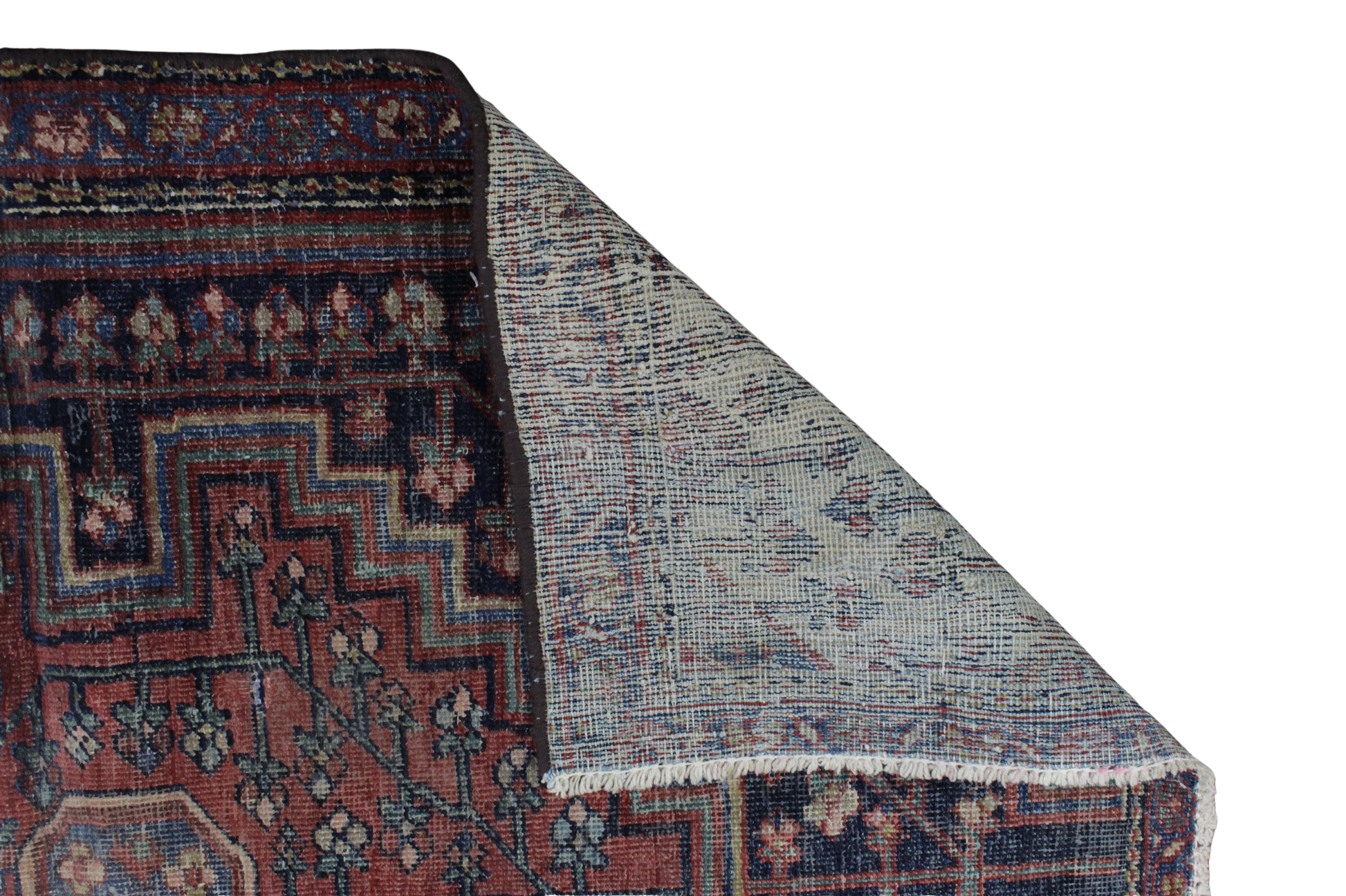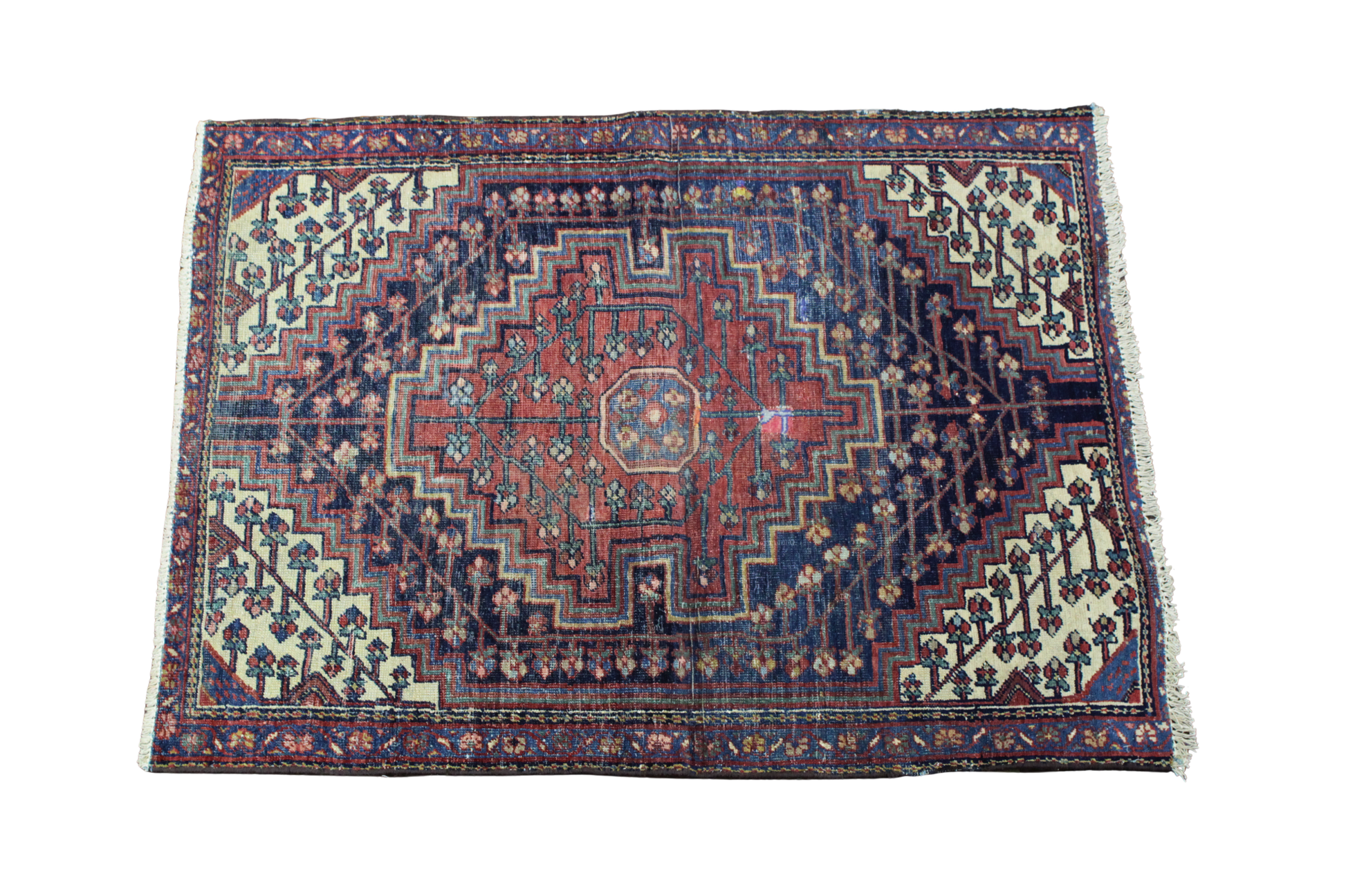 This vintage Hamedan rug from Persia (3.4 × 4.3 ft) presents a powerful visual statement in a modest size. The stepped diamond medallion in crimson red anchors the piece with a dynamic architectural structure, surrounded by a navy field brimming with delicate floral sprays. Corners feature classic Herati elements on an ivory base, softening the bold layout with elegant detail. The deep abrash and patina across the wool pile reflect its handmade heritage and years of natural wear, giving the rug an unmistakable vintage charm.