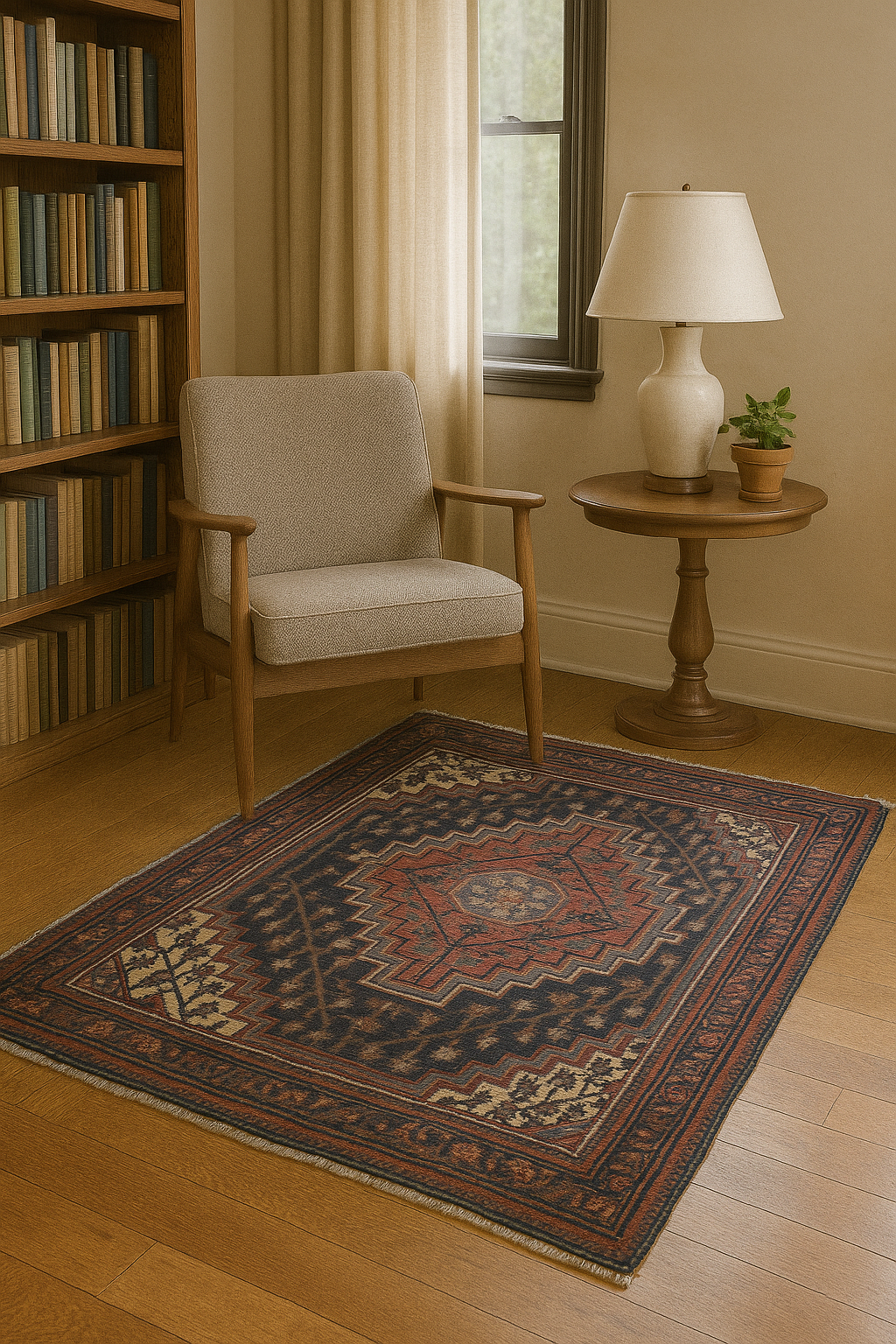 Bold Geometry, Woven Grace — Hamedan Rug from Persia (3.4 × 4.3 ft)