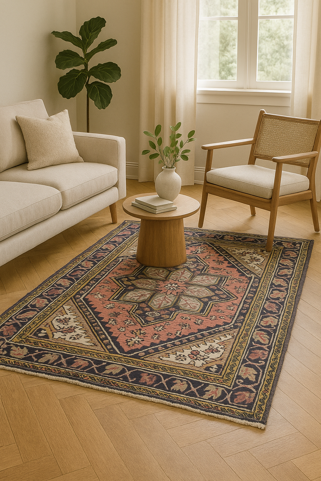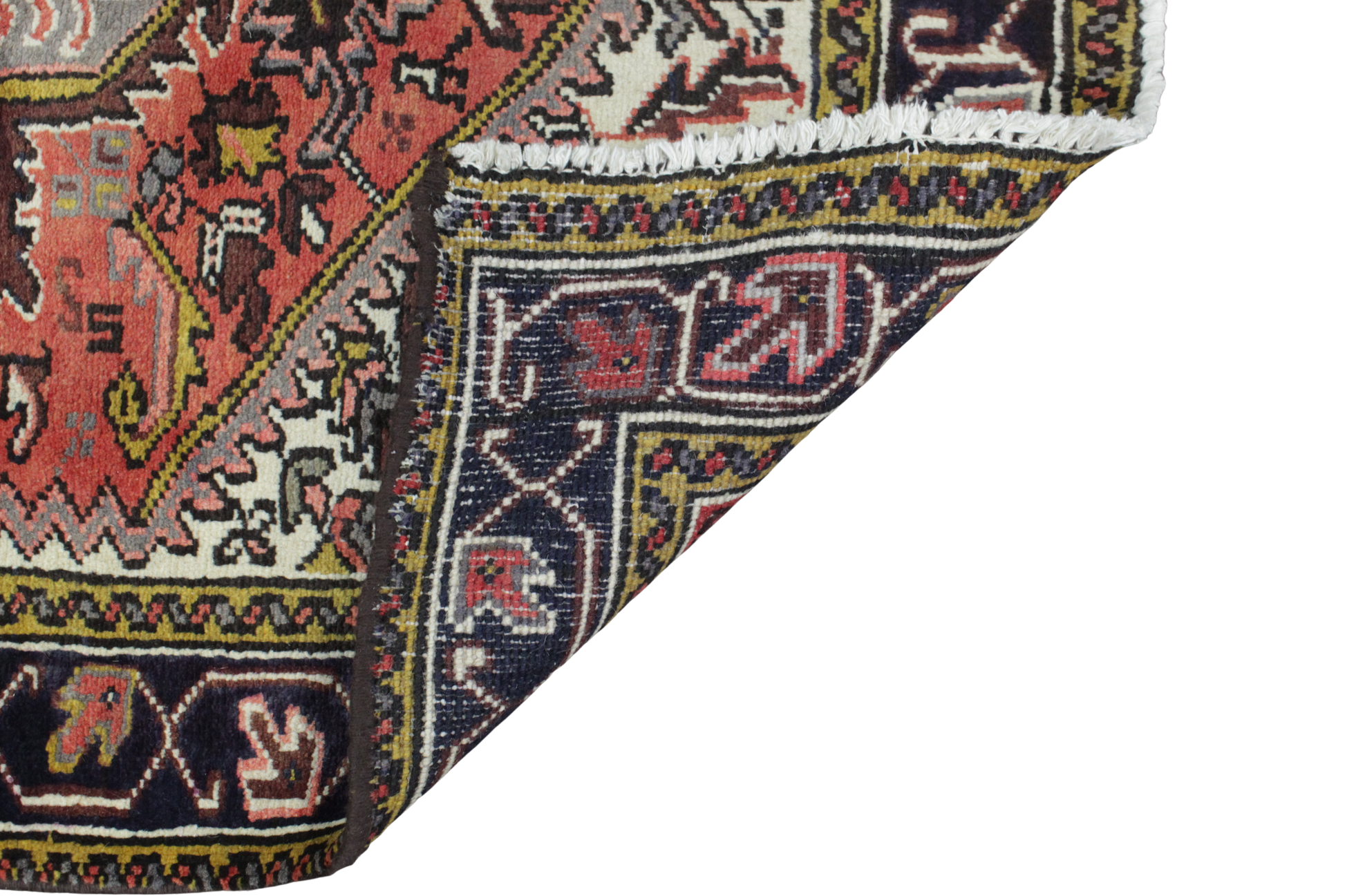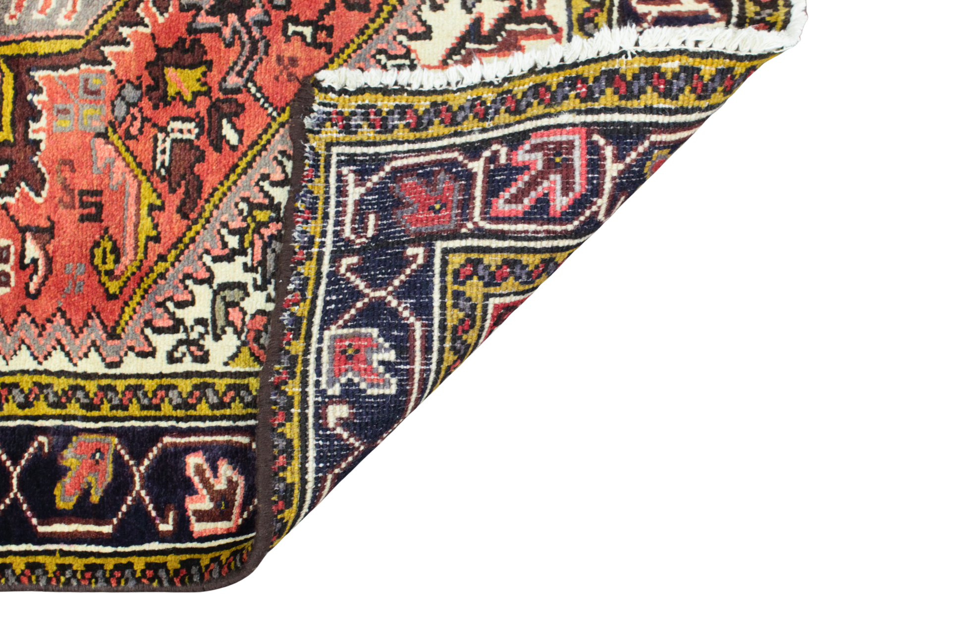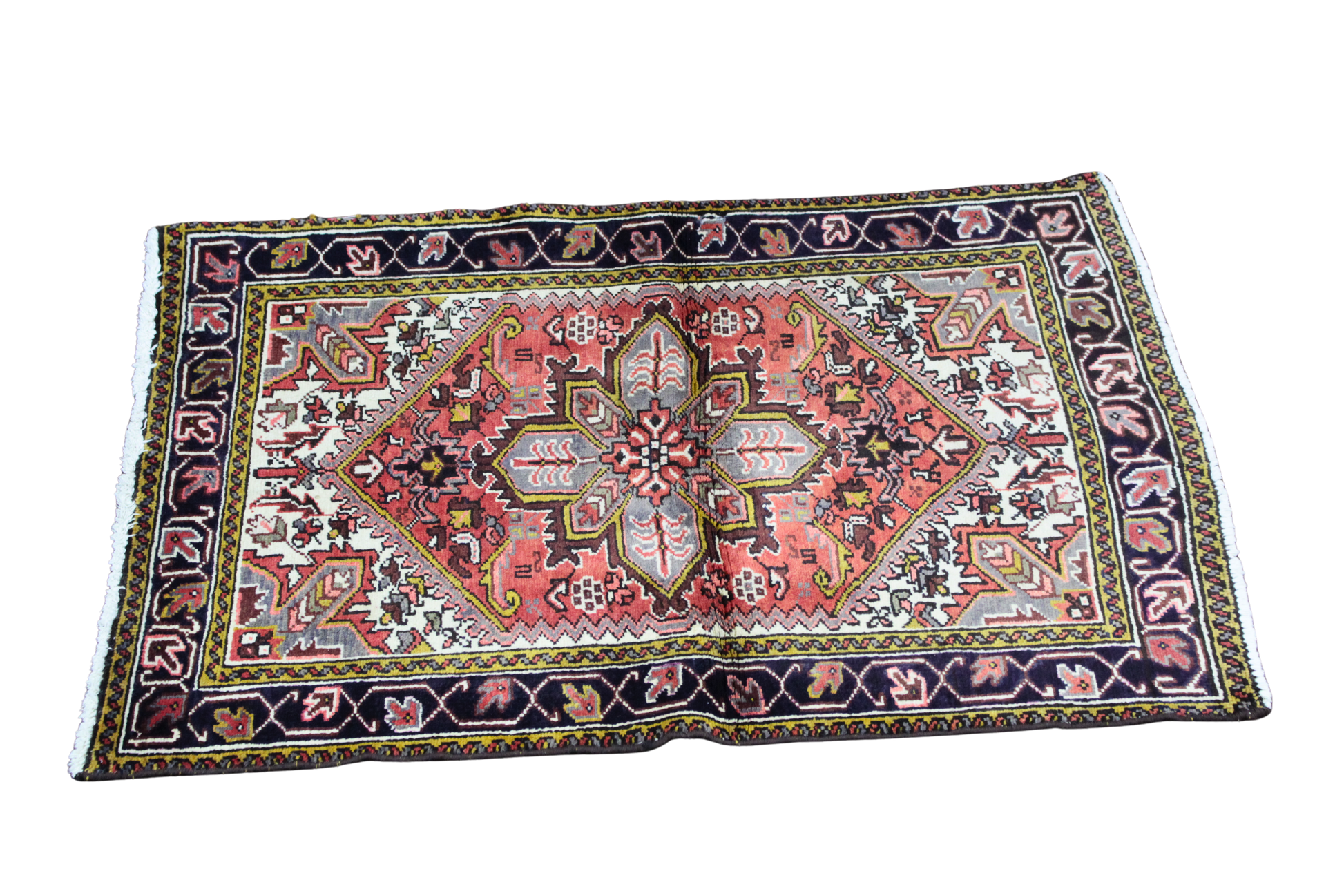 Heriz rugs are prized for their durability and rustic charm, and this small-format example showcases the style's trademark structure and vibrancy in a versatile size — ideal for entryways, studies, or beneath a side table.
