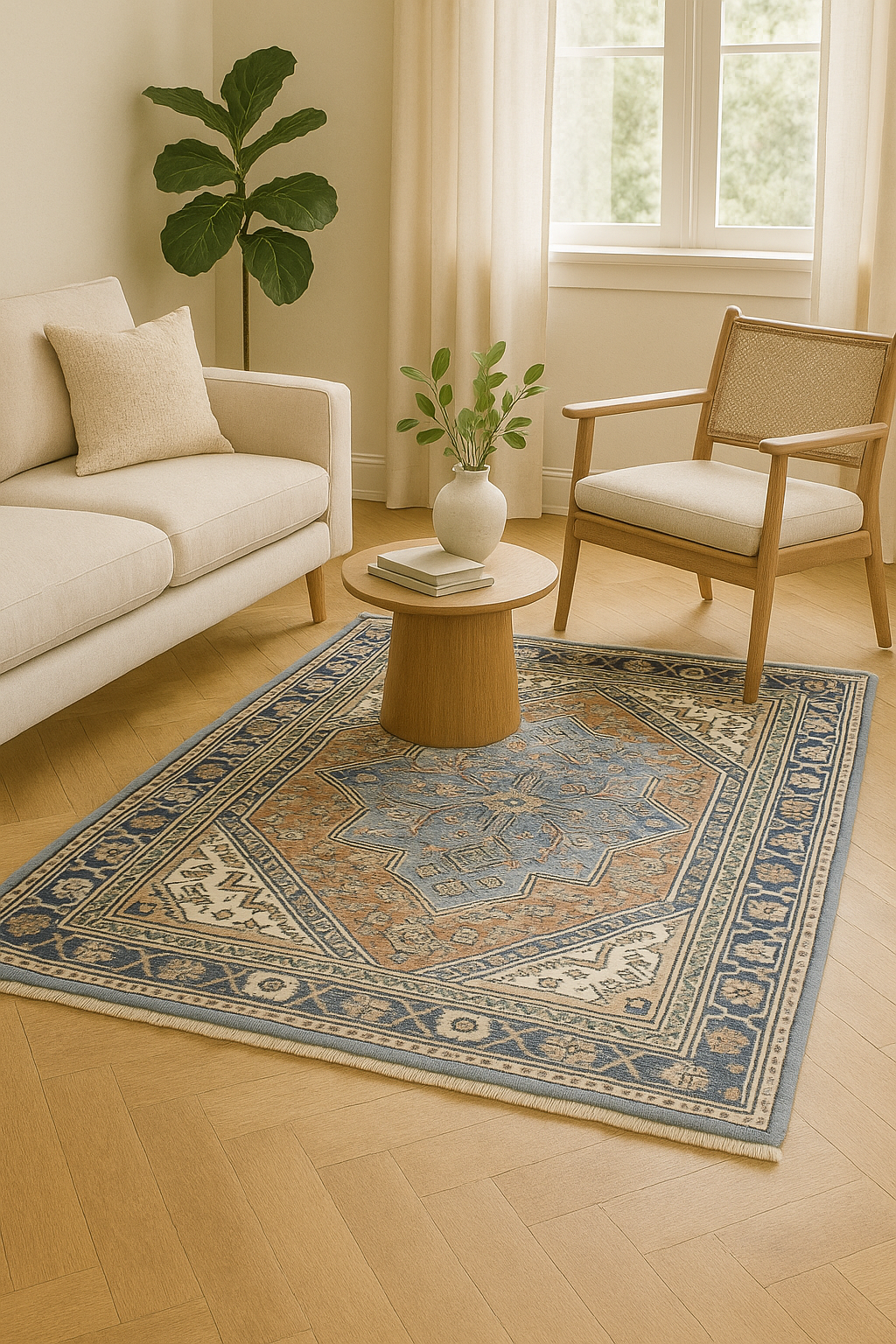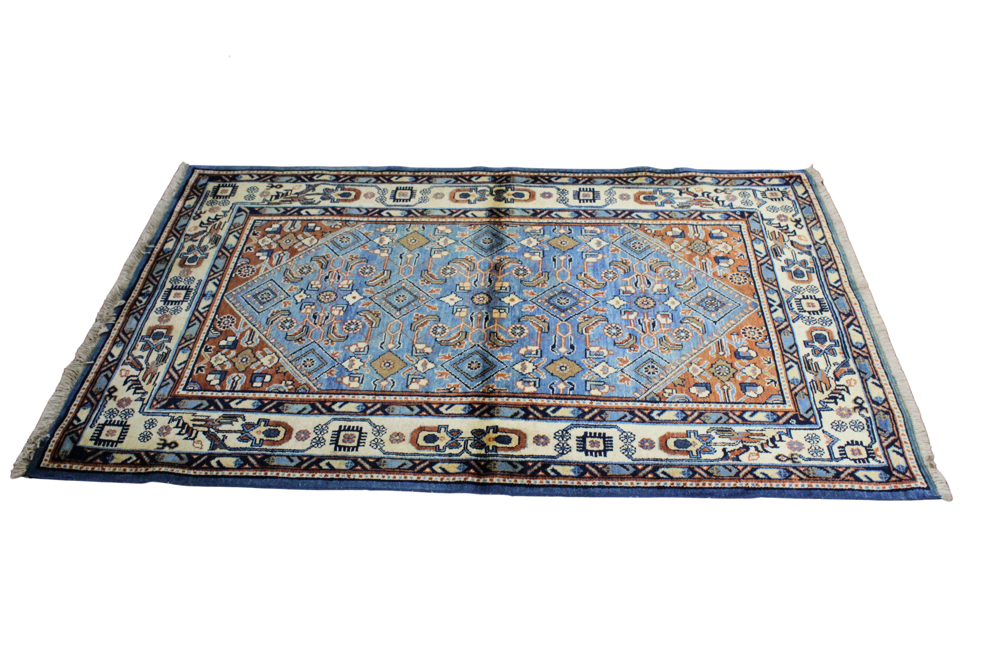 A rare expression of calm and balance, this Persian Heriz rug (3.7 × 5.5 ft) features a cool-toned color palette that softens the bold geometry for which the Heriz region is famed. The pale denim blue field is framed by copper-toned corner spandrels and centers a large diamond medallion filled with intricate floral and vine motifs. The ivory border, adorned with stylized rosettes and vine scrolls, adds a crisp finish that lifts the entire design.