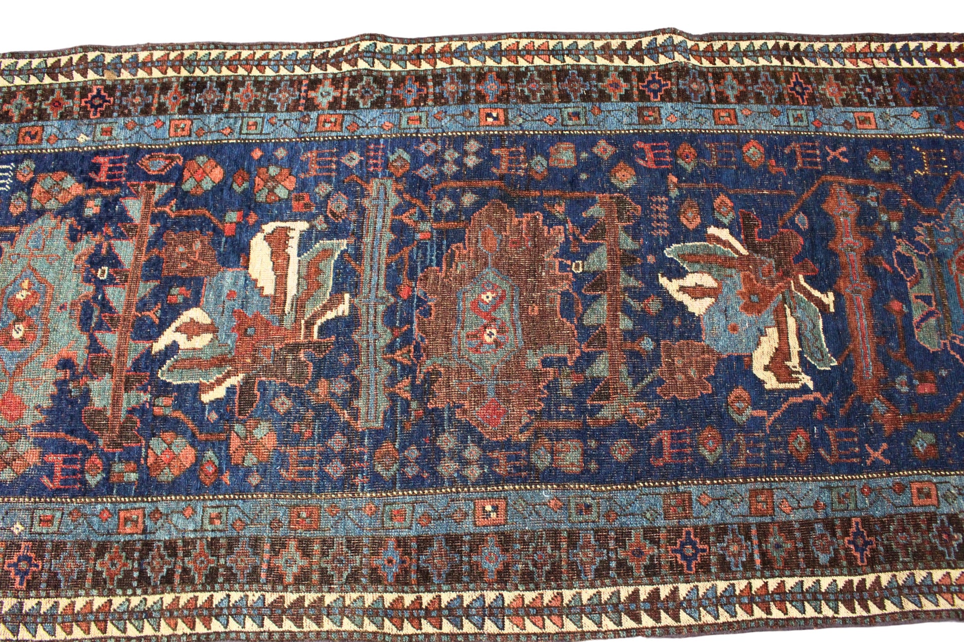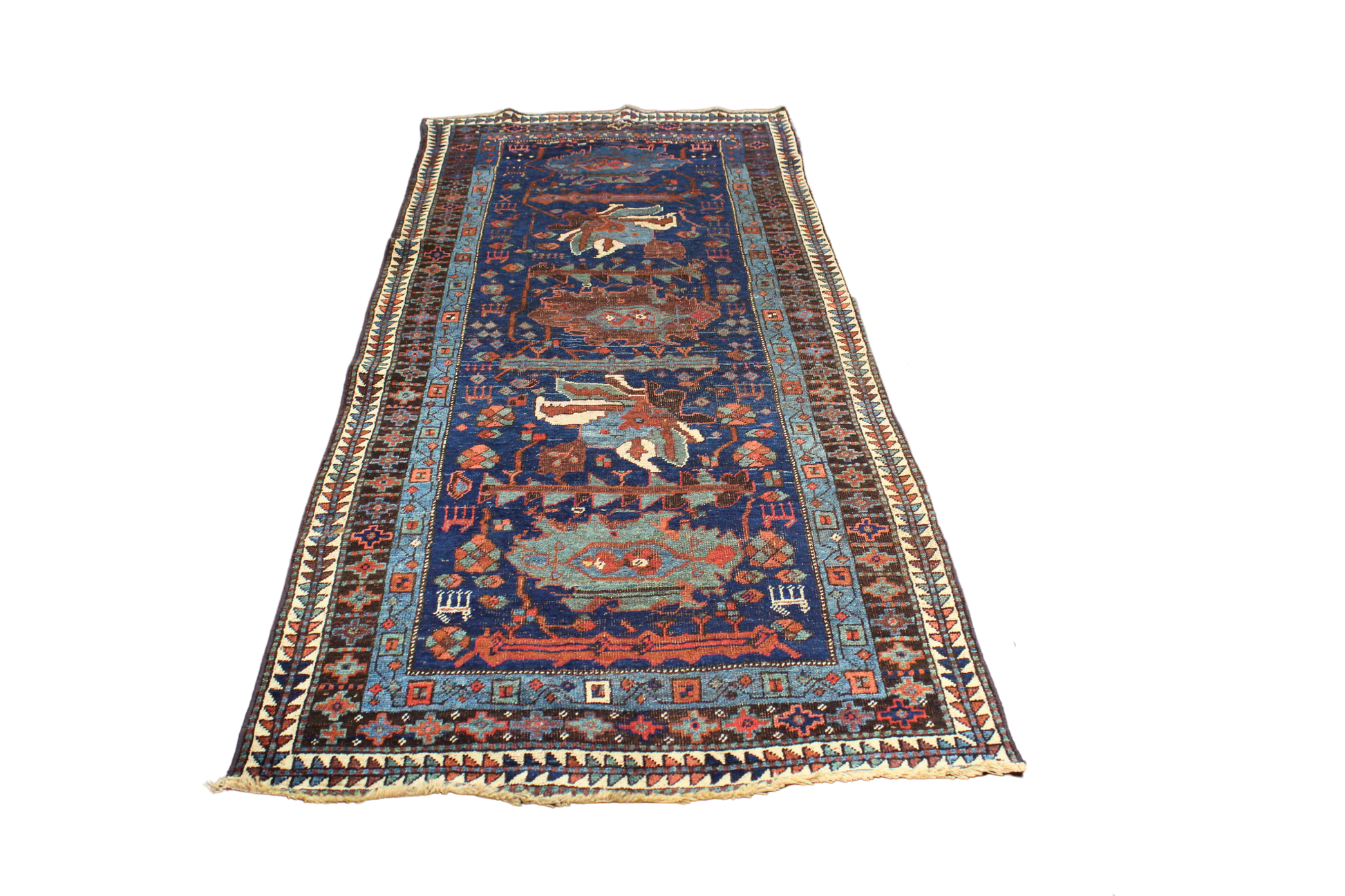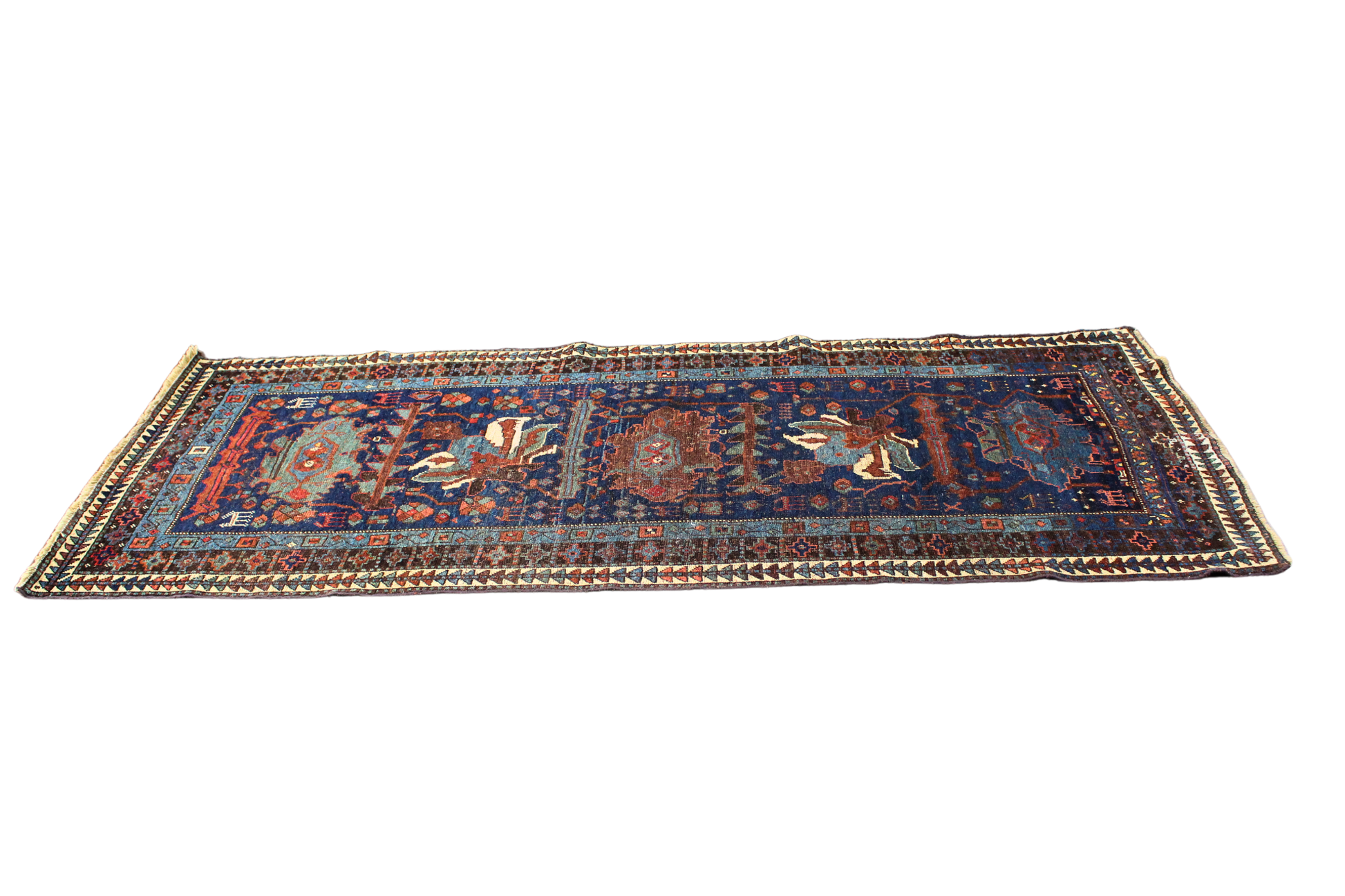 With its intense color saturation and bold tribal expression, this antique Bidjar rug (4 × 9.5 ft) embodies the fierce spirit and resilience for which Bidjar weavings are renowned. Deep navy and crimson tones dominate the field, punctuated by abstract lion-like figures and mythical symbols — woven storytelling in its most primitive and powerful form.