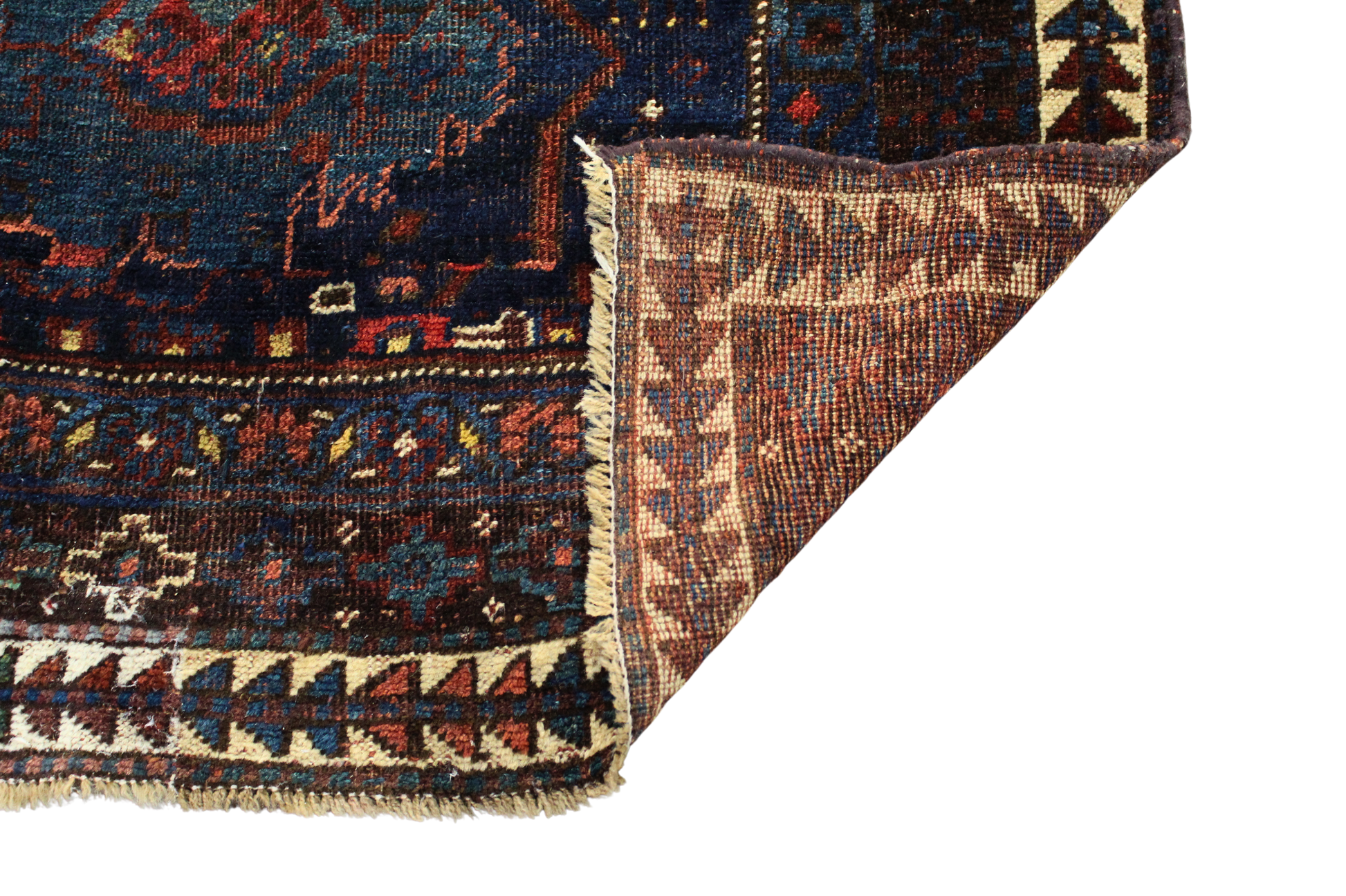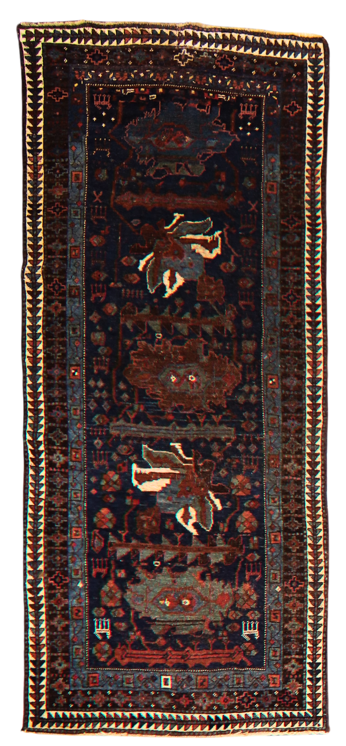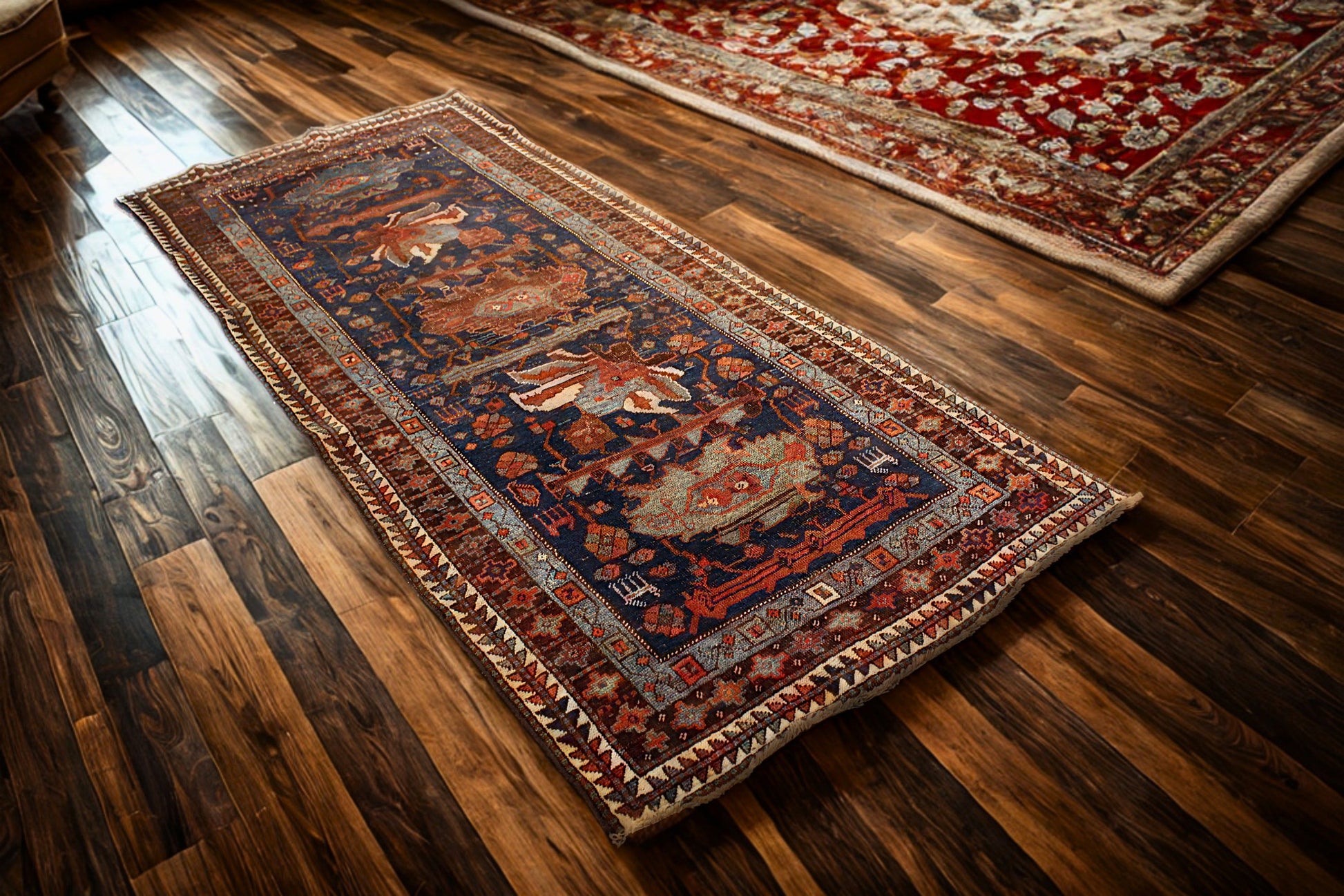 With its intense color saturation and bold tribal expression, this antique Bidjar rug (4 × 9.5 ft) embodies the fierce spirit and resilience for which Bidjar weavings are renowned. Deep navy and crimson tones dominate the field, punctuated by abstract lion-like figures and mythical symbols — woven storytelling in its most primitive and powerful form.