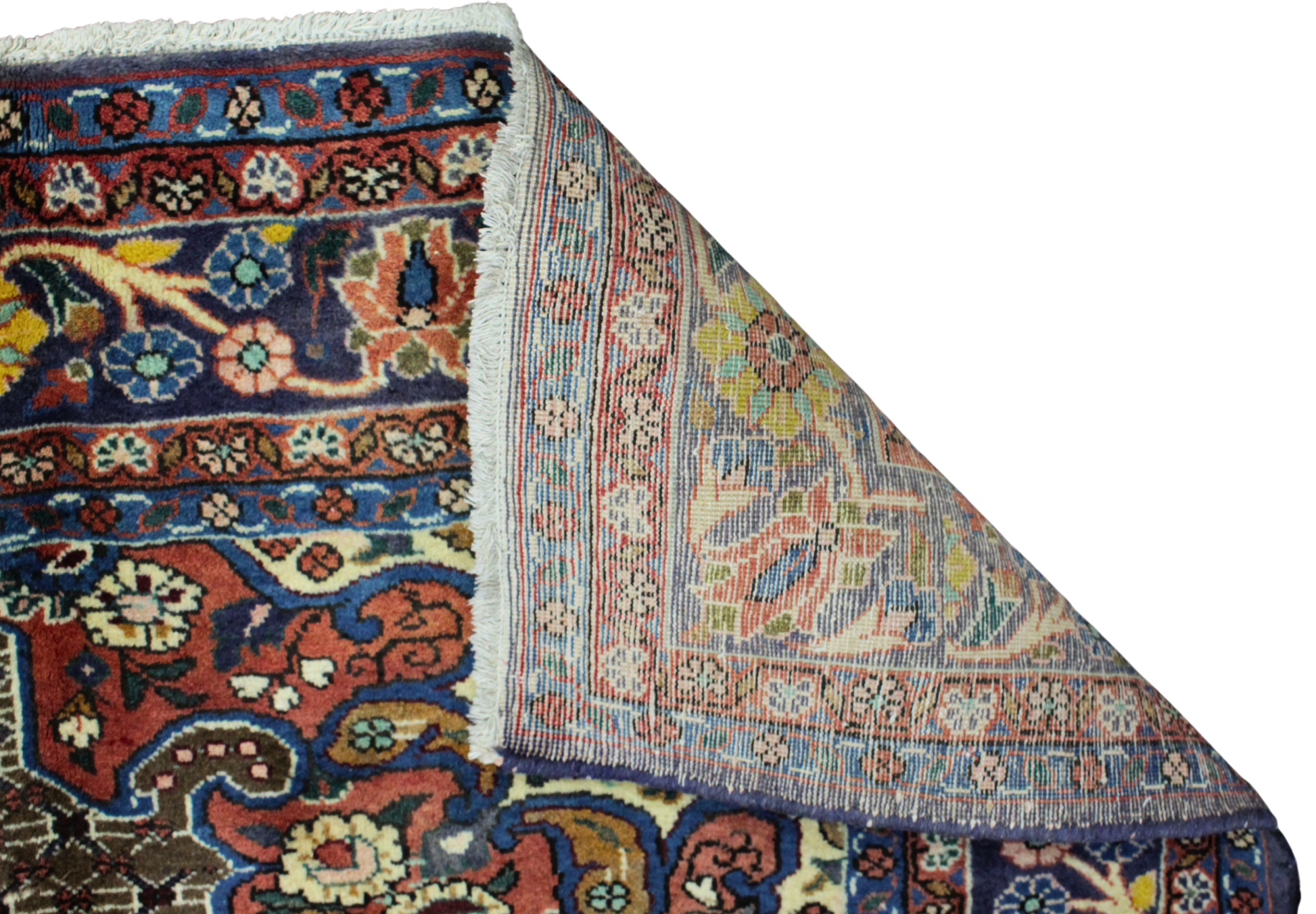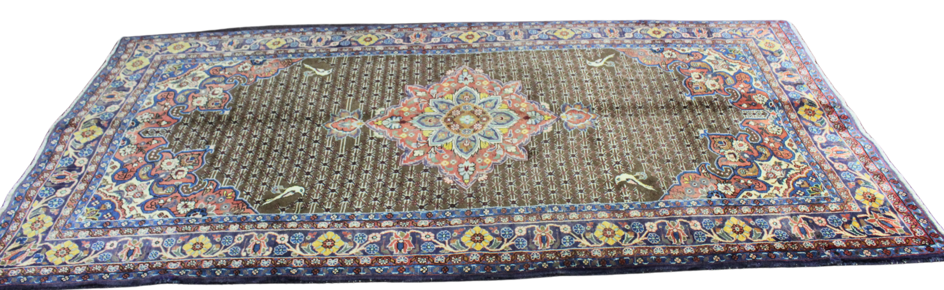 Surrounding the medallion is a repeating lattice of stylized floral pins set against a rich chocolate-brown ground. The four corner spandrels echo the medallion’s geometry and coloration, while the wide floral border is woven in midnight blue and filled with scrolling vines and classic Herati rosettes.