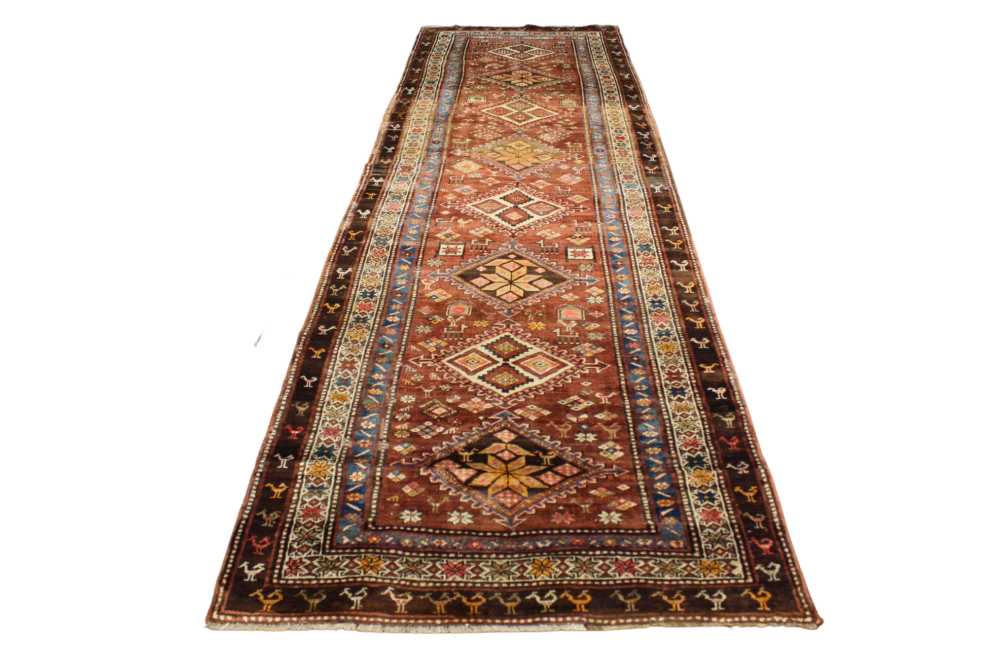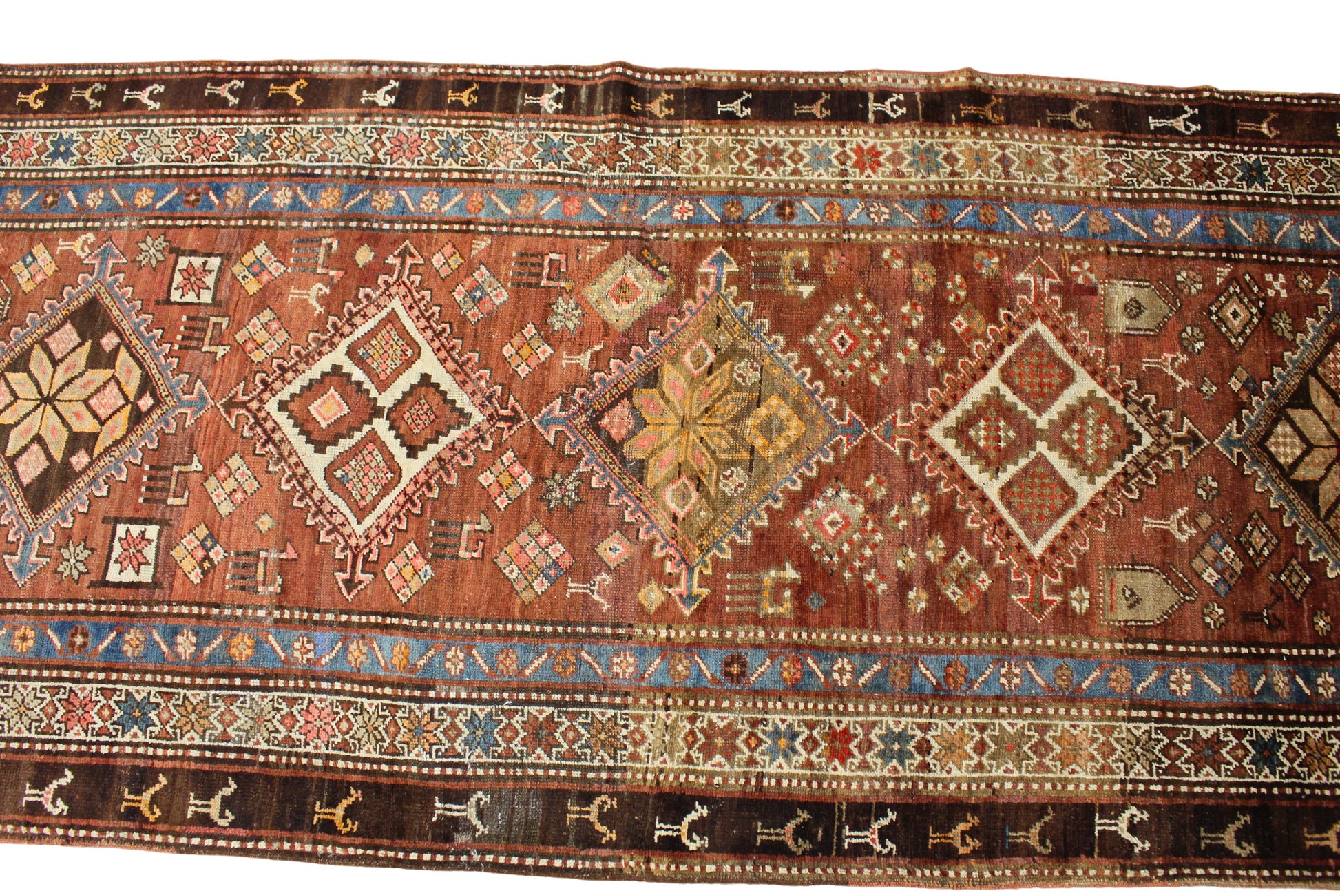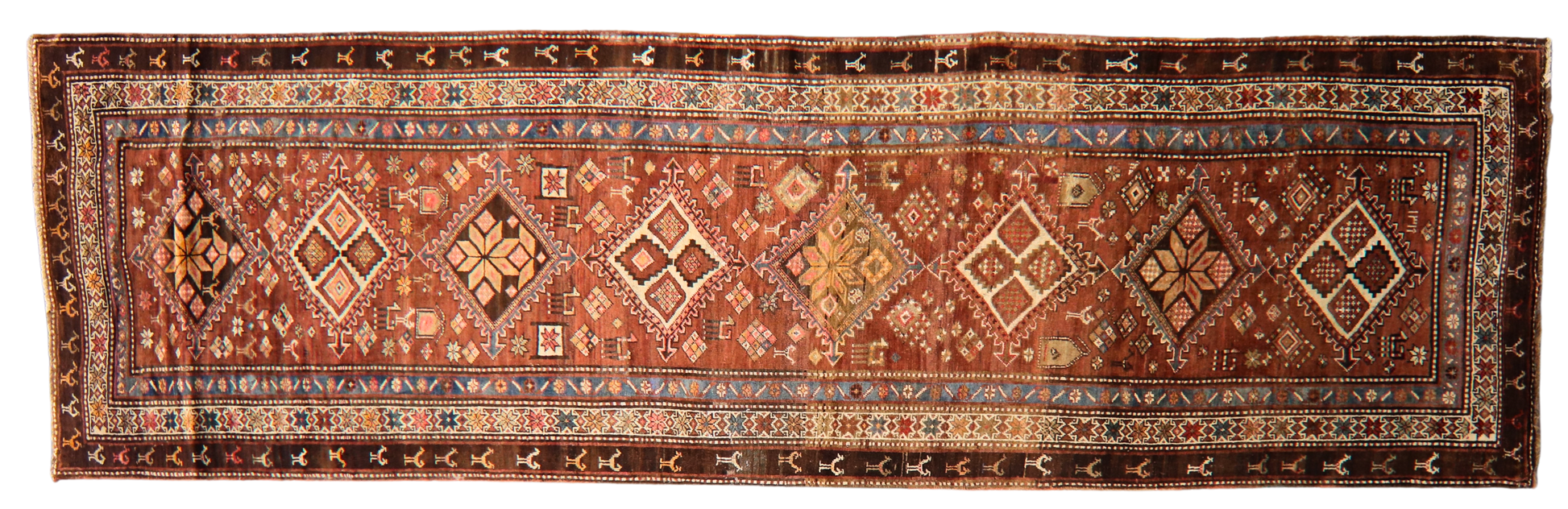 This striking antique Kurdish runner (4.4 × 14.4 ft) tells a visual tale through its bold tribal geometry and saturated earthen palette. Hand-knotted with precision, it features a dramatic sequence of diamond medallions, each filled with complex motifs and framed by richly patterned borders. The rusty terracotta field is dotted with symbols — stars, hooks, and animal forms — that echo Kurdish nomadic heritage.