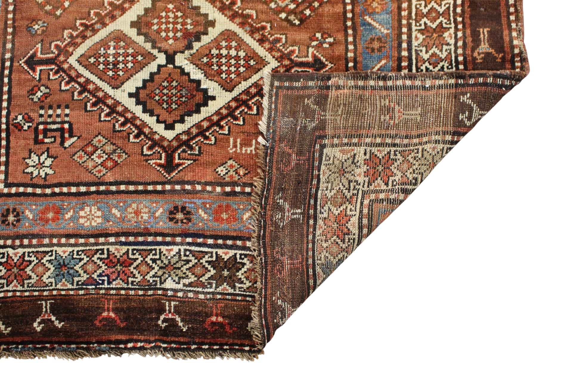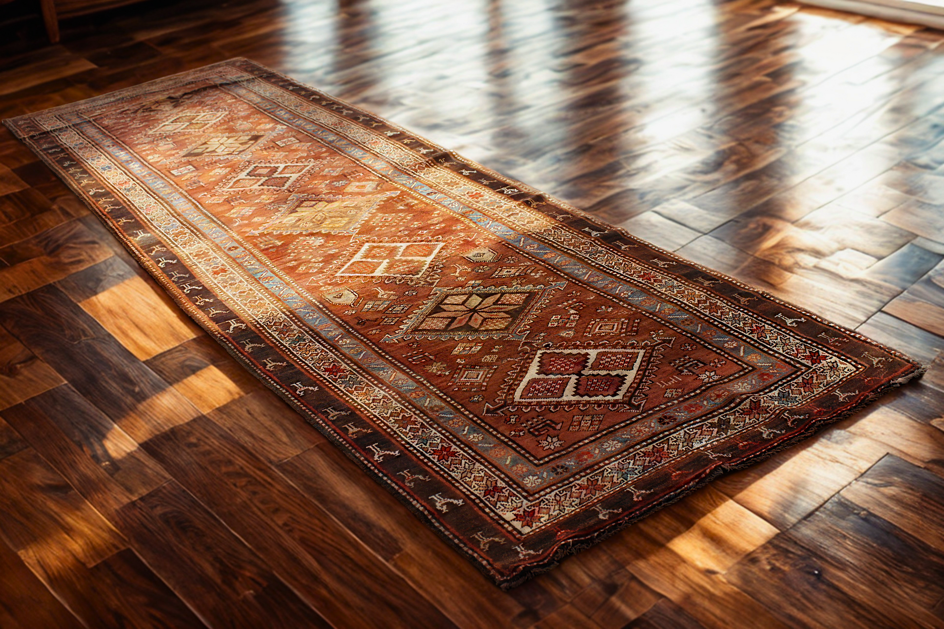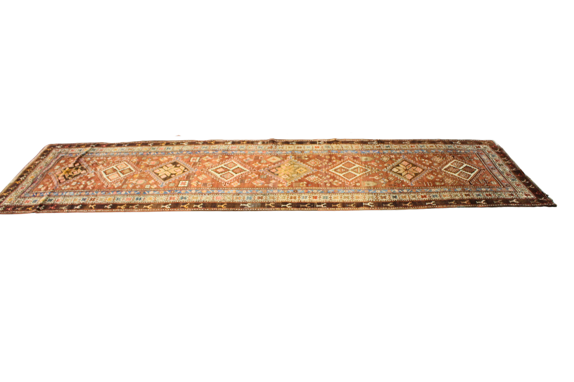 This striking antique Kurdish runner (4.4 × 14.4 ft) tells a visual tale through its bold tribal geometry and saturated earthen palette. Hand-knotted with precision, it features a dramatic sequence of diamond medallions, each filled with complex motifs and framed by richly patterned borders. The rusty terracotta field is dotted with symbols — stars, hooks, and animal forms — that echo Kurdish nomadic heritage.