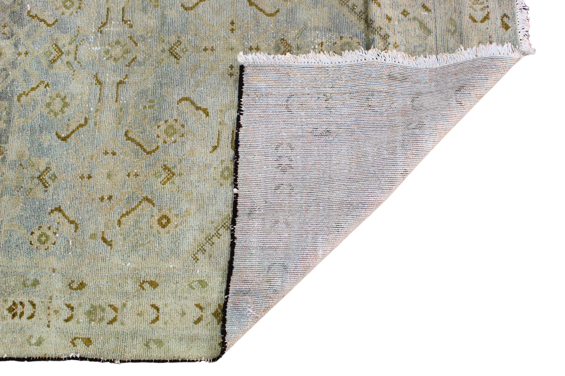 Subtlety meets sophistication in this antique Malayer runner, measuring 4.4 × 13.1 feet. Rendered in a graceful, nearly tonal palette of soft khaki, pale ivory, and hushed olive, this piece features delicate floral latticework and directional medallions that give the rug both balance and flow. The faded nature of the dyes adds an aged patina, enhancing its character and evoking a quiet, enduring elegance.