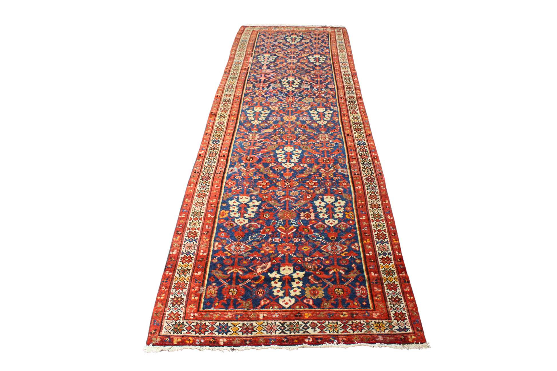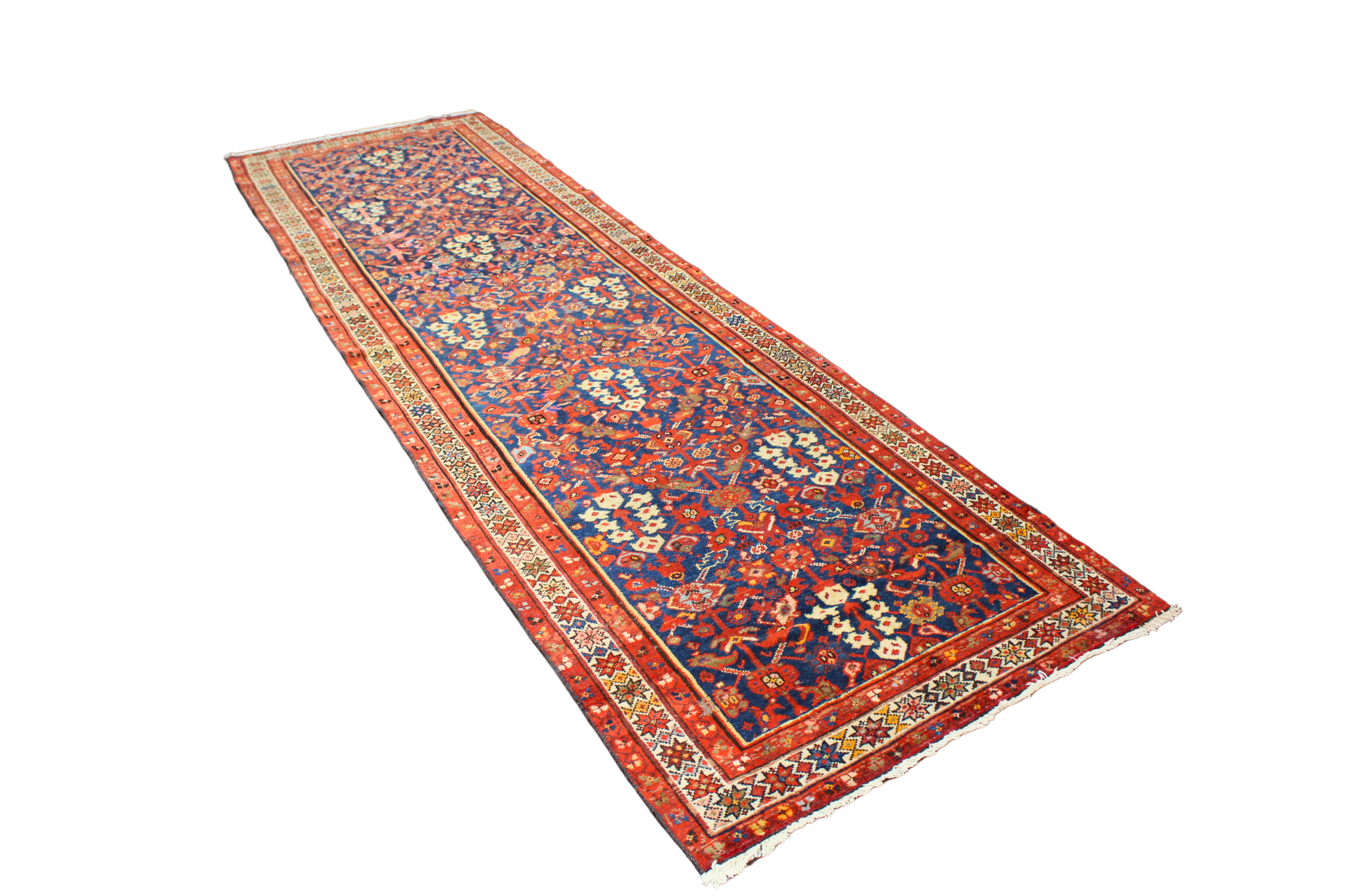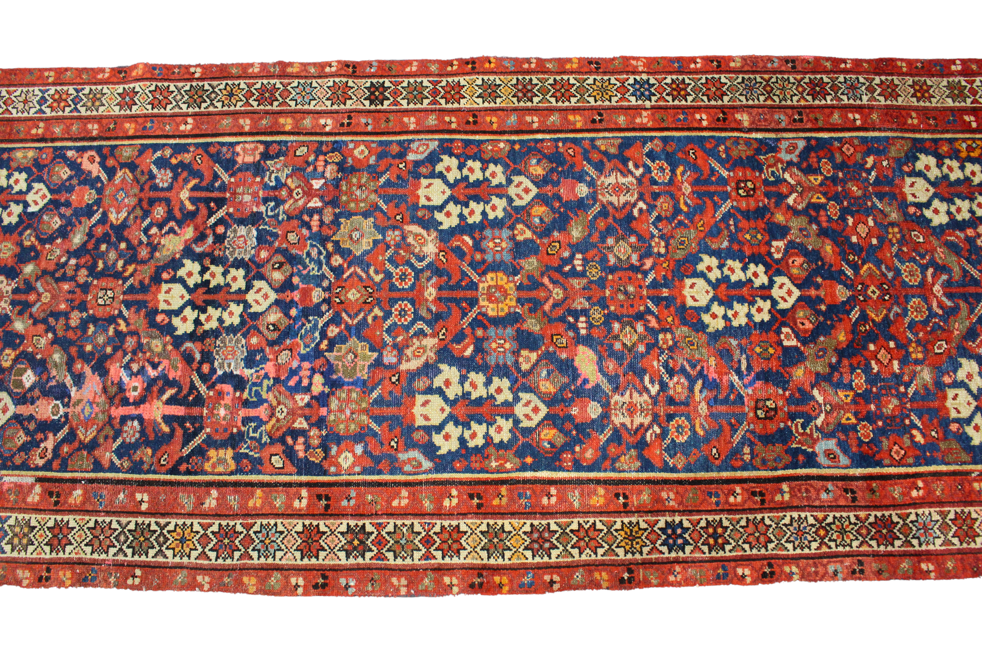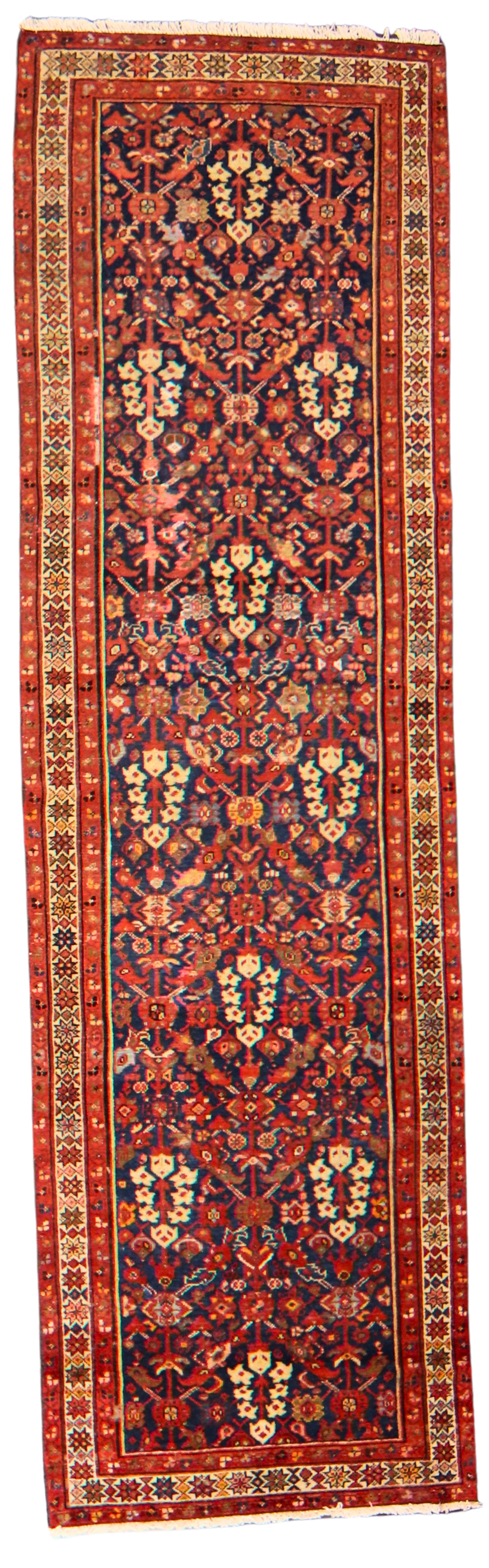 Rich in color and classical village charm, this antique Malayer runner from persian (measuring 3.5 × 11.7 feet) showcases the signature refinement and symmetry that define Malayer weaving traditions. The navy field blossoms with stylized floral sprays growing upward in mirror repetition, accented by angular vines, palmettes, and tribal rosettes. Each motif feels thoughtfully placed, forming a rhythmic procession across the rug’s elongated format.