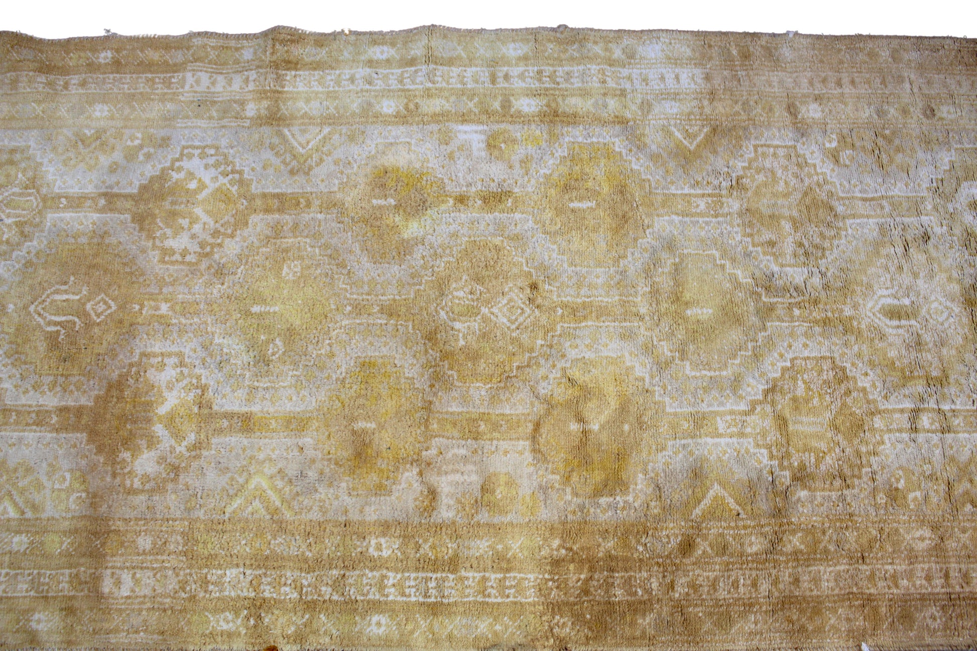 Glowing with a soft, timeworn radiance, this antique Turkish Oushak runner (4.1 × 9.1 ft) bathes the eye in hues of faded gold and ivory. Its geometric medallion pattern, arranged in a linear procession, softly dissolves into the sun-washed wool, hinting at its age and story. The delicate border adds structure without heaviness, keeping the composition light and refined.