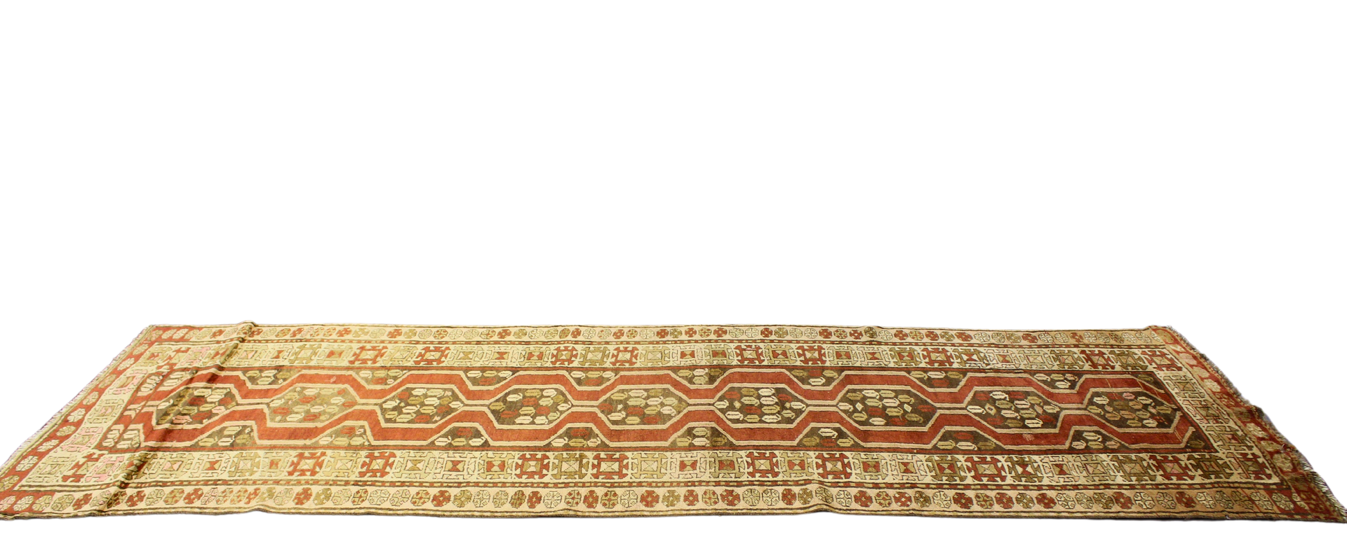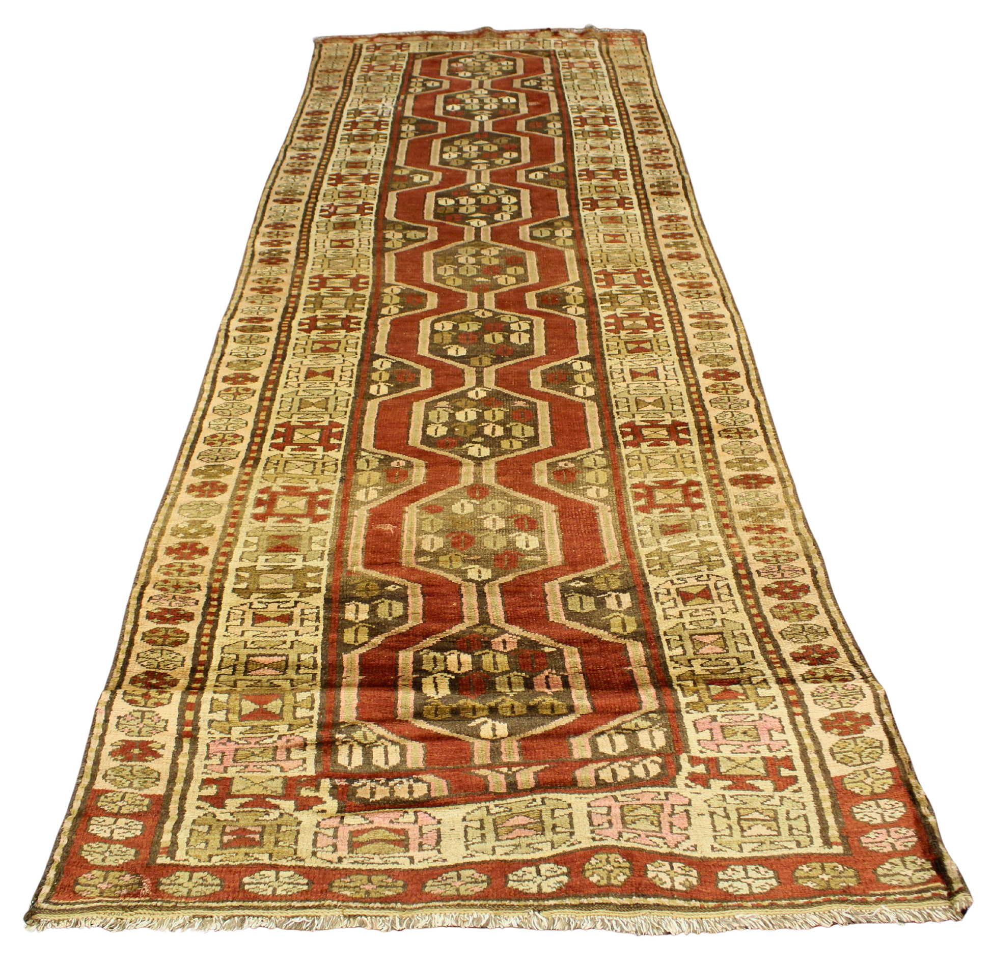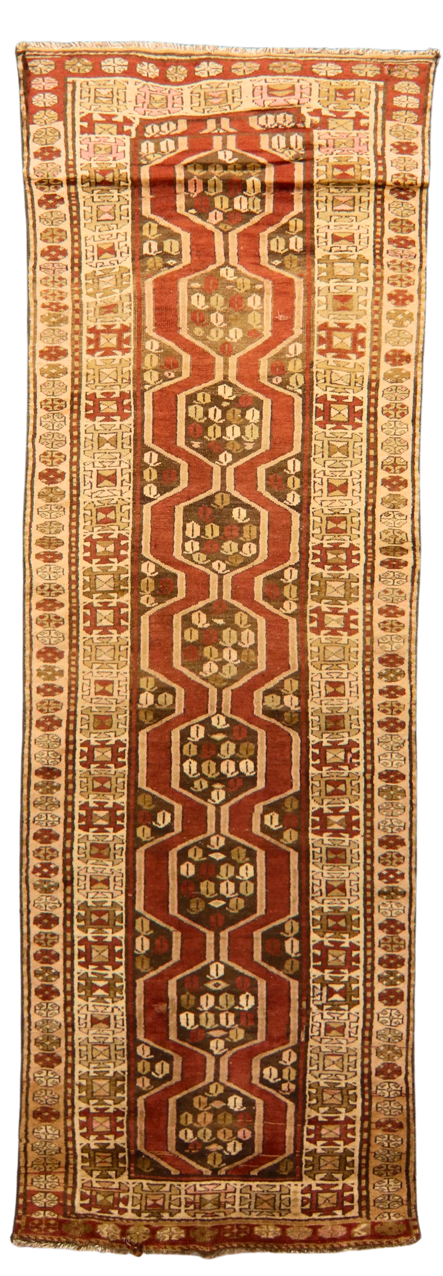 This antique Persian Kurdish runner (4.1 × 12.3 ft) pulses with graphic strength and bold tribal rhythm. The deep terracotta field is segmented by a striking column of octagonal medallions, each filled with abstract dot motifs in soft camel, olive, and ivory — creating a visual cadence that moves effortlessly down the rug’s length. Flanking zigzag motifs enhance the geometric structure and infuse the piece with dynamic motion.