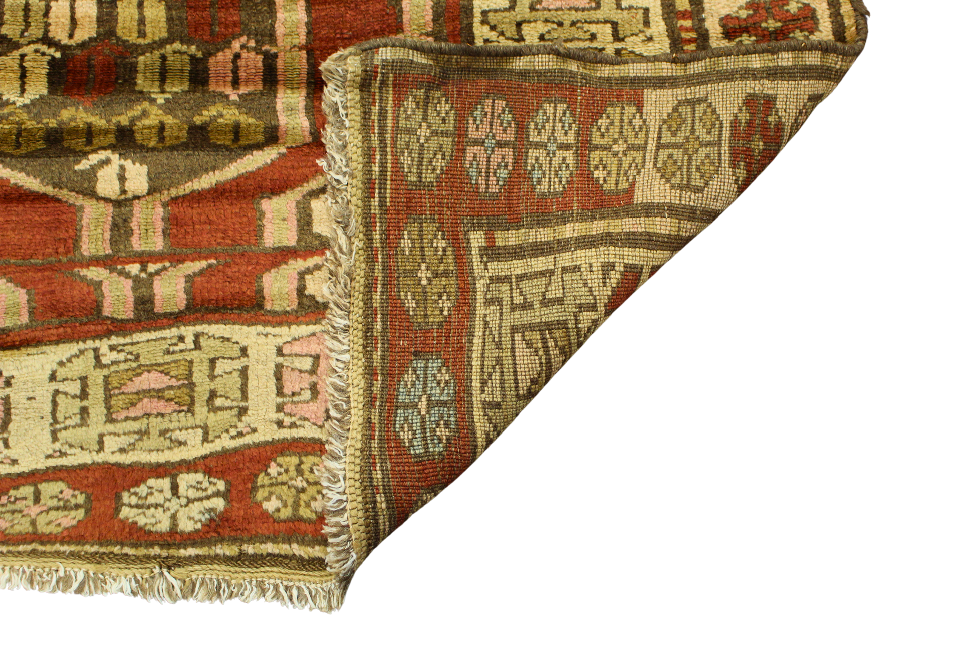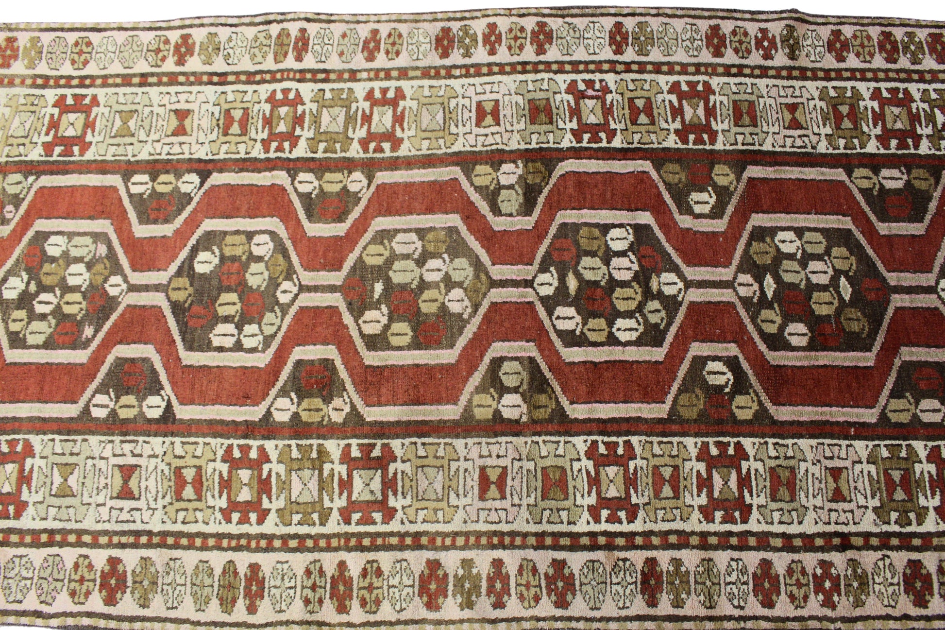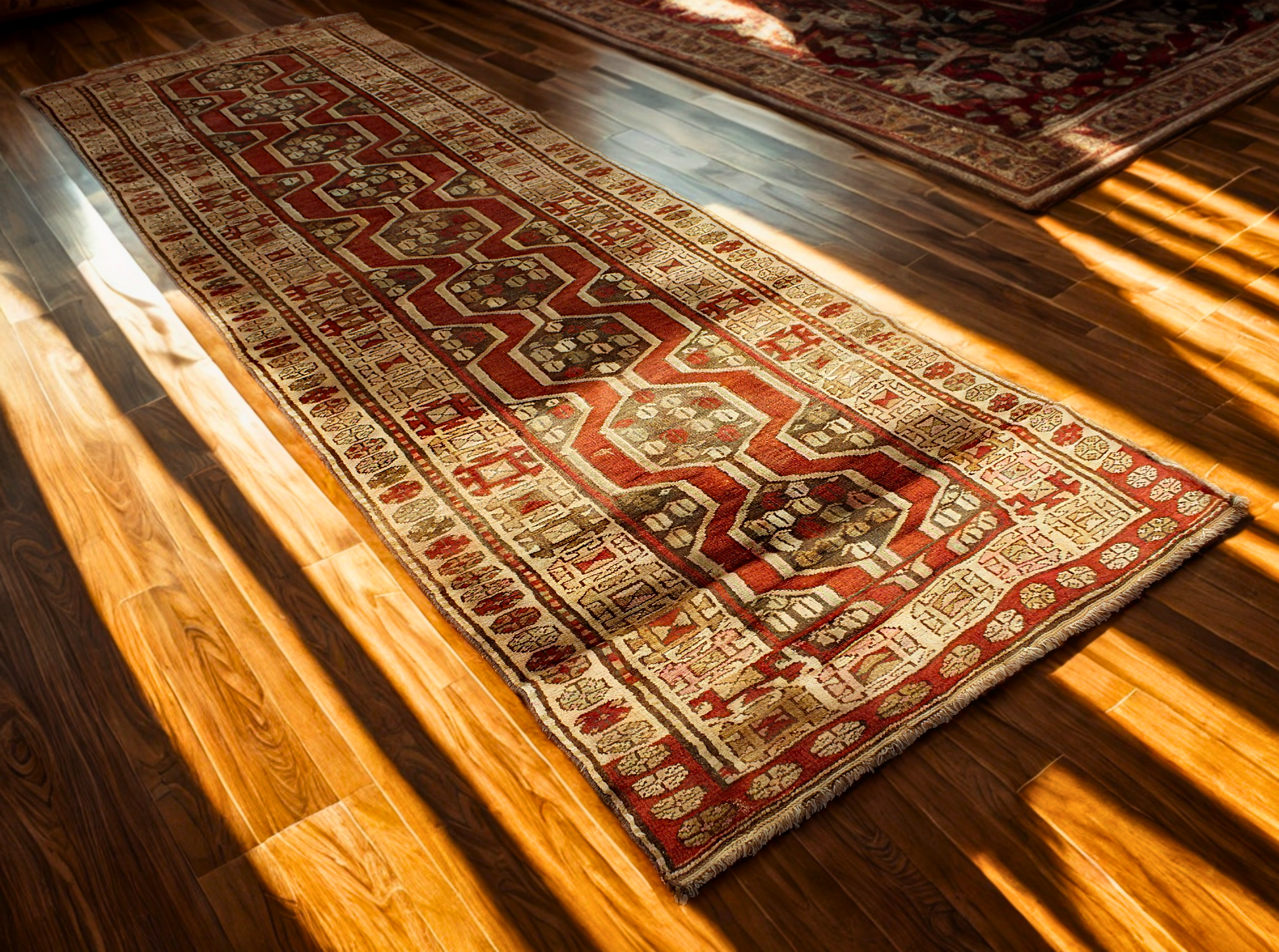 This antique Persian Kurdish runner (4.1 × 12.3 ft) pulses with graphic strength and bold tribal rhythm. The deep terracotta field is segmented by a striking column of octagonal medallions, each filled with abstract dot motifs in soft camel, olive, and ivory — creating a visual cadence that moves effortlessly down the rug’s length. Flanking zigzag motifs enhance the geometric structure and infuse the piece with dynamic motion.