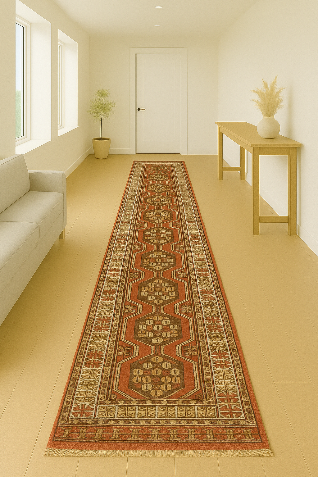 The border is rich in traditional Kurdish symbolism, featuring cruciform motifs and stylized flowers, rendered in an earthy palette that mirrors the central field. This runner’s wide proportions and dramatic tribal energy make it a statement piece in both rustic and contemporary interiors.