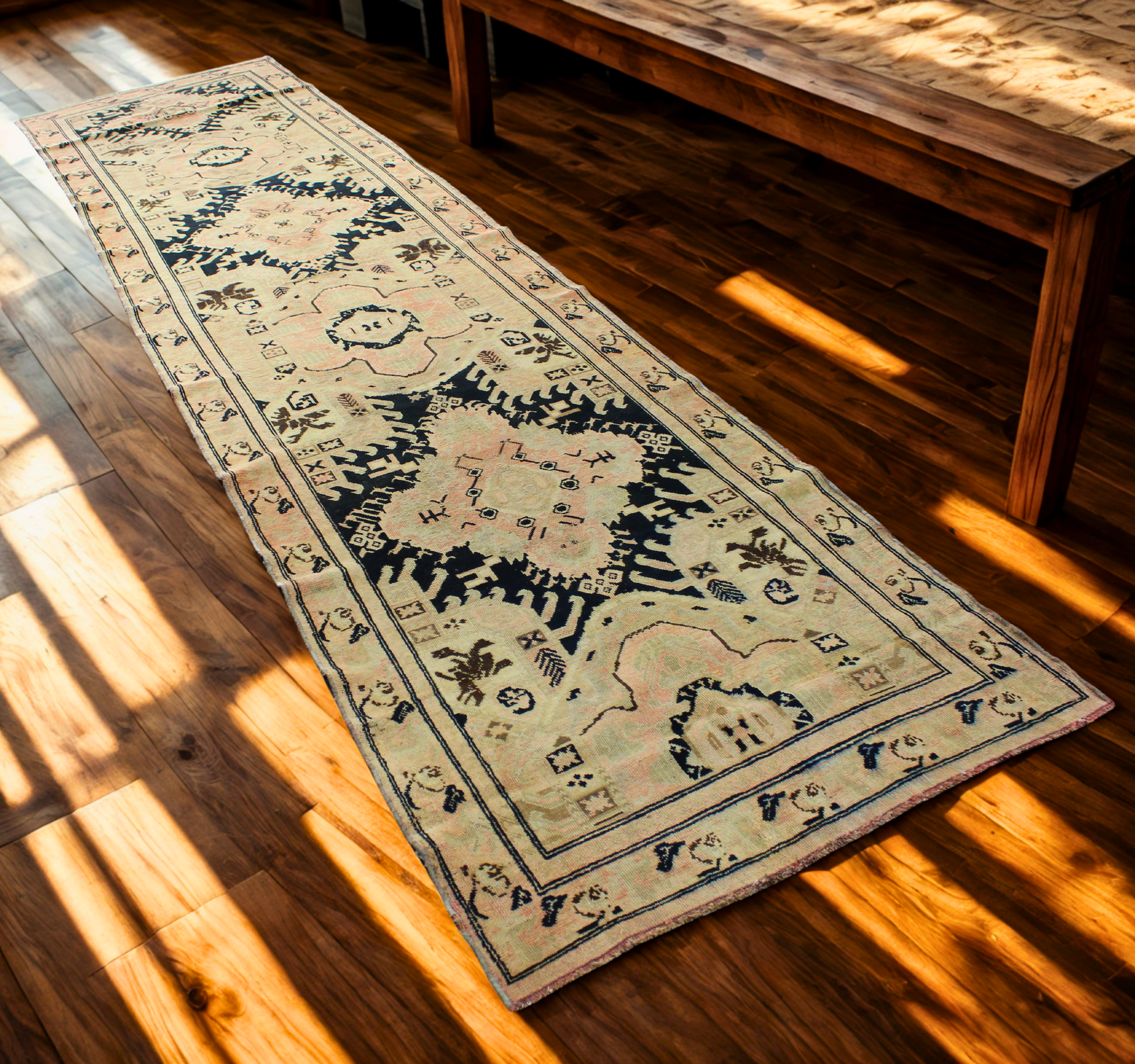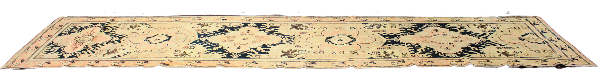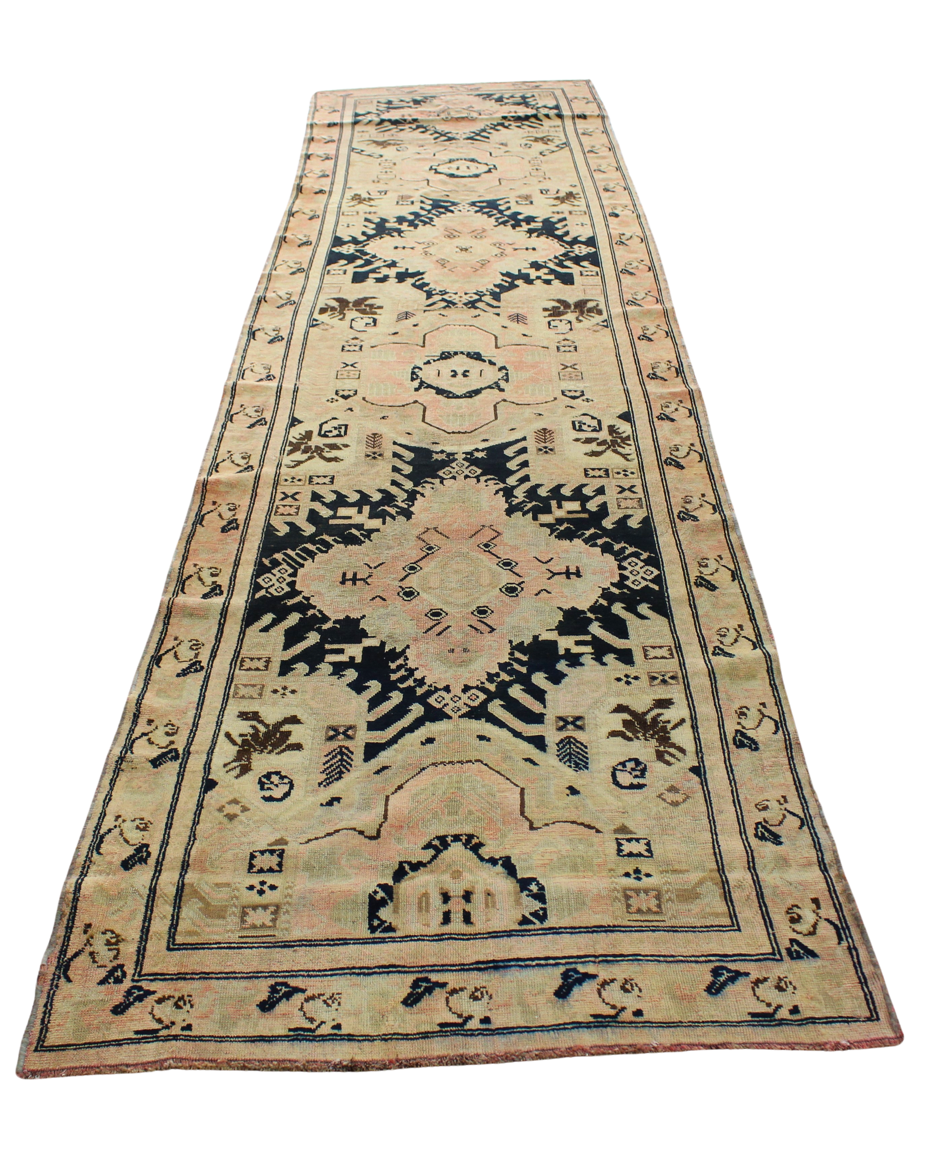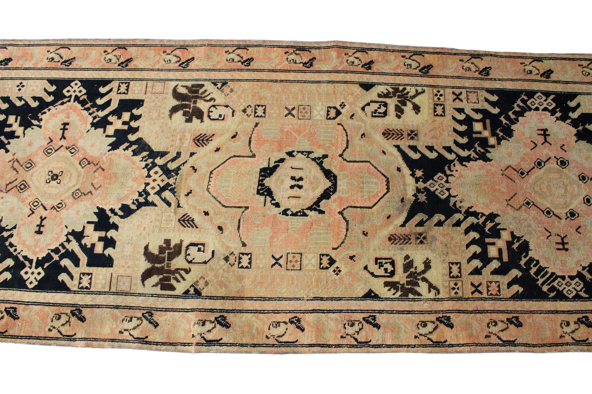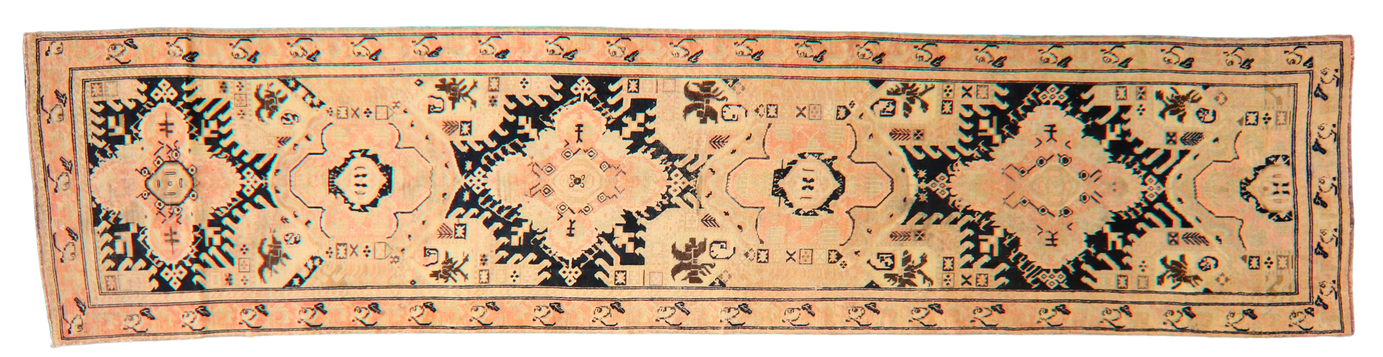 This striking antique Russian runner (3.9 × 15.10 ft) is a bold fusion of symmetry, folklore, and tribal flair. Five large-scale medallions anchor the layout, each rendered in soft peach tones and framed by jagged black and navy elements reminiscent of stylized birds or flames. The background shifts subtly in tone, giving the piece a hand-dyed, painterly texture. Small motifs—ranging from abstract animals to crosshatch symbols—fill the negative space, evoking rural storytelling through weave.