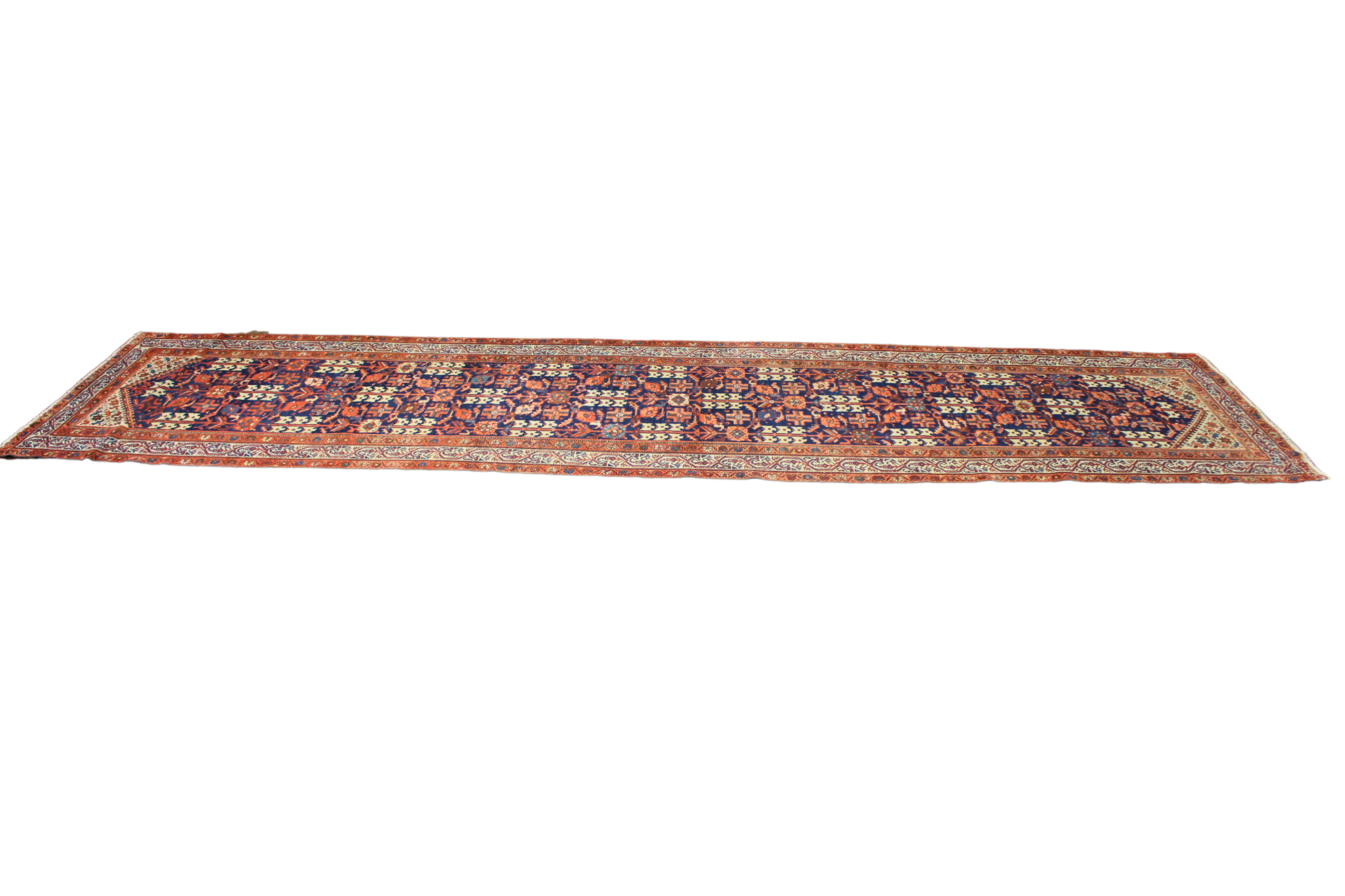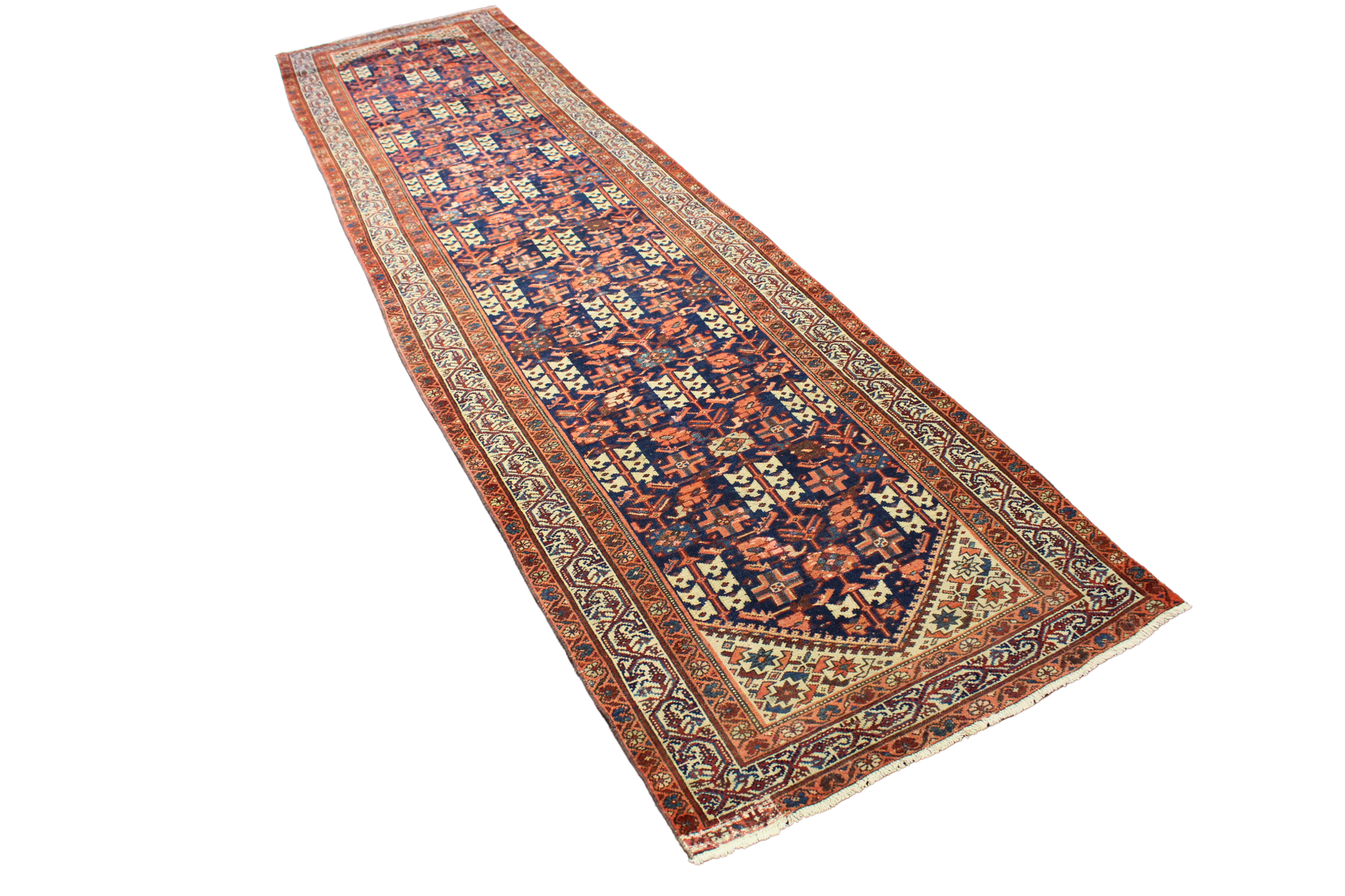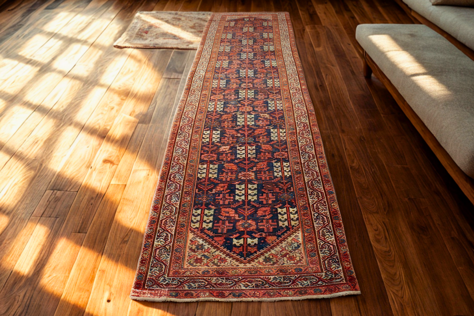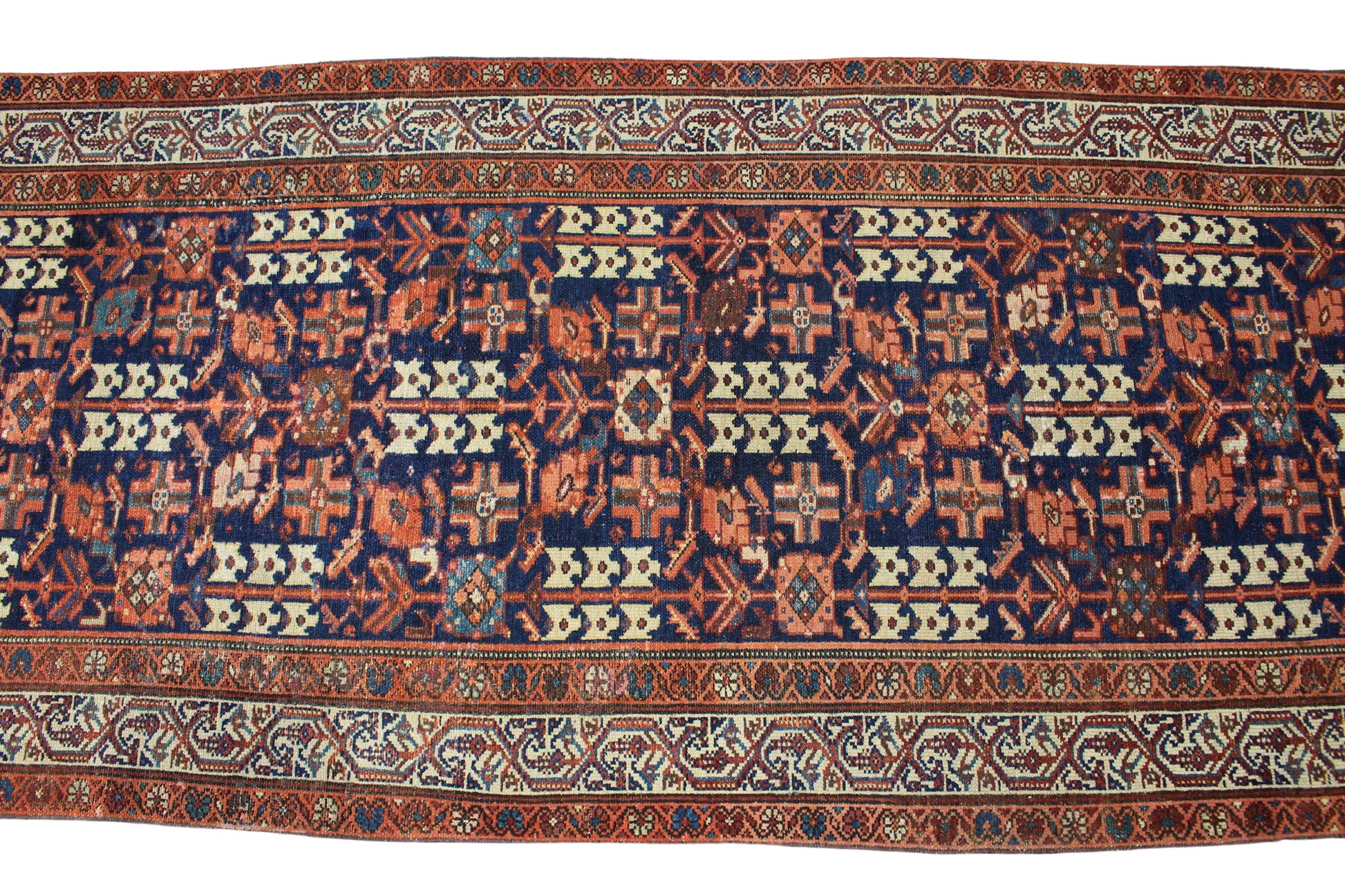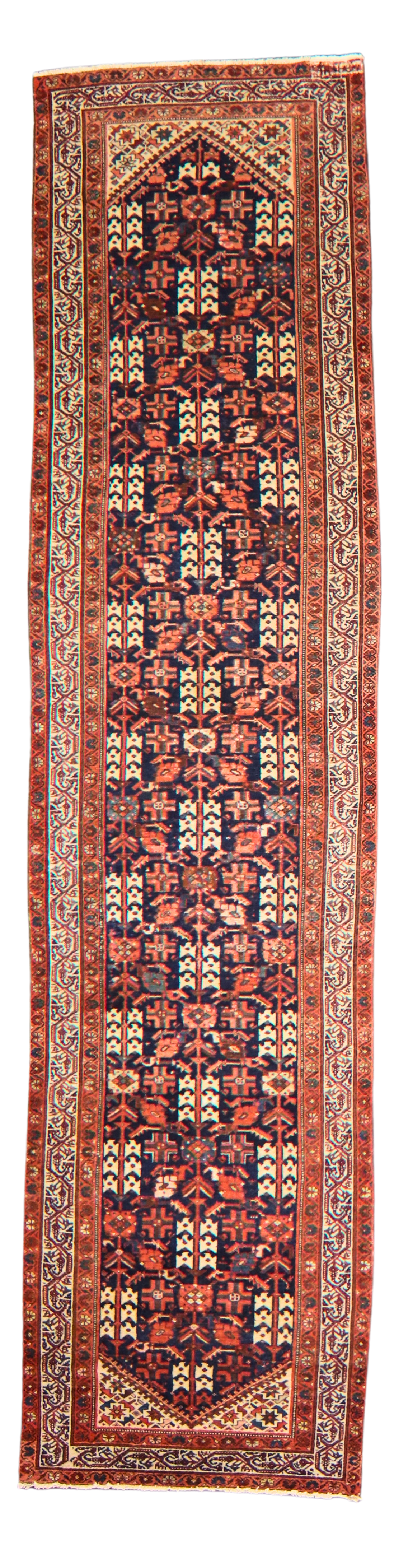 This antique Malayer runner from persian (3.4 × 13.5 ft) offers a bold and architectural display of tribal artistry. Its narrow field is structured by stacked vertical medallions — tree-like motifs with angular branches and central blossoms — marching with precision down a deep navy ground. These forms alternate in brick red and ivory, creating a rhythmic contrast that brings the composition to life.