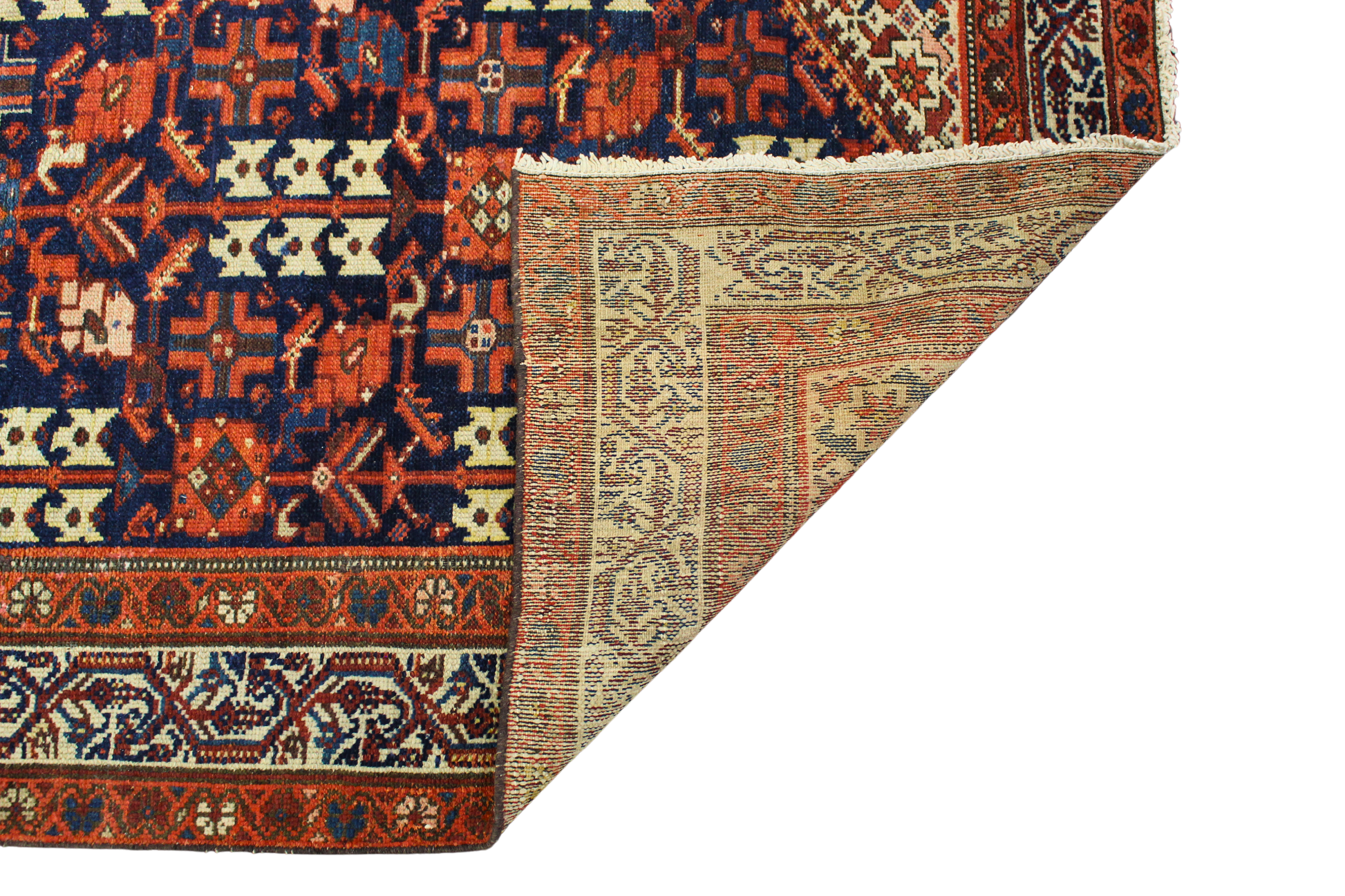 At each end, stepped ivory spandrels filled with eight-pointed stars and geometric rosettes frame the piece with balance and elegance. The borders are richly layered: a rust outer band with curled boteh-like shapes and a crisp ivory inner guard that provides structure. The tightly packed motifs, angular vinework, and balanced symmetry reflect the Malayer weaving tradition’s love for both form and detail.