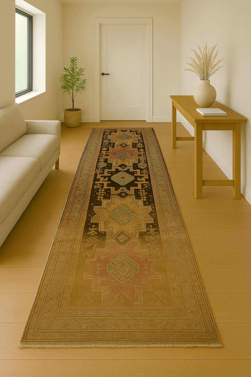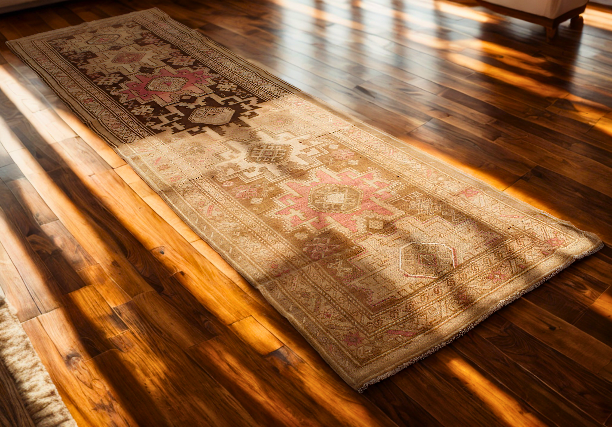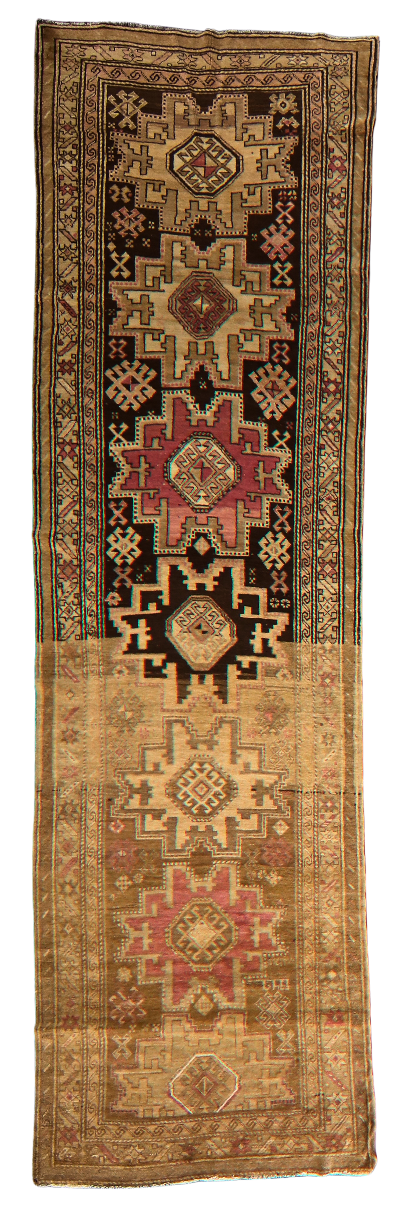 Expressive and robust, this antique Persian Kurdish runner (3.10 × 13.3 ft) is steeped in tribal symbolism and raw beauty. Its field is punctuated by a dynamic sequence of large, latch-hooked medallions in coral, camel, and ivory — set against a dramatic chocolate brown ground that gives the upper section a commanding presence. The lower half has faded into soft golden browns, a testament to time and age, adding a soulful duality to the piece.